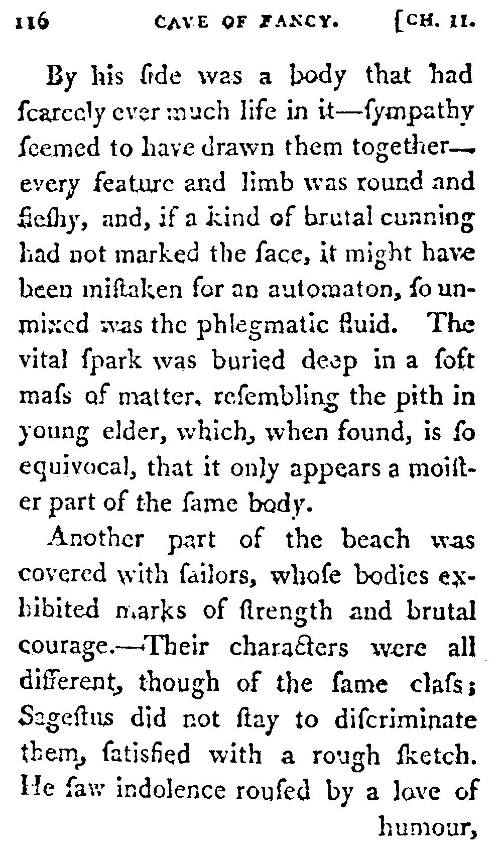 [116] By his ſide was a body that had ſcarcely ever much life in it—ſympathy ſeemed to have drawn them together—every feature and limb was round and fleſhy, and, if a kind of brutal cunning had not marked the face, it might have been miſtaken for an automaton, ſo unmixed was the phlegmatic fluid. The vital ſpark was buried deep in a ſoft maſs of matter, reſembling the pith in young elder, which, when found, is ſo equivocal, that it only appears a moiſter part of the ſame body.