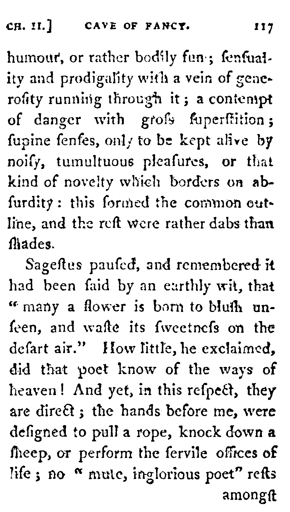 Sageſtus pauſed, and remembered it had been ſaid by an earthly wit, that "many a flower is born to bluſh unſeen, and waſte its ſweetneſs on the deſart air." How little, he exclaimed, did that poet know of the ways of heaven! And yet, in this reſpect, they are direct; the hands before me, were deſigned to pull a rope, knock down a ſheep, or perform the ſervile offices of life; no "mute, inglorious poet" reſts[118] amongſt them, and he who is ſuperior to his fellow, does not riſe above mediocrity. The genius that ſprouts from a dunghil ſoon ſhakes off the heterogenous maſs; thoſe only grovel, who have not power to fly.
