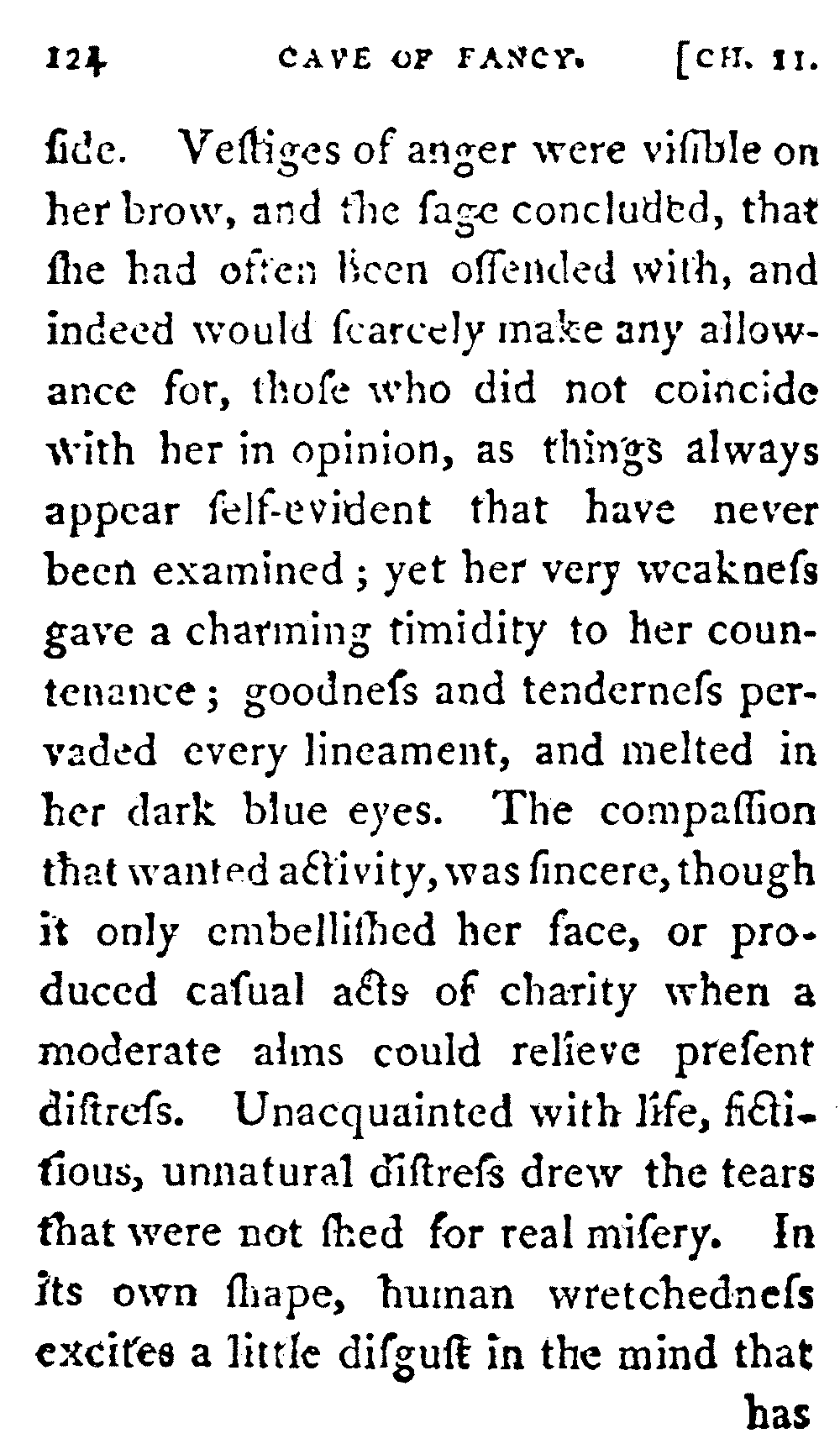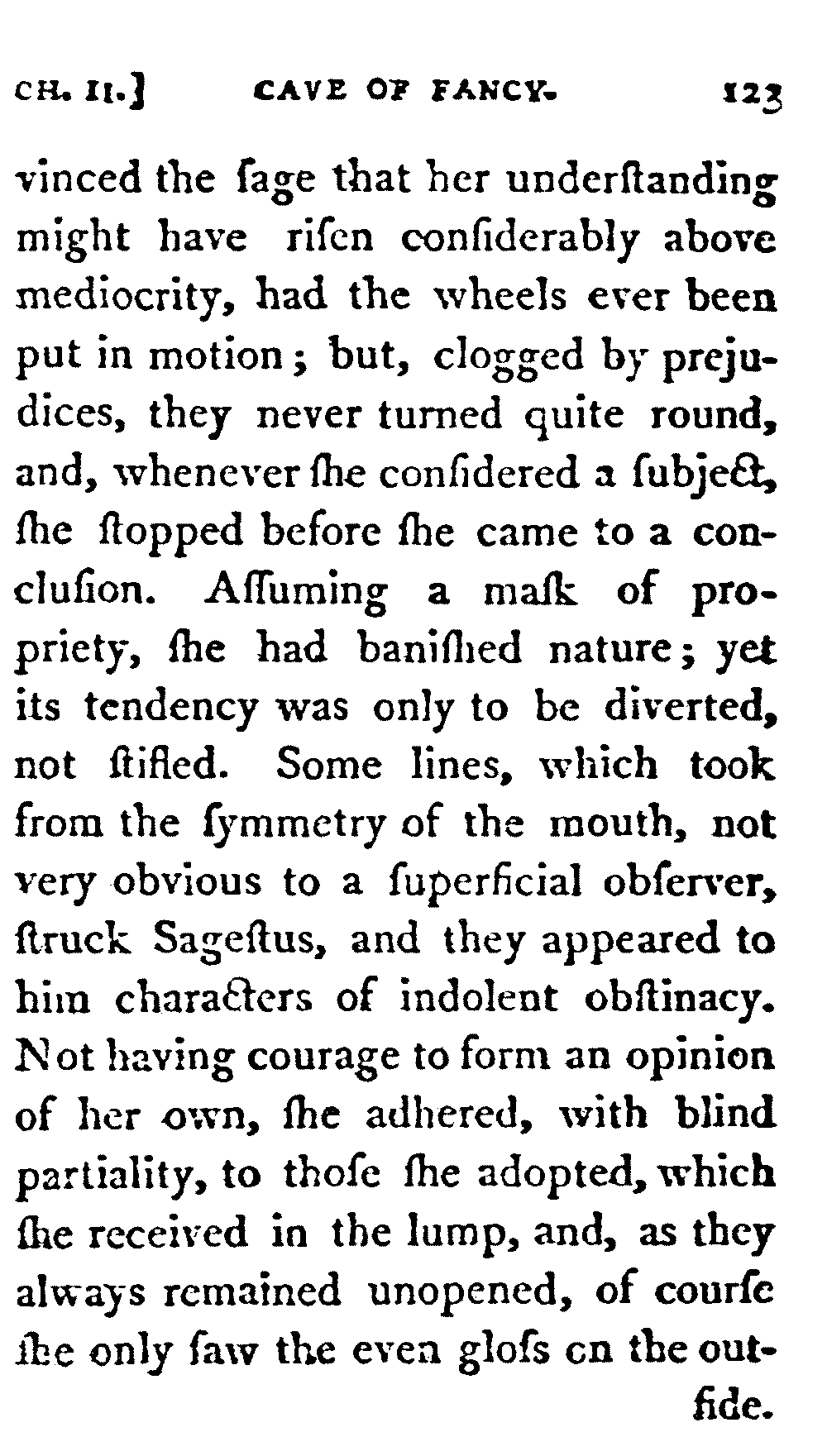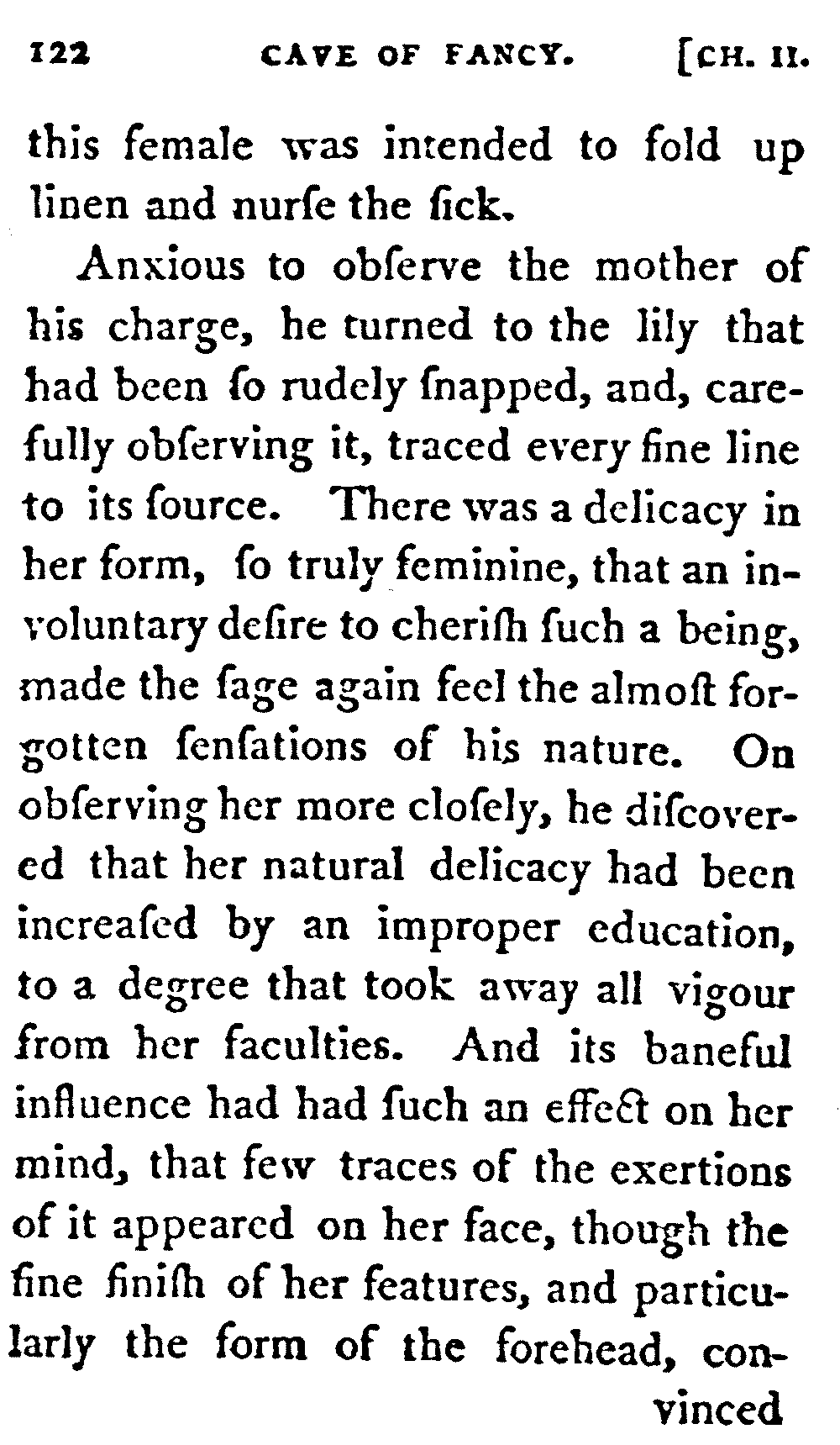 Anxious to obſerve the mother of his charge, he turned to the lily that had been ſo rudely ſnapped, and, carefully obſerving it, traced every fine line to its ſource. There was a delicacy in her form, ſo truly feminine, that an involuntary deſire to cheriſh ſuch a being, made the ſage again feel the almoſt forgotten ſenſations of his nature. On obſerving her more cloſely, he diſcovered that her natural delicacy had been increaſed by an improper education, to a degree that took away all vigour from her faculties. And its baneful influence had had ſuch an effect on her mind, that few traces of the exertions of it appeared on her face, though the fine finiſh of her features, and particularly the form of the forehead, con[123]vinced the ſage that her underſtanding might have riſen conſiderably above mediocrity, had the wheels ever been put in motion; but, clogged by prejudices, they never turned quite round, and, whenever ſhe conſidered a ſubject, ſhe ſtopped before ſhe came to a concluſion. Aſſuming a maſk of propriety, ſhe had baniſhed nature; yet its tendency was only to be diverted, not ſtifled. Some lines, which took from the ſymmetry of the mouth, not very obvious to a ſuperficial obſerver, ſtruck Sageſtus, and they appeared to him characters of indolent obſtinacy. Not having courage to form an opinion of her own, ſhe adhered, with blind partiality, to thoſe ſhe adopted, which ſhe received in the lump, and, as they always remained unopened, of courſe ſhe only ſaw the even gloſs on the out[124]ſide. Veſtiges of anger were viſible on her brow, and the ſage concluded, that ſhe had often been offended with, and indeed would ſcarcely make any allowance for, thoſe who did not coincide with her in opinion, as things always appear ſelf-evident that have never been examined; yet her very weakneſs gave a charming timidity to her countenance; goodneſs and tenderneſs pervaded every lineament, and melted in her dark blue eyes. The compaſſion that wanted activity, was ſincere, though it only embelliſhed her face, or produced caſual acts of charity when a moderate alms could relieve preſent diſtreſs. Unacquainted with life, fictitious, unnatural diſtreſs drew the tears that were not ſhed for real miſery. In its own ſhape, human wretchedneſs excites a little diſguſt in the mind that[125] has indulged ſickly refinement. Perhaps the ſage gave way to a little conjecture in drawing the laſt concluſion; but his conjectures generally aroſe from diſtinct ideas, and a dawn of light allowed him to ſee a great way farther than common mortals.