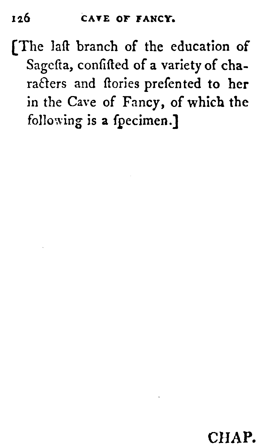 [126] [The laſt branch of the education of Sageſta, conſiſted of a variety of characters and ſtories preſented to her in the Cave of Fancy, of which the following is a ſpecimen.]