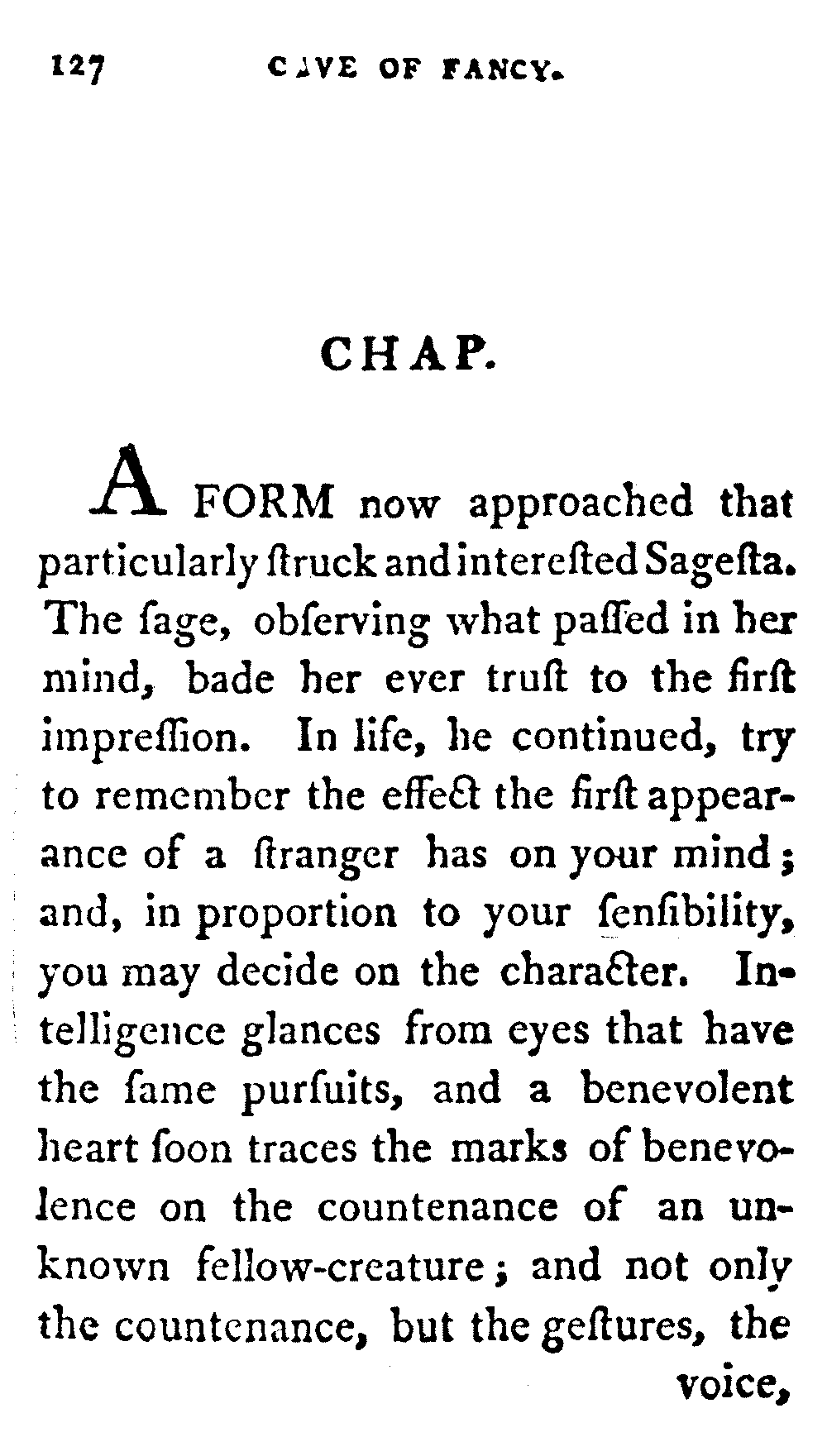 A form now approached that particularly ſtruck and intereſted Sageſta. The ſage, obſerving what paſſed in her mind, bade her ever truſt to the firſt impreſſion. In life, he continued, try to remember the effect the firſt appearance of a ſtranger has on your mind; and, in proportion to your ſenſibility, you may decide on the character. Intelligence glances from eyes that have the ſame purſuits, and a benevolent heart ſoon traces the marks of benevolence on the countenance of an unknown fellow-creature; and not only the countenance, but the geſtures, the[128] voice, loudly ſpeak truth to the unprejudiced mind.