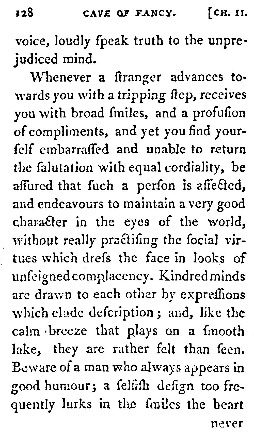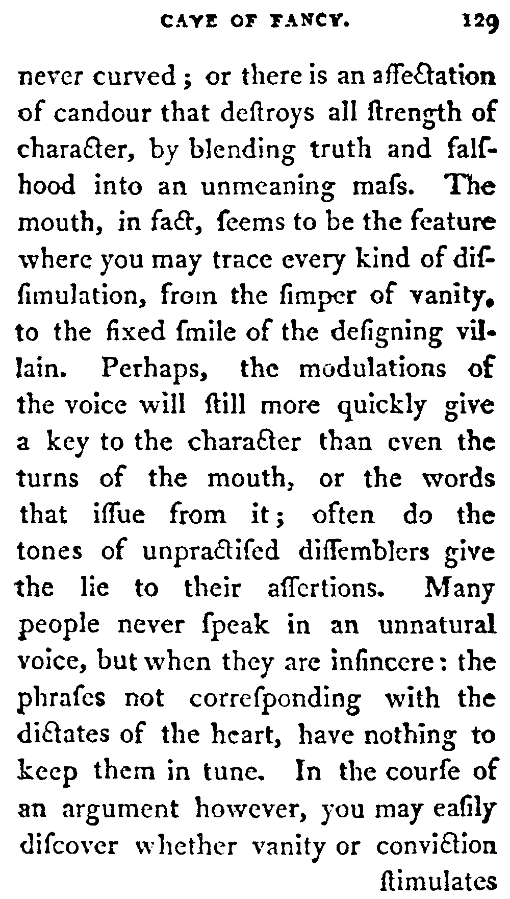 Whenever a ſtranger advances towards you with a tripping ſtep, receives you with broad ſmiles, and a profuſion of compliments, and yet you find yourſelf embarraſſed and unable to return the ſalutation with equal cordiality, be aſſured that ſuch a perſon is affected, and endeavours to maintain a very good character in the eyes of the world, without really practiſing the ſocial virtues which dreſs the face in looks of unfeigned complacency. Kindred minds are drawn to each other by expreſſions which elude deſcription; and, like the calm breeze that plays on a ſmooth lake, they are rather felt than ſeen. Beware of a man who always appears in good humour; a ſelfiſh deſign too frequently lurks in the ſmiles the heart[129] never curved; or there is an affectation of candour that deſtroys all ſtrength of character, by blending truth and falſhood into an unmeaning maſs. The mouth, in fact, ſeems to be the feature where you may trace every kind of diſſimulation, from the ſimper of vanity, to the fixed ſmile of the deſigning villain. Perhaps, the modulations of the voice will ſtill more quickly give a key to the character than even the turns of the mouth, or the words that iſſue from it; often do the tones of unpractiſed diſſemblers give the lie to their aſſertions. Many people never ſpeak in an unnatural voice, but when they are inſincere: the phraſes not correſponding with the dictates of the heart, have nothing to keep them in tune. In the courſe of an argument however, you may eaſily diſcover whether vanity or conviction[130] ſtimulates the diſputant, though his inflated countenance may be turned from you, and you may not ſee the geſtures which mark ſelf-ſufficiency. He ſtopped, and the ſpirit began.
