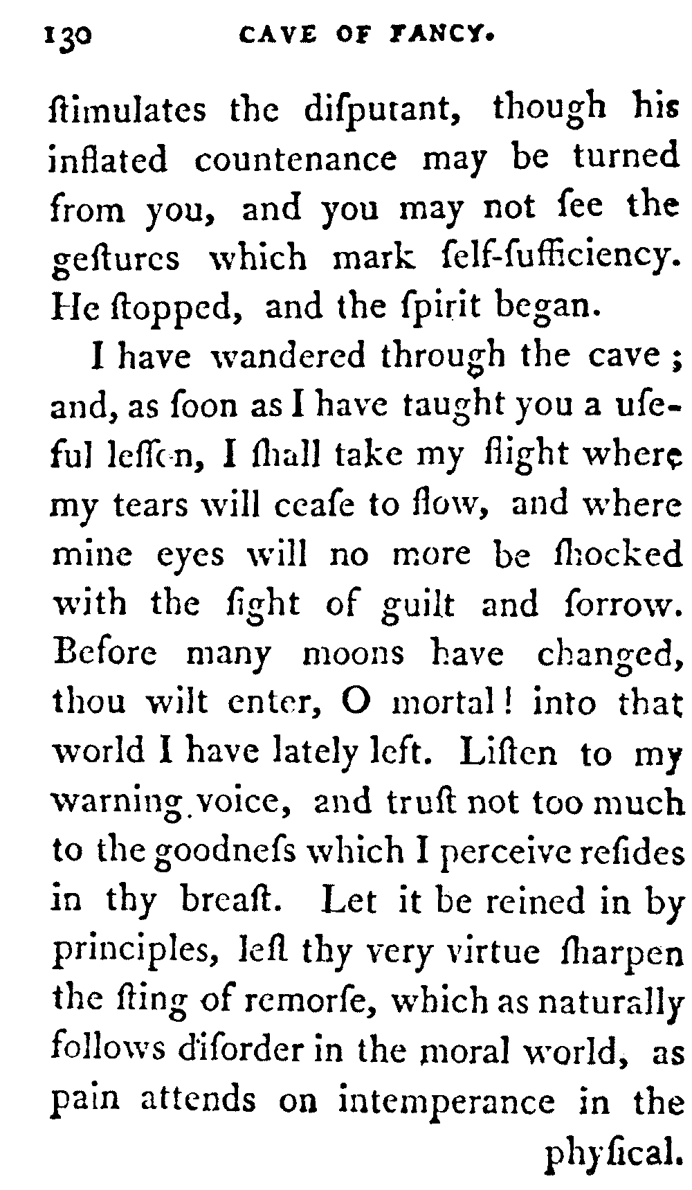 I have wandered through the cave; and, as ſoon as I have taught you a uſeful leſſon, I ſhall take my flight where my tears will ceaſe to flow, and where mine eyes will no more be ſhocked with the ſight of guilt and ſorrow. Before many moons have changed, thou wilt enter, O mortal! into that world I have lately left. Liſten to my warning voice, and truſt not too much to the goodneſs which I perceive reſides in thy breaſt. Let it be reined in by principles, leſt thy very virtue ſharpen the ſting of remorſe, which as naturally follows diſorder in the moral world, as pain attends on intemperance in the[131] phyſical. But my hiſtory will afford you more inſtruction than mere advice. Sageſtus concurred in opinion with her, obſerving that the ſenſes of children ſhould be the firſt object of improvement; then their paſſions worked on; and judgment the fruit, muſt be the acquirement of the being itſelf, when out of leading-ſtrings. The ſpirit bowed aſſent, and, without any further prelude, entered on her hiſtory.