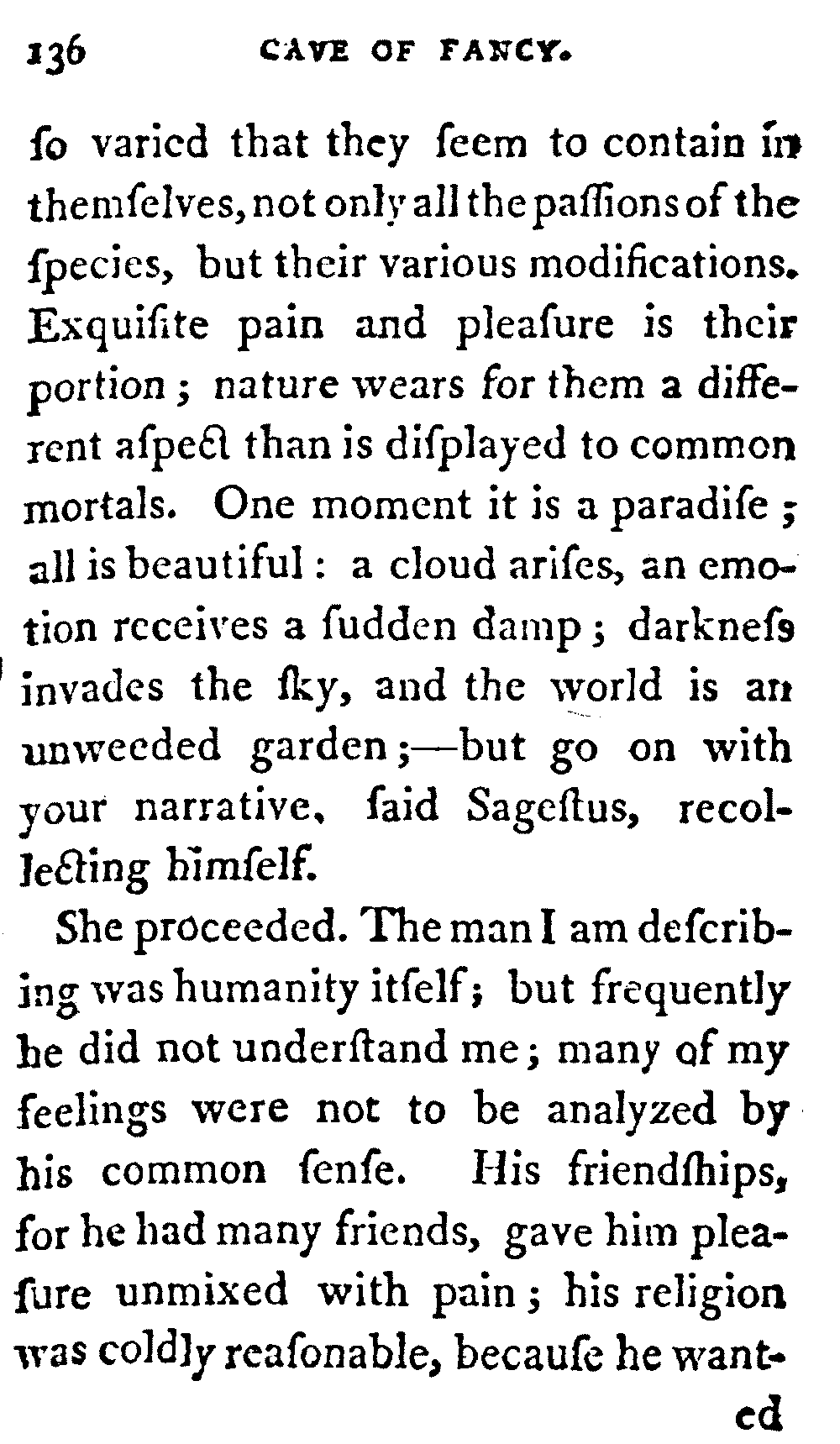To give the ſhorteſt definition of ſenſibility, replied the ſage, I ſhould ſay that it is the reſult of acute ſenſes, finely faſhioned nerves, which vibrate at the ſlighteſt touch, and convey ſuch clear intelligence to the brain, that it does not require to be arranged by the judgment. Such perſons inſtantly enter into the characters of others, and inſtinctively diſcern what will give pain to every human being; their own feelings are[136] ſo varied that they ſeem to contain in themſelves, not only all the paſſions of the ſpecies, but their various modifications. Exquiſite pain and pleaſure is their portion; nature wears for them a different aſpect than is diſplayed to common mortals. One moment it is a paradiſe; all is beautiful: a cloud ariſes, an emotion receives a ſudden damp; darkneſs invades the ſky, and the world is an unweeded garden;—but go on with your narrative, ſaid Sageſtus, recollecting himſelf.