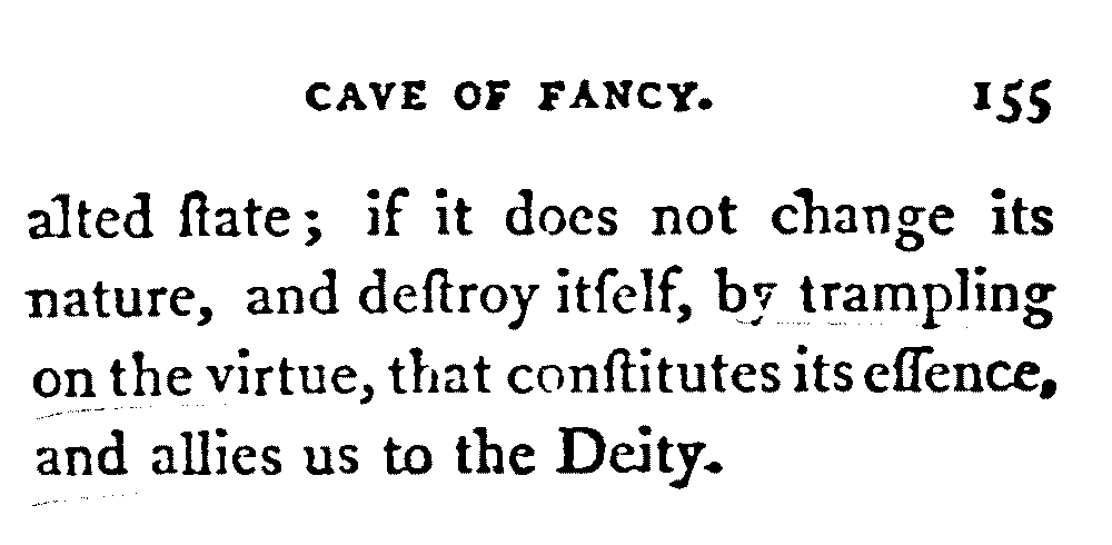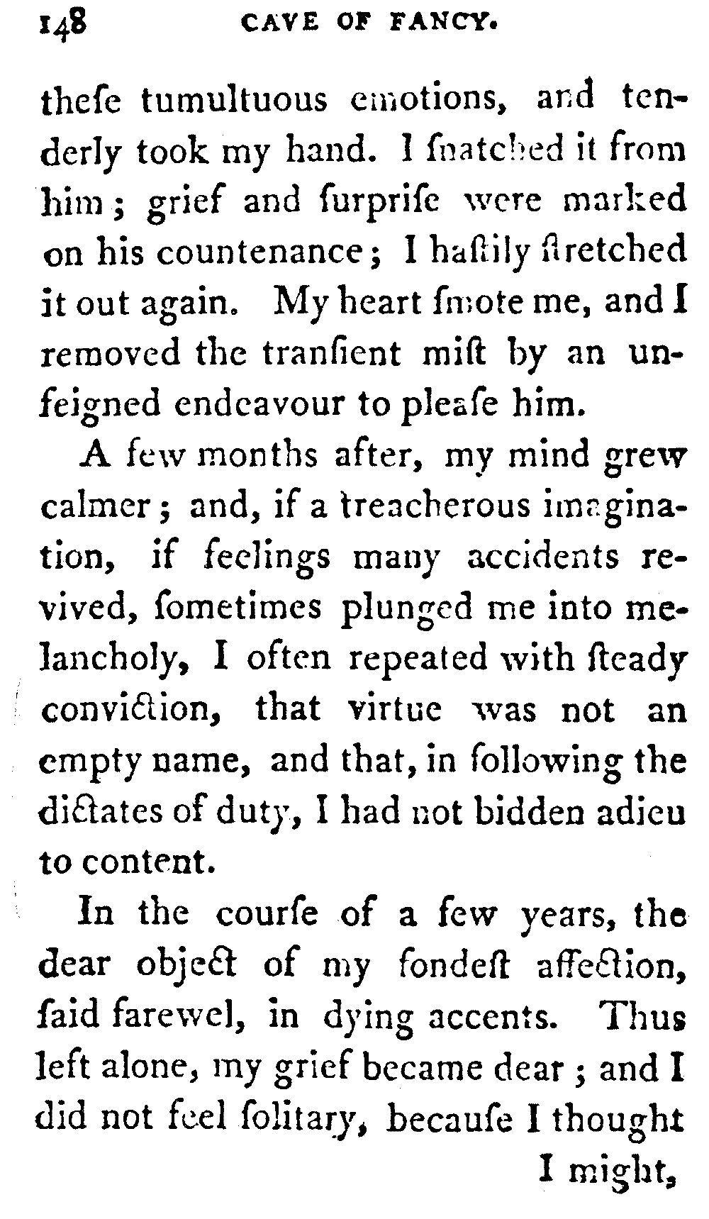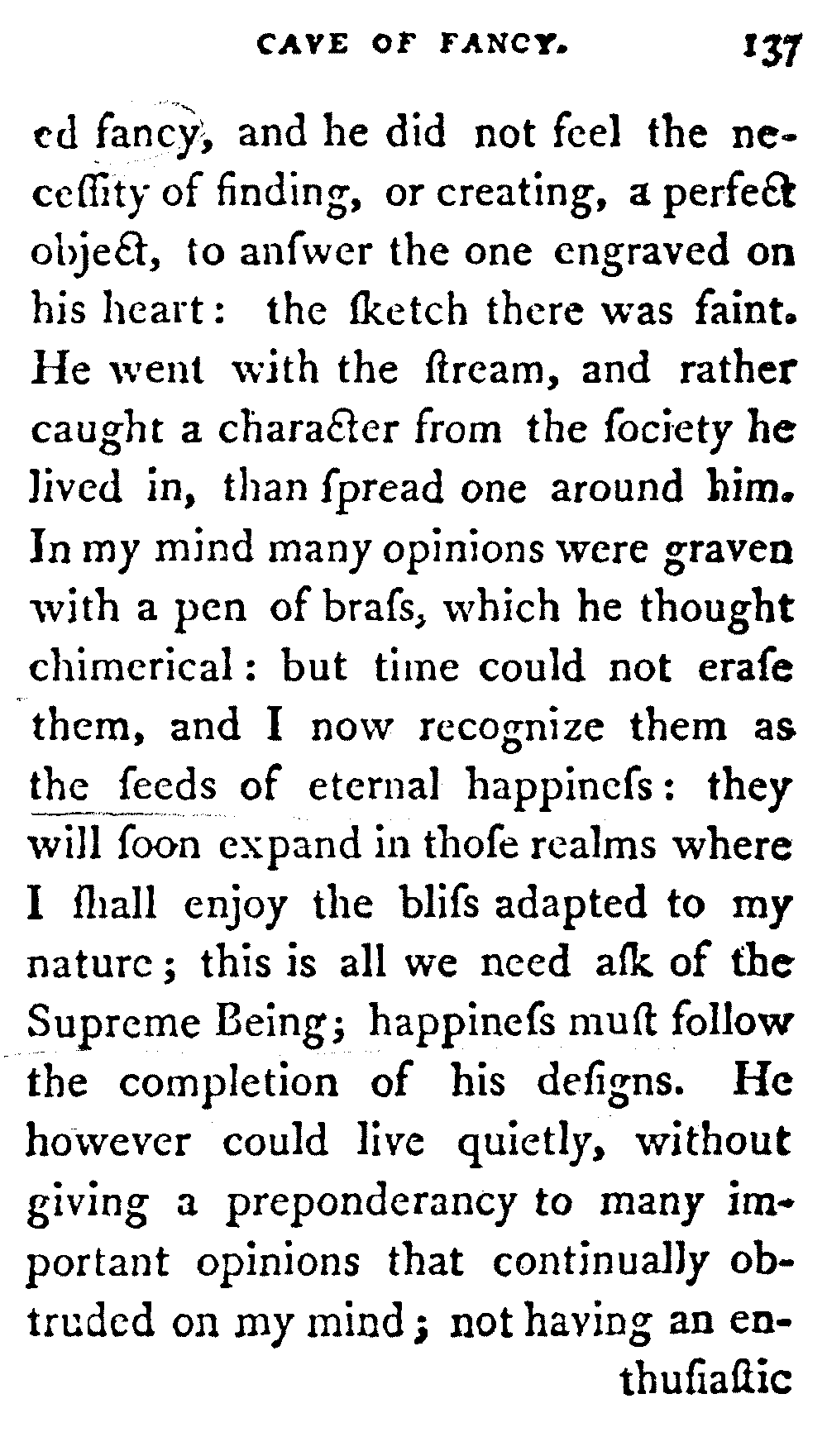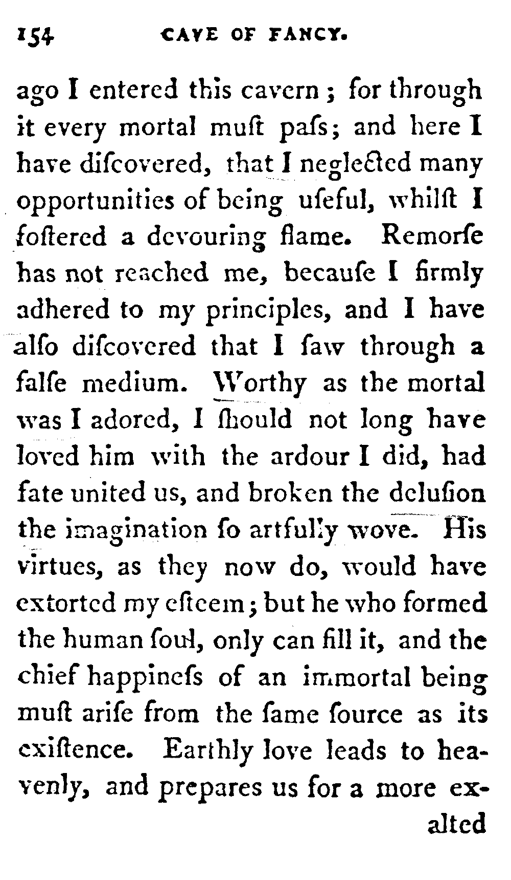 My life was now unmarked by any extraordinary change, and a few days[154] ago I entered this cavern; for through it every mortal muſt paſs; and here I have diſcovered, that I neglected many opportunities of being uſeful, whilſt I foſtered a devouring flame. Remorſe has not reached me, becauſe I firmly adhered to my principles, and I have alſo diſcovered that I ſaw through a falſe medium. Worthy as the mortal was I adored, I ſhould not long have loved him with the ardour I did, had fate united us, and broken the deluſion the imagination ſo artfully wove. His virtues, as they now do, would have extorted my eſteem; but he who formed the human ſoul, only can fill it, and the chief happineſs of an immortal being muſt ariſe from the ſame ſource as its exiſtence. Earthly love leads to heavenly, and prepares us for a more ex[155]alted ſtate; if it does not change its nature, and deſtroy itſelf, by trampling on the virtue, that conſtitutes its eſſence, and allies us to the Deity.
