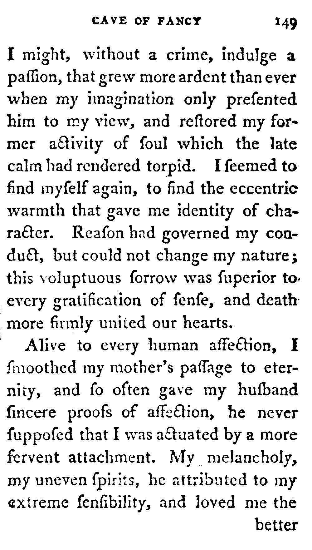 In the courſe of a few years, the dear object of my fondeſt affection, ſaid farewel, in dying accents. Thus left alone, my grief became dear; and I did not feel ſolitary, becauſe I thought[149] I might, without a crime, indulge a paſſion, that grew more ardent than ever when my imagination only preſented him to my view, and reſtored my former activity of ſoul which the late calm had rendered torpid. I ſeemed to find myſelf again, to find the eccentric warmth that gave me identity of character. Reaſon had governed my conduct, but could not change my nature; this voluptuous ſorrow was ſuperior to every gratification of ſenſe, and death more firmly united our hearts.