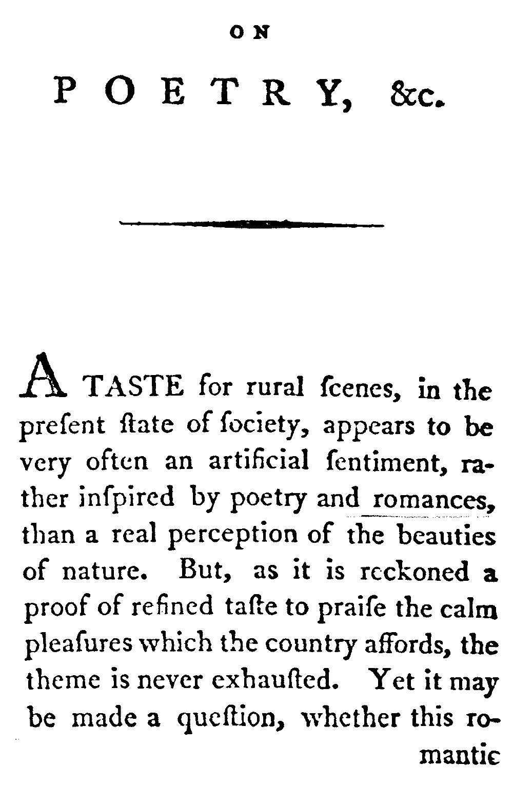 A taſte for rural ſcenes, in the preſent ſtate of ſociety, appears to be very often an artificial ſentiment, rather inſpired by poetry and romances, than a real perception of the beauties of nature. But, as it is reckoned a proof of refined taſte to praiſe the calm pleaſures which the country affords, the theme is never exhauſted. Yet it may be made a queſtion, whether this ro[160]mantic kind of declamation, has much effect on the conduct of thoſe, who leave, for a ſeaſon, the crowded cities in which they were bred.