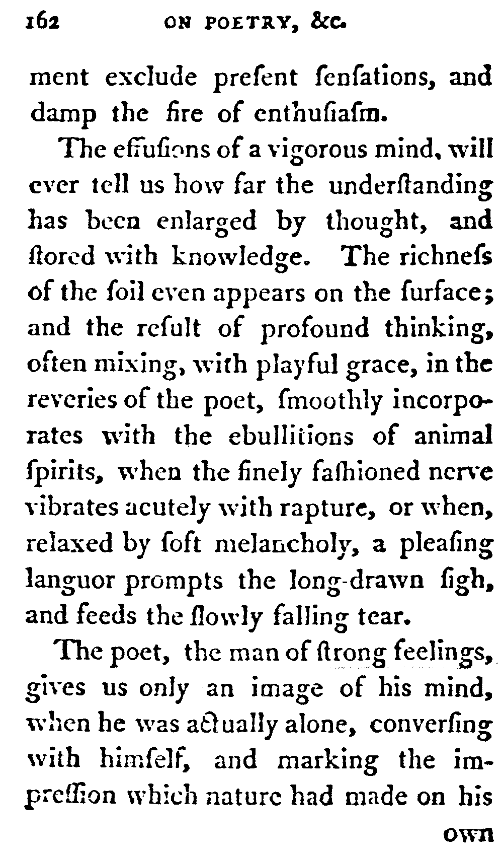 The poet, the man of ſtrong feelings, gives us only an image of his mind, when he was actually alone, converſing with himſelf, and marking the impreſſion which nature had made on his[163] own heart.—If, at this ſacred moment, the idea of ſome departed friend, ſome tender recollection when the ſoul was moſt alive to tenderneſs, intruded unawares into his thoughts, the ſorrow which it produced is artleſſly, yet poetically expreſſed—and who can avoid ſympathizing?