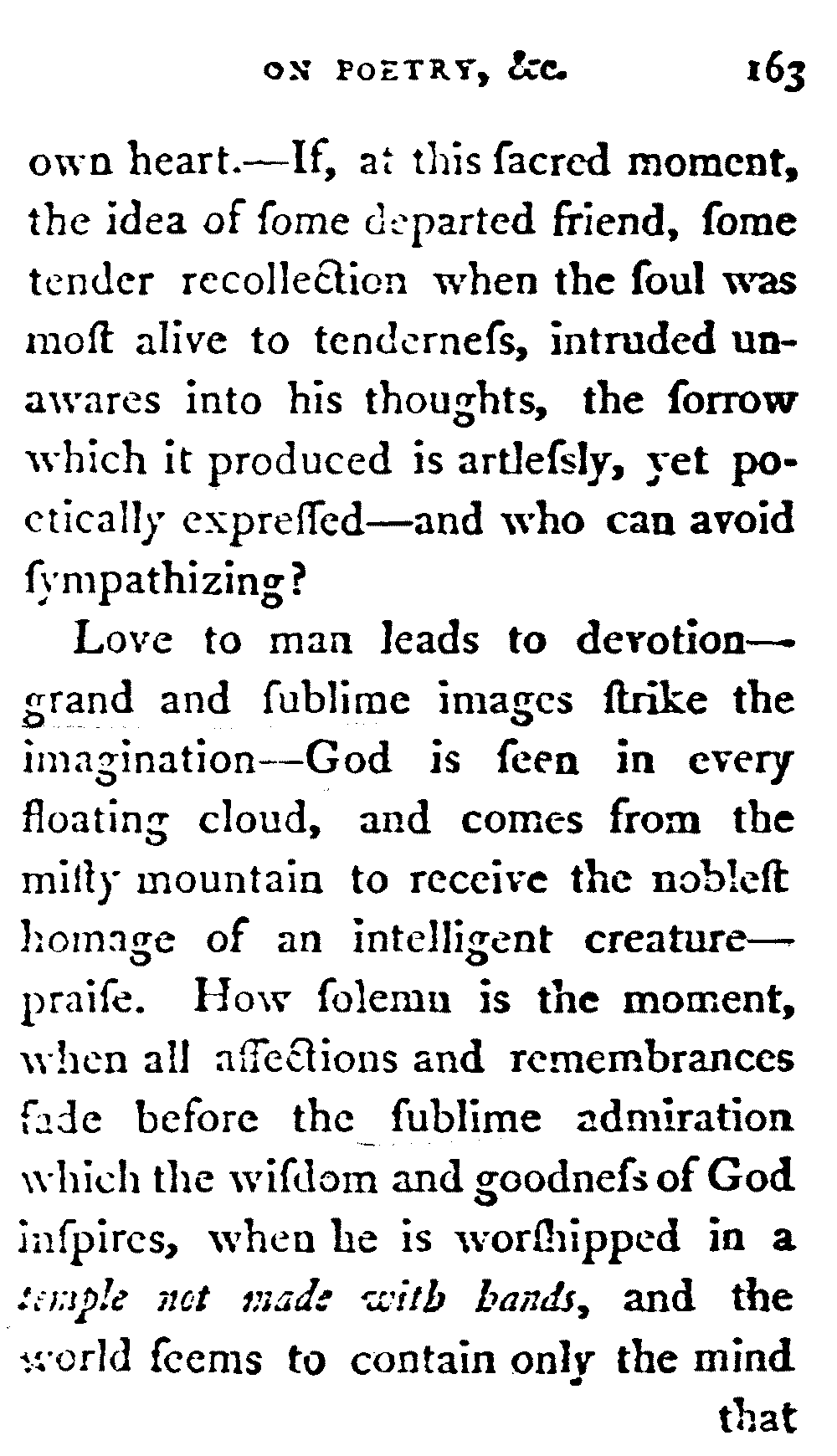 Love to man leads to devotion—grand and ſublime images ſtrike the imagination—God is ſeen in every floating cloud, and comes from the miſty mountain to receive the nobleſt homage of an intelligent creature—praiſe. How ſolemn is the moment, when all affections and remembrances fade before the ſublime admiration which the wiſdom and goodneſs of God inſpires, when he is worſhipped in a temple not made with hands, and the world ſeems to contain only the mind[164] that formed, and the mind that contemplates it! Theſe are not the weak reſponſes of ceremonial devotion; nor, to expreſs them, would the poet need another poet's aid: his heart burns within him, and he ſpeaks the language of truth and nature with reſiſtleſs energy.
