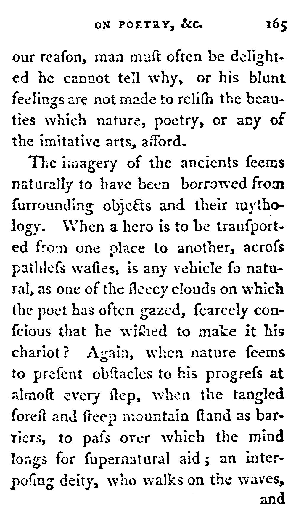 The imagery of the ancients ſeems naturally to have been borrowed from ſurrounding objects and their mythology. When a hero is to be tranſported from one place to another, acroſs pathleſs waſtes, is any vehicle ſo natural, as one of the fleecy clouds on which the poet has often gazed, ſcarcely conſcious that he wiſhed to make it his chariot? Again, when nature ſeems to preſent obſtacles to his progreſs at almoſt every ſtep, when the tangled foreſt and ſteep mountain ſtand as barriers, to paſs over which the mind longs for ſupernatural aid; an interpoſing deity, who walks on the waves,[166] and rules the ſtorm, ſeverely felt in the firſt attempts to cultivate a country, will receive from the impaſſioned fancy "a local habitation and a name."