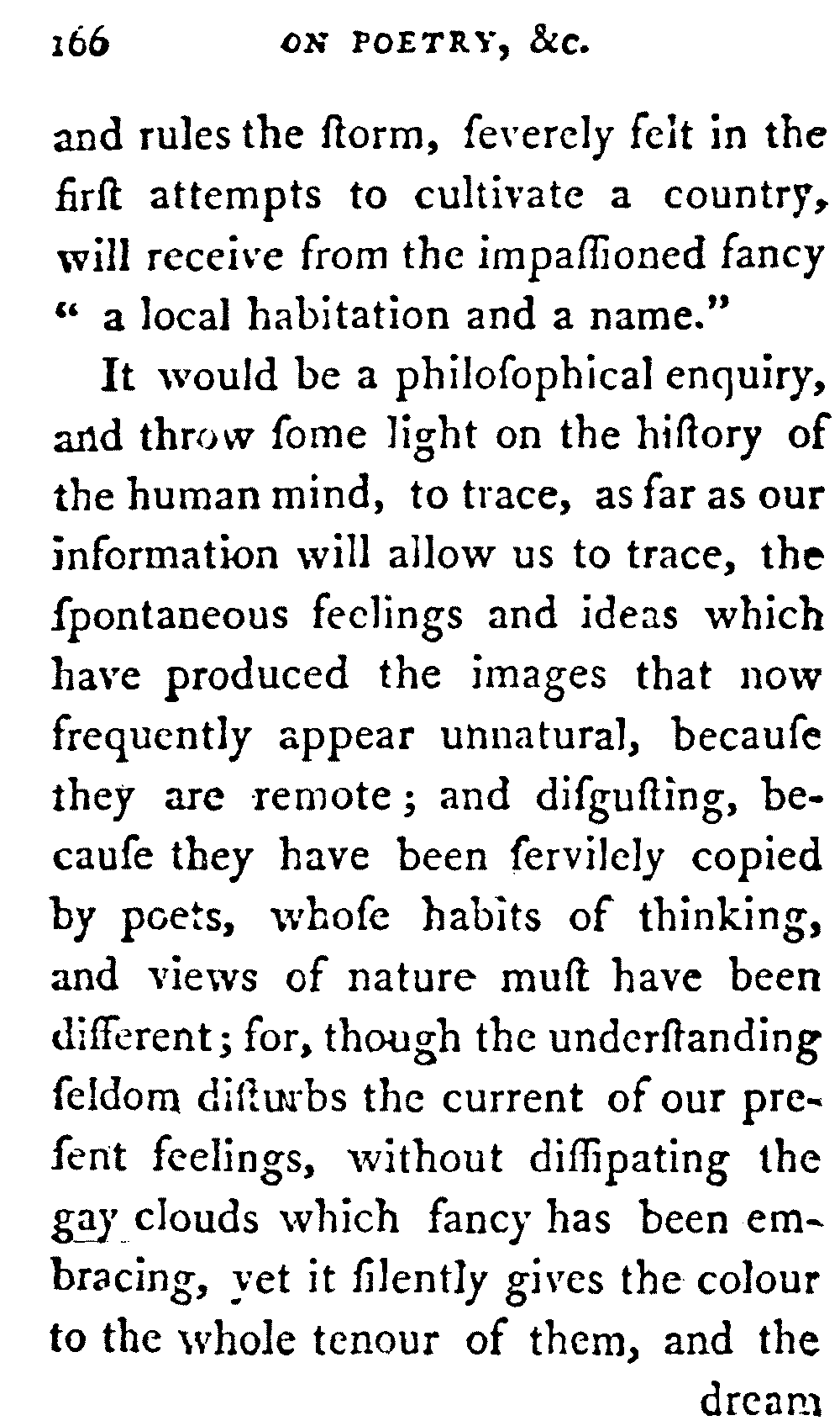 It would be a philoſophical enquiry, and throw ſome light on the hiſtory of the human mind, to trace, as far as our information will allow us to trace, the ſpontaneous feelings and ideas which have produced the images that now frequently appear unnatural, becauſe they are remote; and diſguſting, becauſe they have been ſervilely copied by poets, whoſe habits of thinking, and views of nature muſt have been different; for, though the underſtanding ſeldom diſturbs the current of our preſent feelings, without diſſipating the gay clouds which fancy has been embracing, yet it ſilently gives the colour to the whole tenour of them, and the[167] dream is over, when truth is groſſly violated, or images introduced, ſelected from books, and not from local manners or popular prejudices.