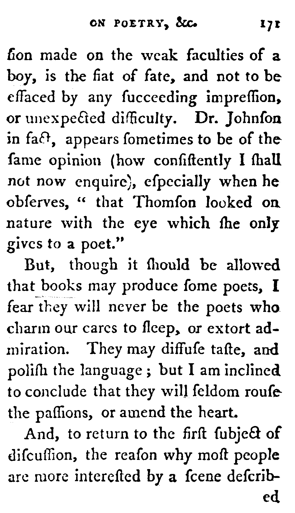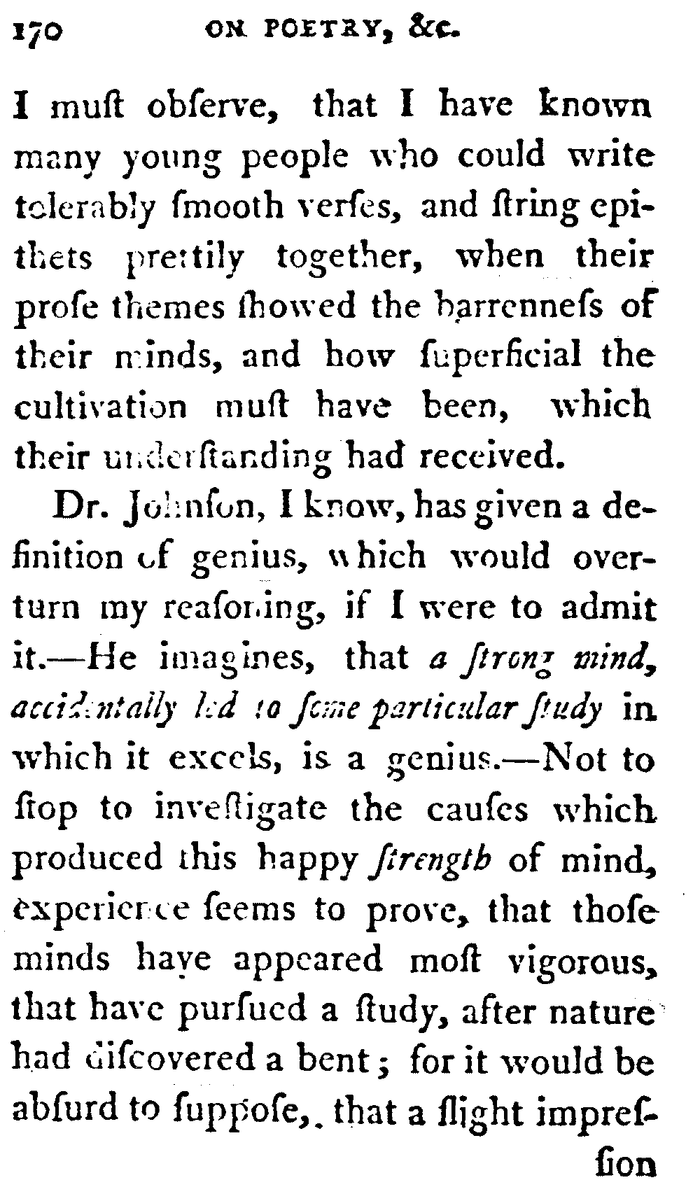 Dr. Johnſon, I know, has given a definition of genius, which would overturn my reaſoning, if I were to admit it.—He imagines, that a ſtrong mind, accidentally led to ſome particular ſtudy in which it excels, is a genius.—Not to ſtop to inveſtigate the cauſes which produced this happy ſtrength of mind, experience ſeems to prove, that thoſe minds have appeared moſt vigorous, that have purſued a ſtudy, after nature had diſcovered a bent; for it would be abſurd to ſuppoſe, that a ſlight impreſ[171]ſion made on the weak faculties of a boy, is the fiat of fate, and not to be effaced by any ſucceeding impreſſion, or unexpected difficulty. Dr. Johnſon in fact, appears ſometimes to be of the ſame opinion (how conſiſtently I ſhall not now enquire), eſpecially when he obſerves, "that Thomſon looked on nature with the eye which ſhe only gives to a poet."