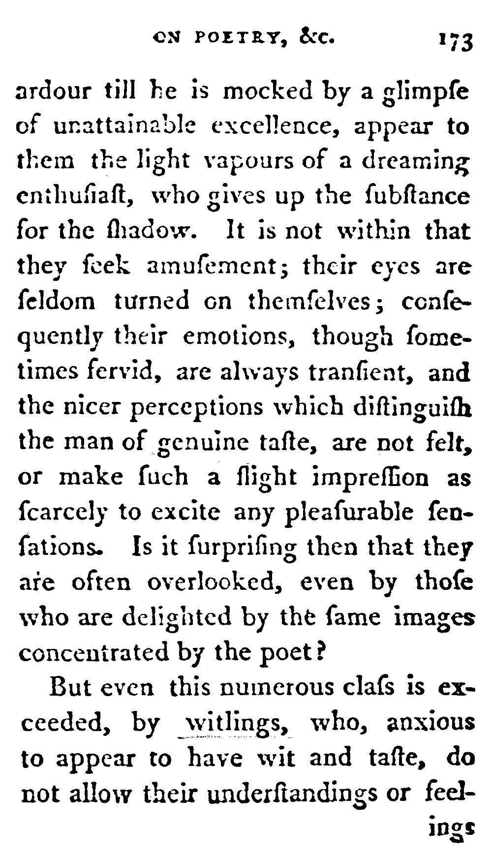 Beſides, it may be further obſerved, that groſs minds are only to be moved by forcible repreſentations. To rouſe the thoughtleſs, objects muſt be preſented, calculated to produce tumultuous emotions; the unſubſtantial, pictureſque forms which a contemplative man gazes on, and often follows with[173] ardour till he is mocked by a glimpſe of unattainable excellence, appear to them the light vapours of a dreaming enthuſiaſt, who gives up the ſubſtance for the ſhadow. It is not within that they ſeek amuſement; their eyes are ſeldom turned on themſelves; conſequently their emotions, though ſometimes fervid, are always tranſient, and the nicer perceptions which diſtinguiſh the man of genuine taſte, are not felt, or make ſuch a ſlight impreſſion as ſcarcely to excite any pleaſurable ſenſations. Is it ſurpriſing then that they are often overlooked, even by thoſe who are delighted by the ſame images concentrated by the poet?