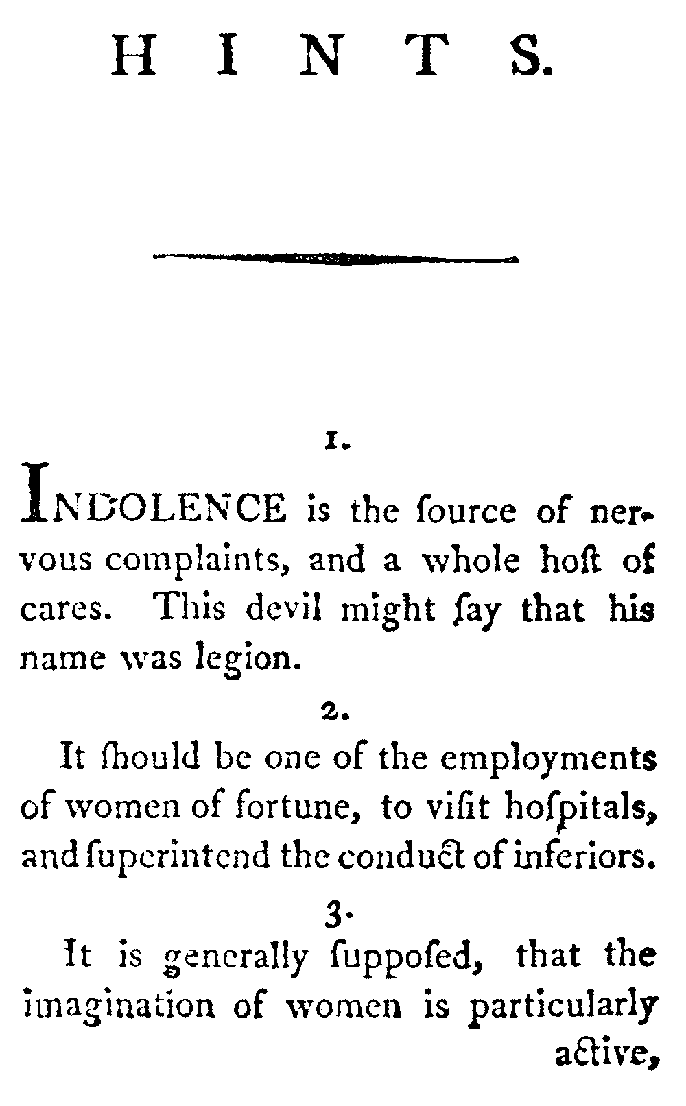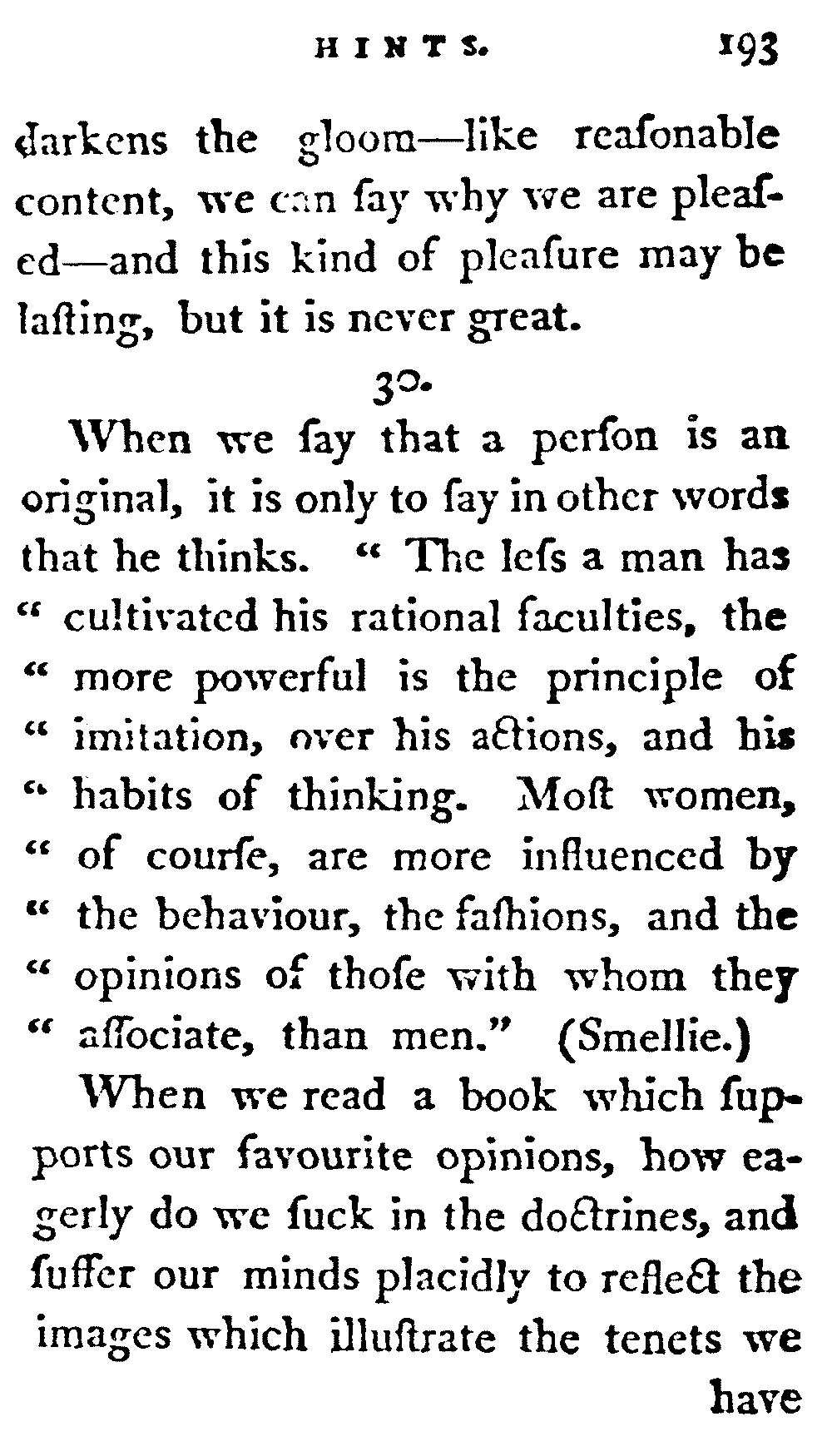 When we ſay that a perſon is an original, it is only to ſay in other words that he thinks. "The leſs a man has cultivated his rational faculties, the more powerful is the principle of imitation, over his actions, and his habits of thinking. Moſt women, of courſe, are more influenced by the behaviour, the faſhions, and the opinions of thoſe with whom they aſſociate, than men." (Smellie.)