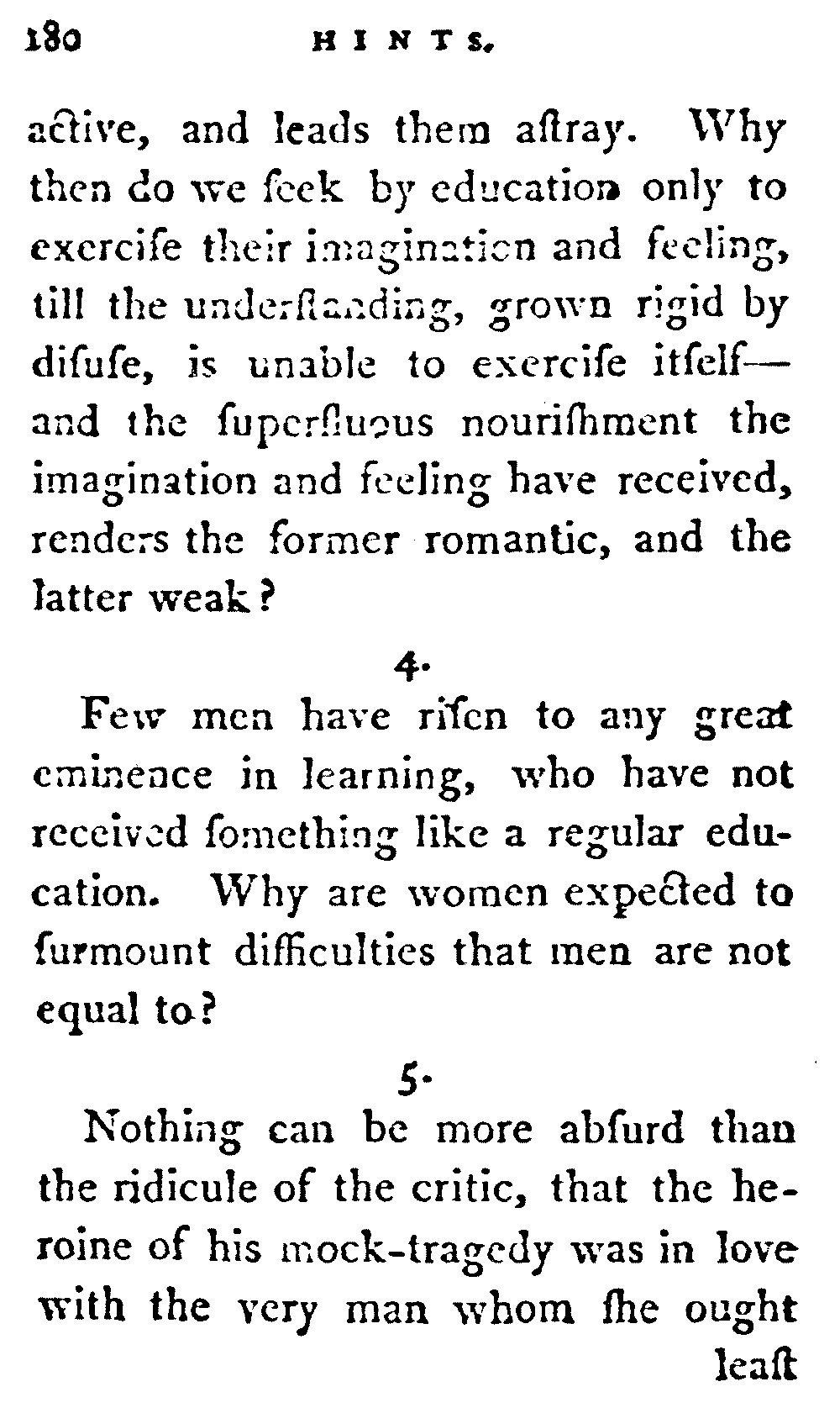It is generally ſuppoſed, that the imagination of women is particularly[180] active, and leads them aſtray. Why then do we ſeek by education only to exerciſe their imagination and feeling, till the underſtanding, grown rigid by diſuſe, is unable to exerciſe itſelf—and the ſuperfluous nouriſhment the imagination and feeling have received, renders the former romantic, and the latter weak?