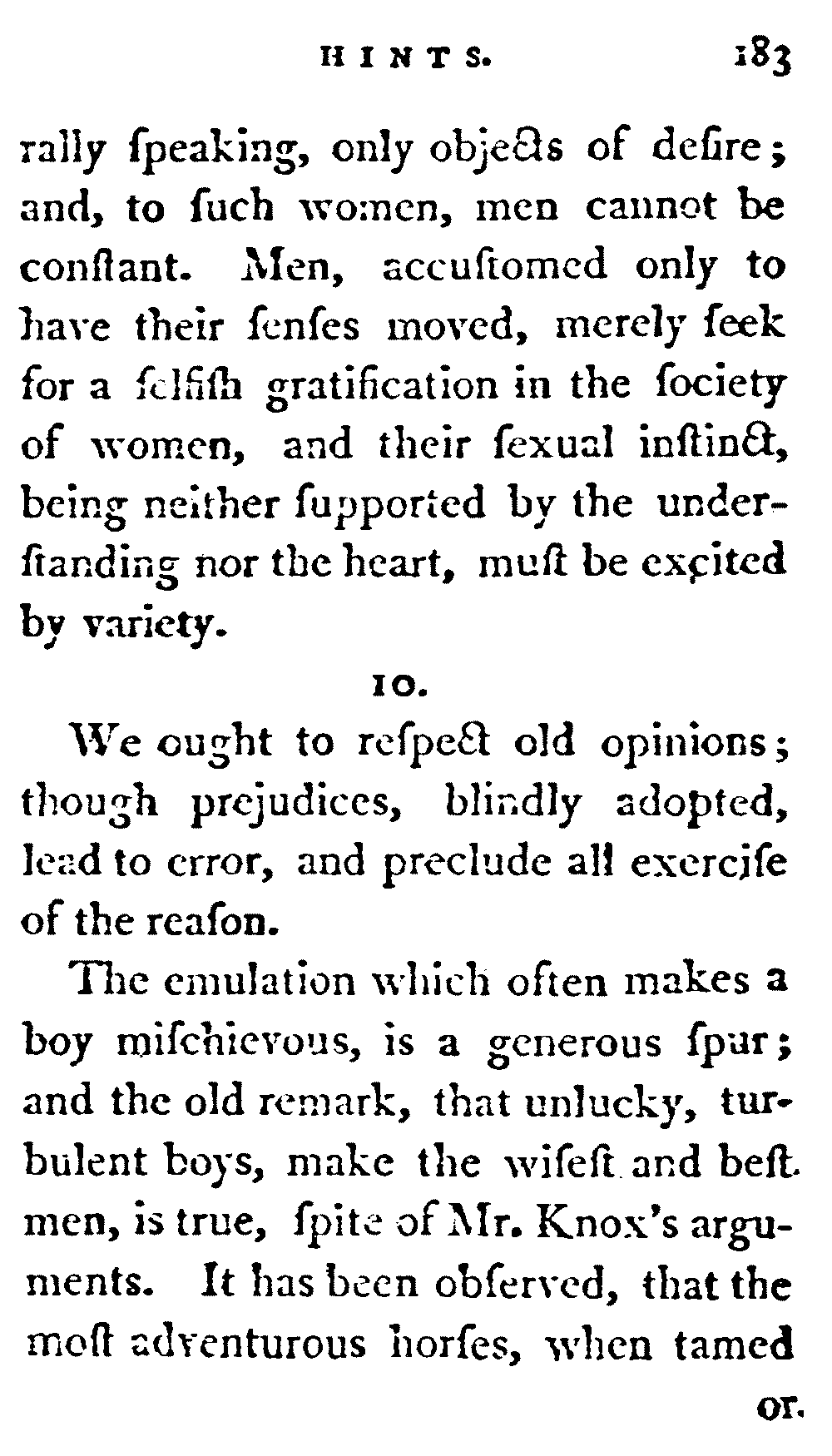 The emulation which often makes a boy miſchievous, is a generous ſpur; and the old remark, that unlucky, turbulent boys, make the wiſeſt and beſt men, is true, ſpite of Mr. Knox's arguments. It has been obſerved, that the moſt adventurous horſes, when tamed[184] or domeſticated, are the moſt mild and tractable.