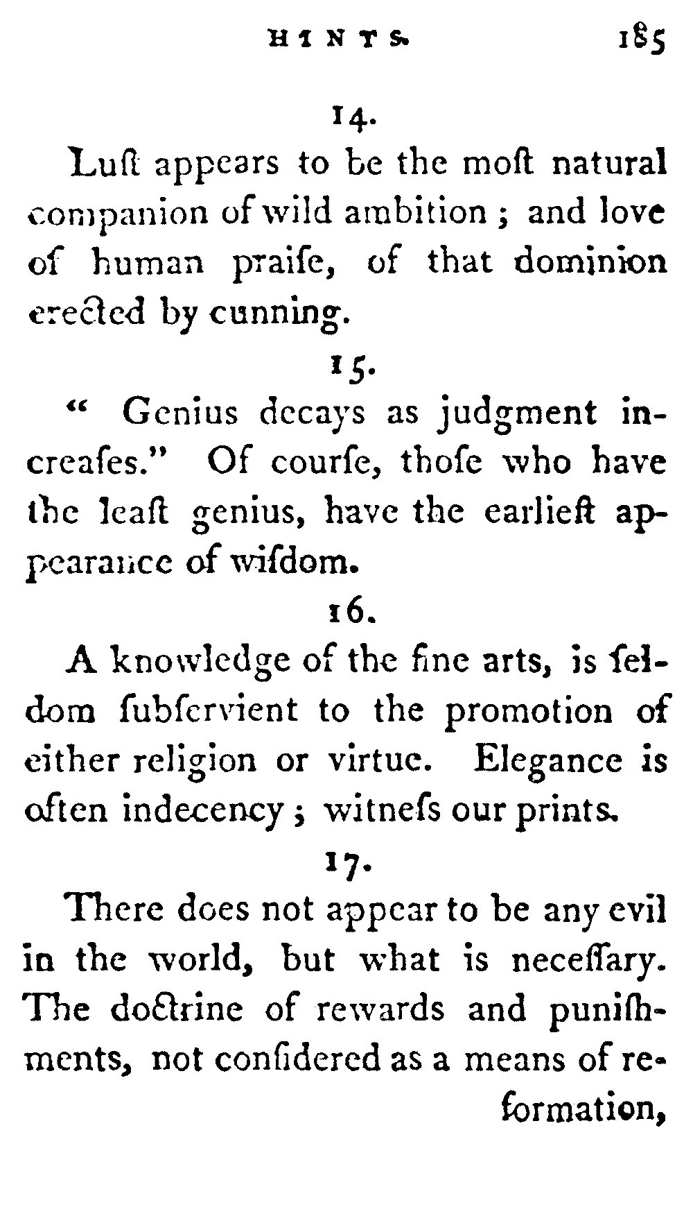 A knowledge of the fine arts, is ſeldom ſubſervient to the promotion of either religion or virtue. Elegance is often indecency; witneſs our prints.