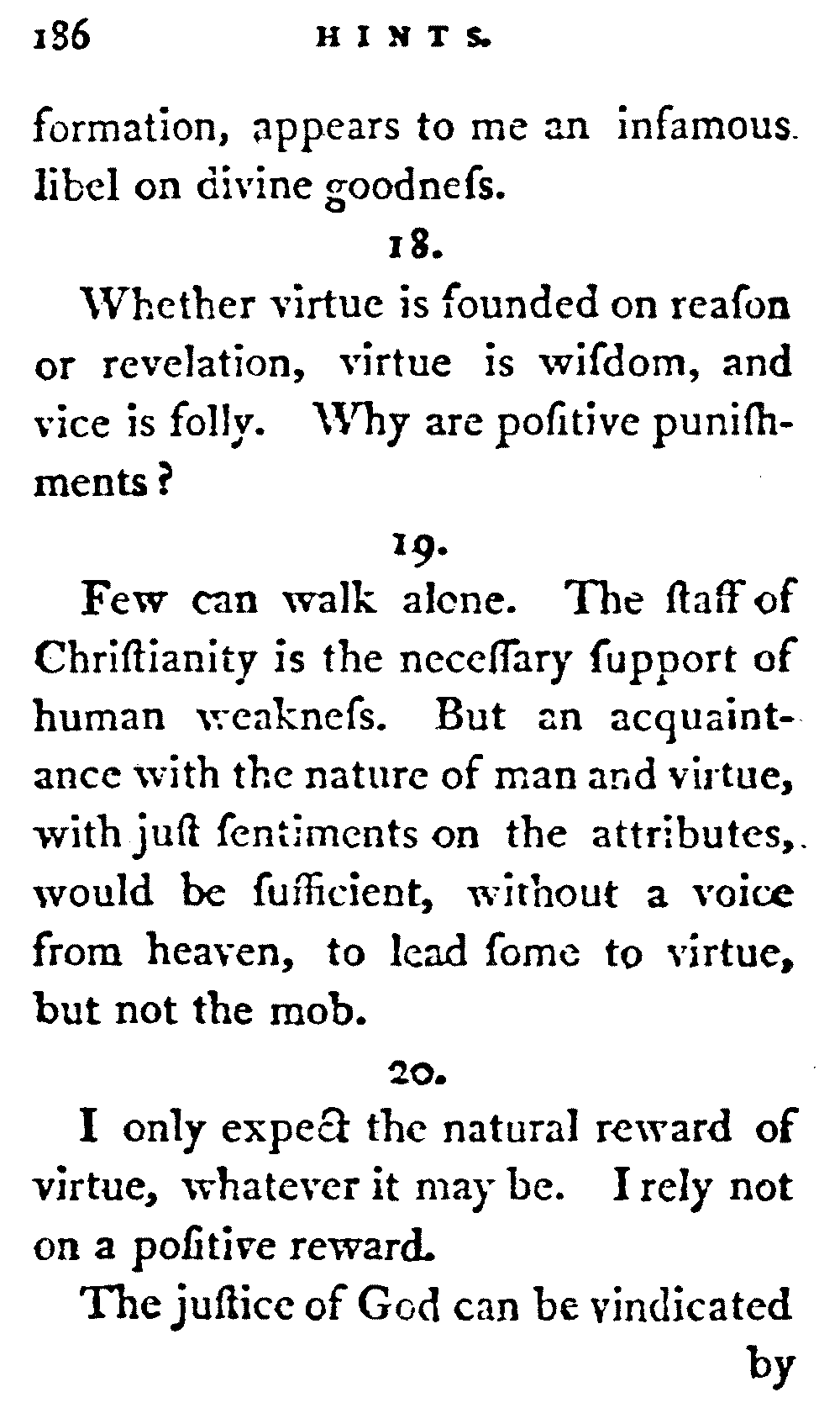 Few can walk alone. The ſtaff of Chriſtianity is the neceſſary ſupport of human weakneſs. But an acquaintance with the nature of man and virtue, with juſt ſentiments on the attributes, would be ſufficient, without a voice from heaven, to lead ſome to virtue, but not the mob.