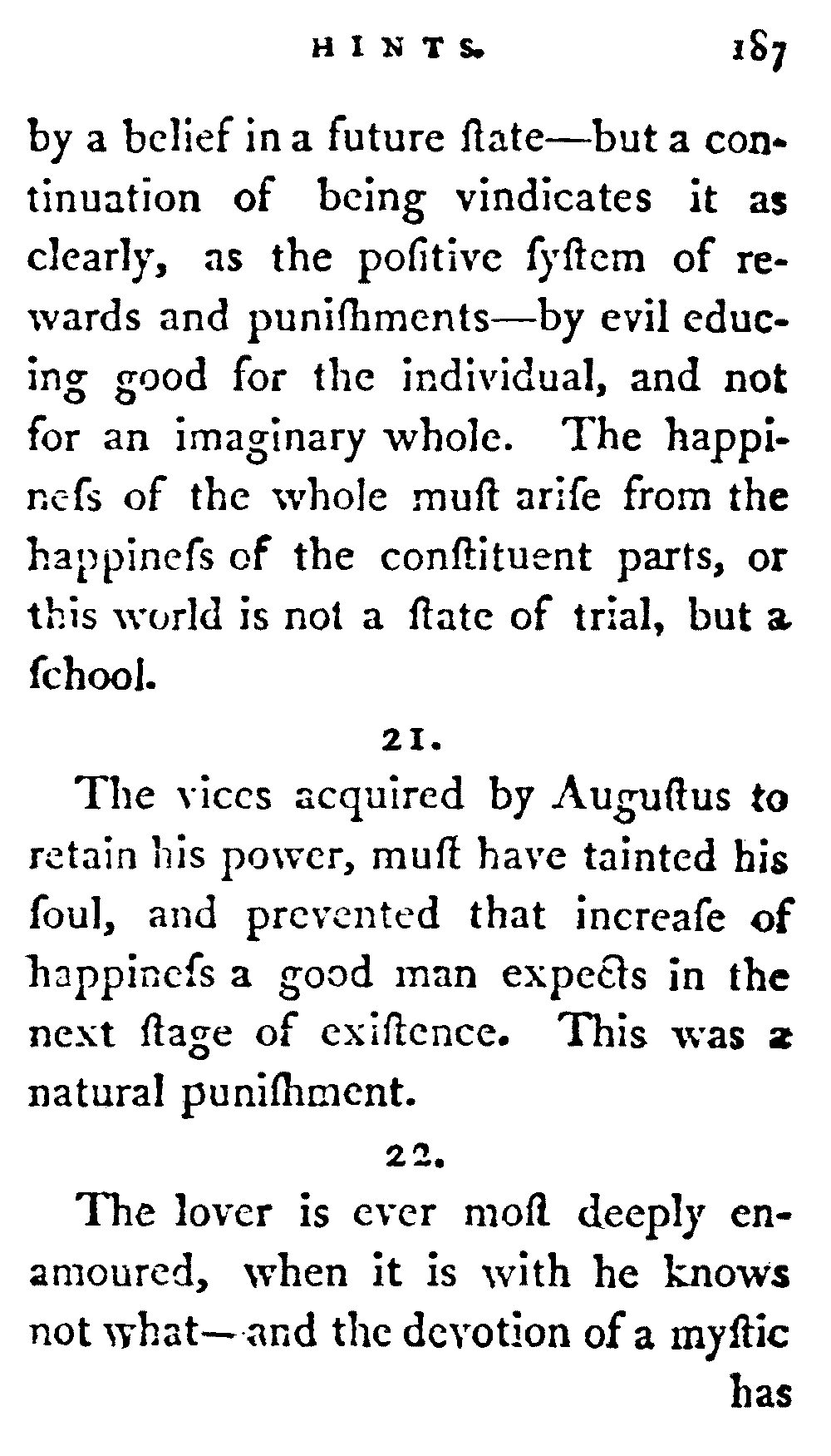 The juſtice of God can be vindicated[187] by a belief in a future ſtate—but a continuation of being vindicates it as clearly, as the poſitive ſyſtem of rewards and puniſhments—by evil educing good for the individual, and not for an imaginary whole. The happineſs of the whole muſt ariſe from the happineſs of the conſtituent parts, or this world is not a ſtate of trial, but a ſchool.