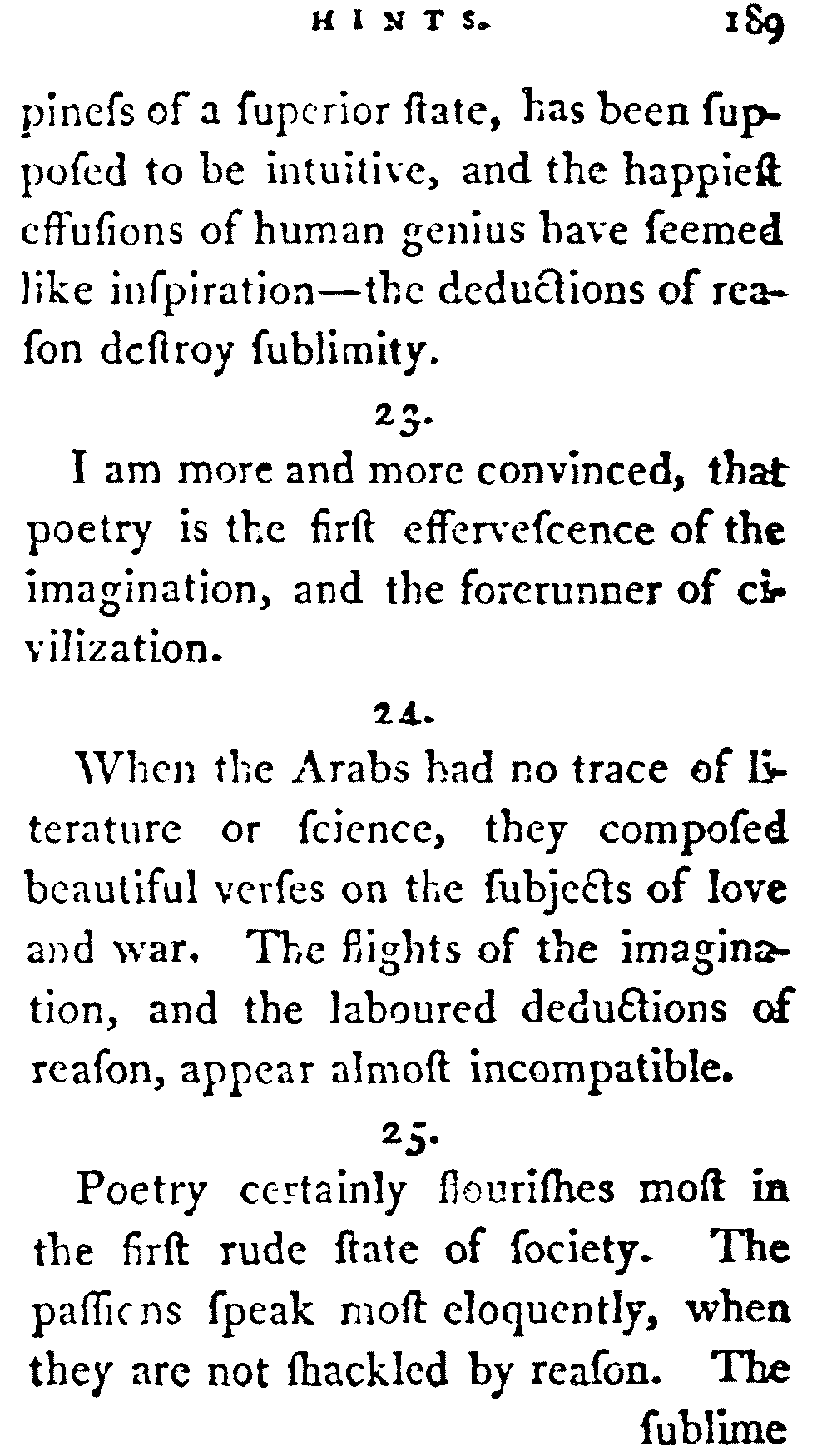 When the Arabs had no trace of literature or ſcience, they compoſed beautiful verſes on the ſubjects of love and war. The flights of the imagination, and the laboured deductions of reaſon, appear almoſt incompatible.