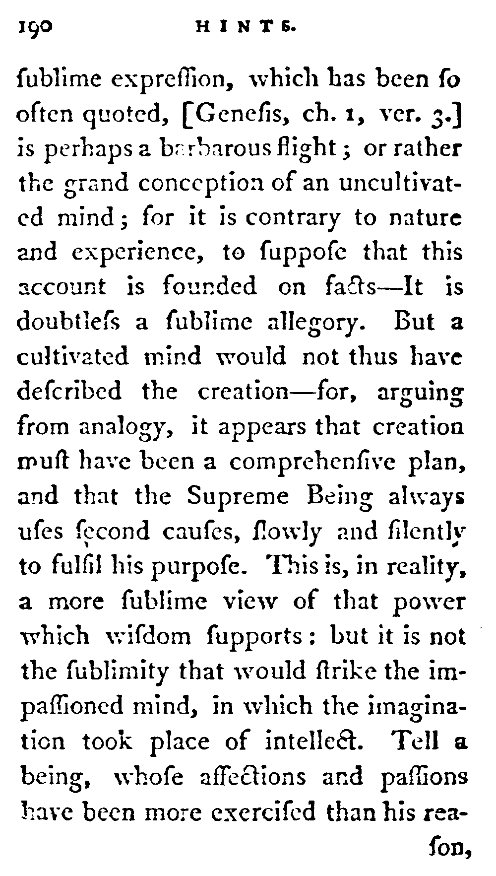 Poetry certainly flouriſhes moſt in the firſt rude ſtate of ſociety. The paſſions ſpeak moſt eloquently, when they are not ſhackled by reaſon. The[190] ſublime expreſſion, which has been ſo often quoted, [Geneſis, ch. 1, ver. 3.] is perhaps a barbarous flight; or rather the grand conception of an uncultivated mind; for it is contrary to nature and experience, to ſuppoſe that this account is founded on facts—It is doubtleſs a ſublime allegory. But a cultivated mind would not thus have deſcribed the creation—for, arguing from analogy, it appears that creation muſt have been a comprehenſive plan, and that the Supreme Being always uſes ſecond cauſes, ſlowly and ſilently to fulfil his purpoſe. This is, in reality, a more ſublime view of that power which wiſdom ſupports: but it is not the ſublimity that would ſtrike the impaſſioned mind, in which the imagination took place of intellect. Tell a being, whoſe affections and paſſions have been more exerciſed than his rea[191]ſon, that God ſaid, Let there be light! and there was light; and he would proſtrate himſelf before the Being who could thus call things out of nothing, as if they were: but a man in whom reaſon had taken place of paſſion, would not adore, till wiſdom was conſpicuous as well as power, for his admiration muſt be founded on principle.
