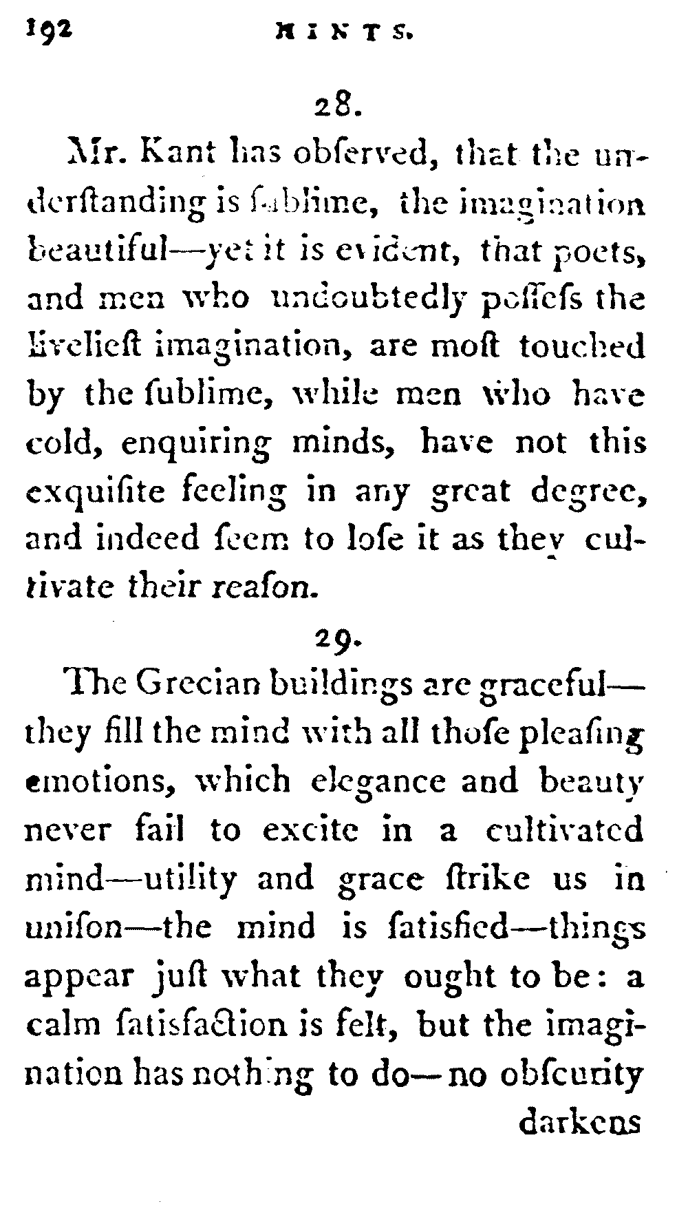 Mr. Kant has obſerved, that the underſtanding is ſublime, the imagination beautiful—yet it is evident, that poets, and men who undoubtedly poſſeſs the livelieſt imagination, are moſt touched by the ſublime, while men who have cold, enquiring minds, have not this exquiſite feeling in any great degree, and indeed ſeem to loſe it as they cultivate their reaſon.