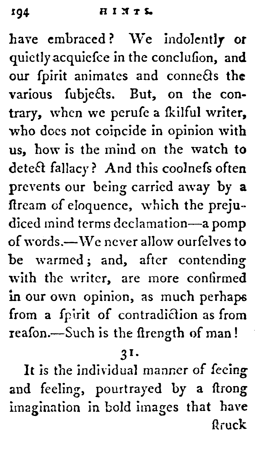When we read a book which ſupports our favourite opinions, how eagerly do we ſuck in the doctrines, and ſuffer our minds placidly to reflect the images which illuſtrate the tenets we[194] have embraced? We indolently or quietly acquieſce in the concluſion, and our ſpirit animates and connects the various ſubjects. But, on the contrary, when we peruſe a ſkilful writer, who does not coincide in opinion with us, how is the mind on the watch to detect fallacy? And this coolneſs often prevents our being carried away by a ſtream of eloquence, which the prejudiced mind terms declamation—a pomp of words.—We never allow ourſelves to be warmed; and, after contending with the writer, are more confirmed in our own opinion, as much perhaps from a ſpirit of contradiction as from reaſon.—Such is the ſtrength of man!