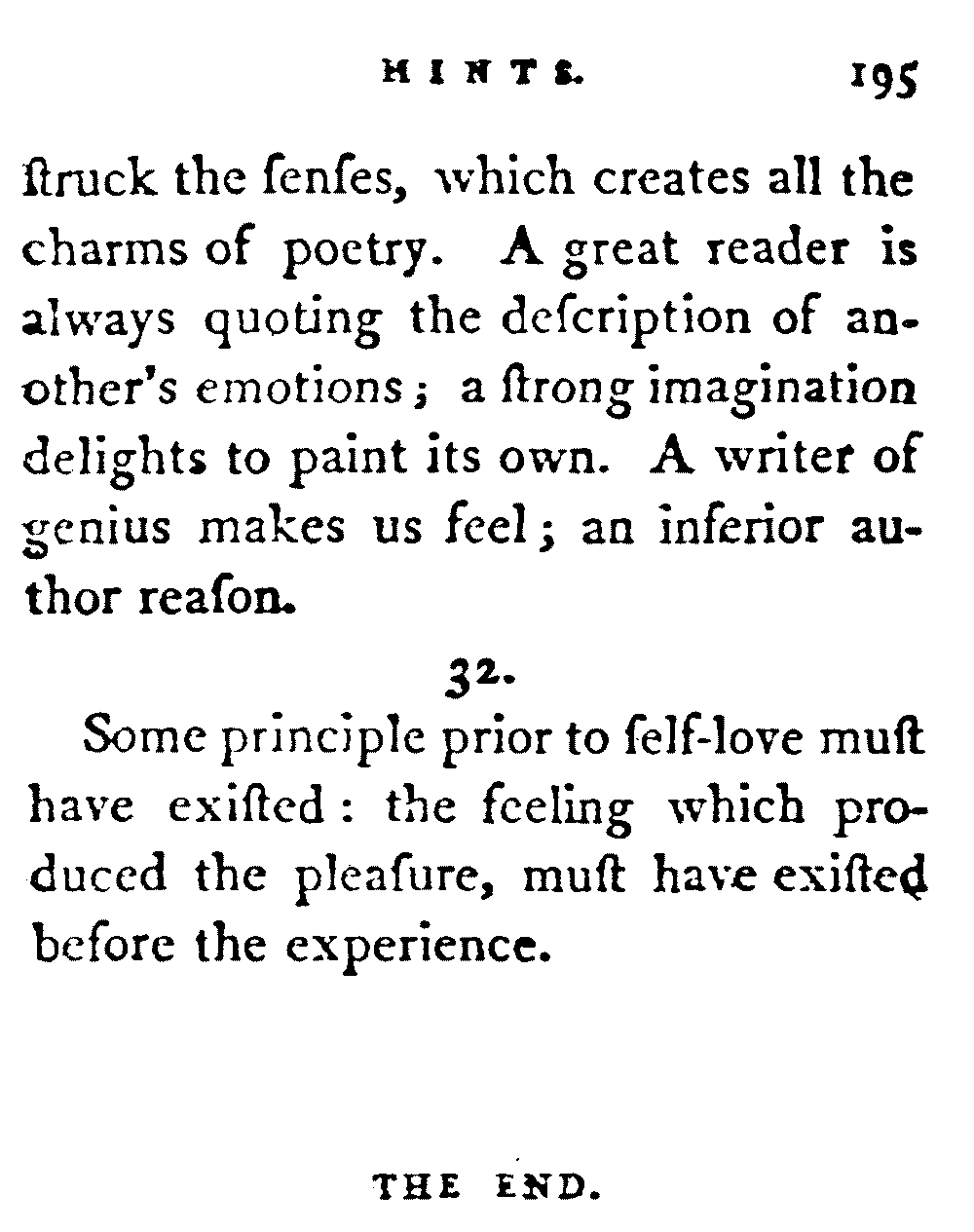 It is the individual manner of ſeeing and feeling, pourtrayed by a ſtrong imagination in bold images that have[195] ſtruck the ſenſes, which creates all the charms of poetry. A great reader is always quoting the deſcription of another's emotions; a ſtrong imagination delights to paint its own. A writer of genius makes us feel; an inferior author reaſon.