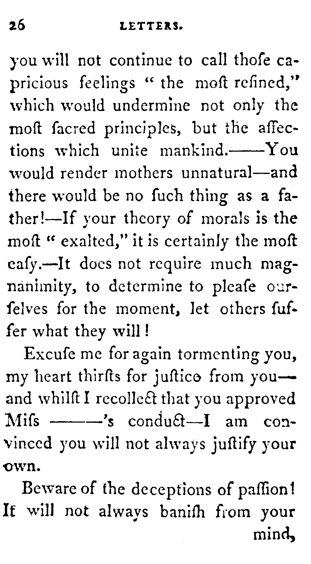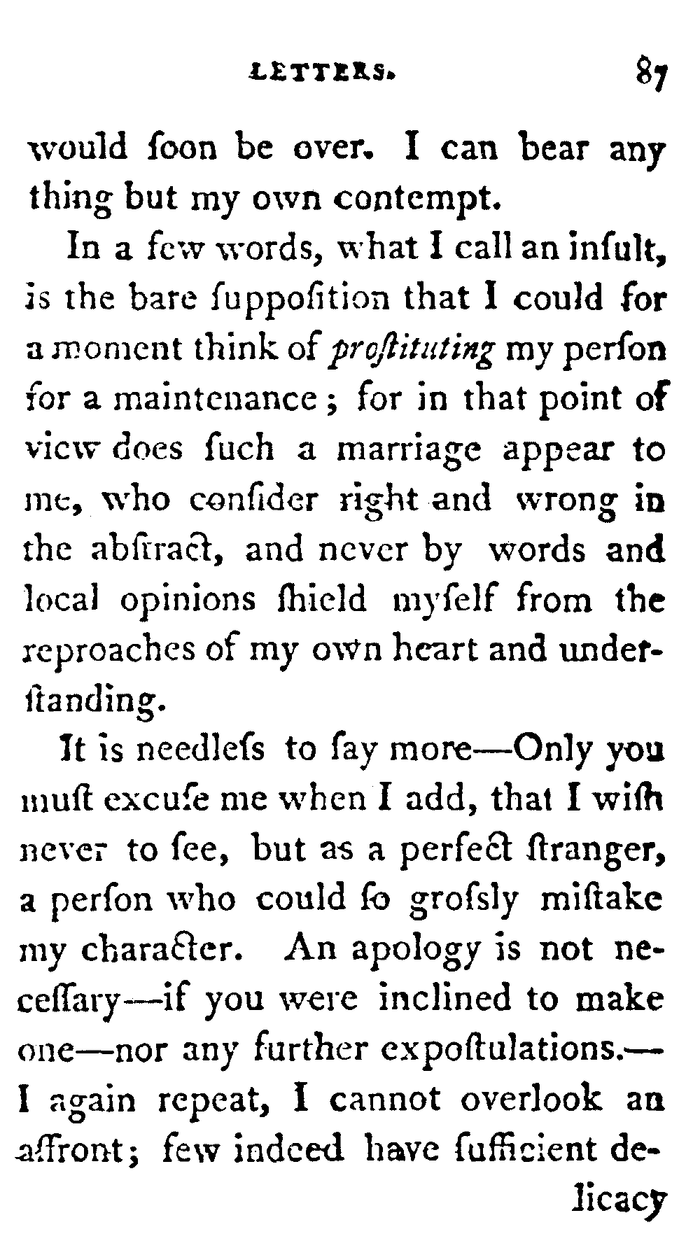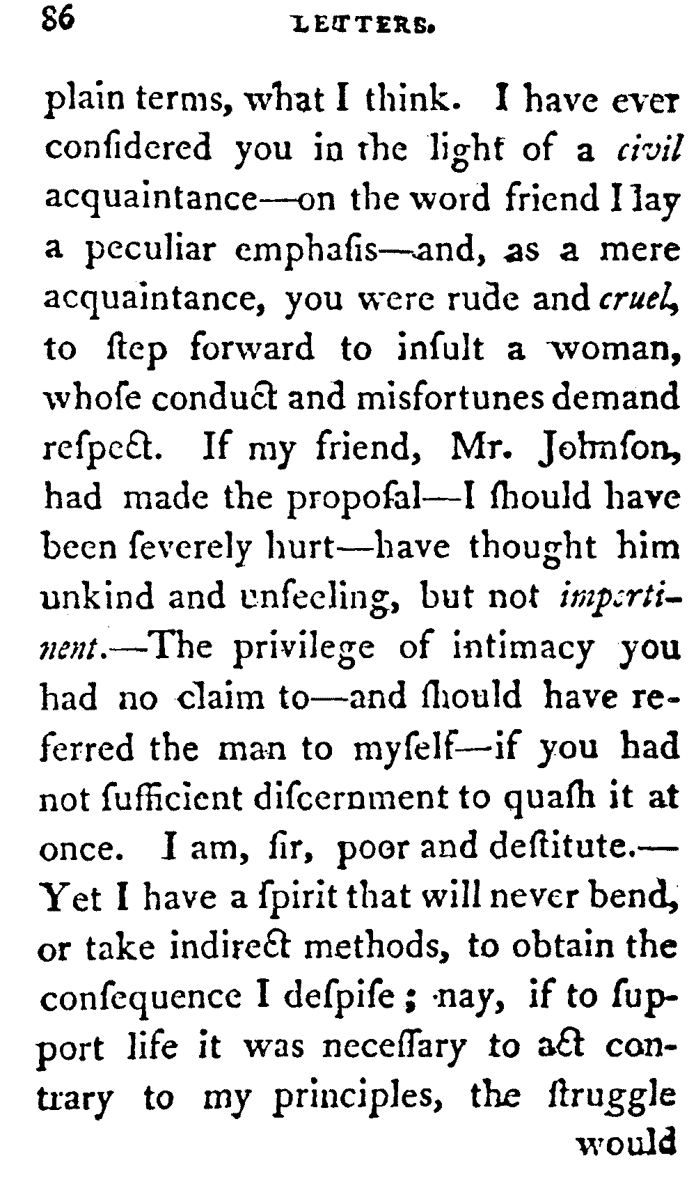 An insulated being, from the misfortune of her birth, she despised and preyed on the society by which she had been oppressed, and loved not her fellow-creatures, because she had never been beloved. No mother had ever fondled her, no father or brother had protected her from outrage; and the man who had plunged her into in[23]famy, and deserted her when she stood in greatest need of support, deigned not to smooth with kindness the road to ruin. Thus degraded, was she let loose on the world; and virtue, never nurtured by affection, assumed the stern aspect of selfish independence.