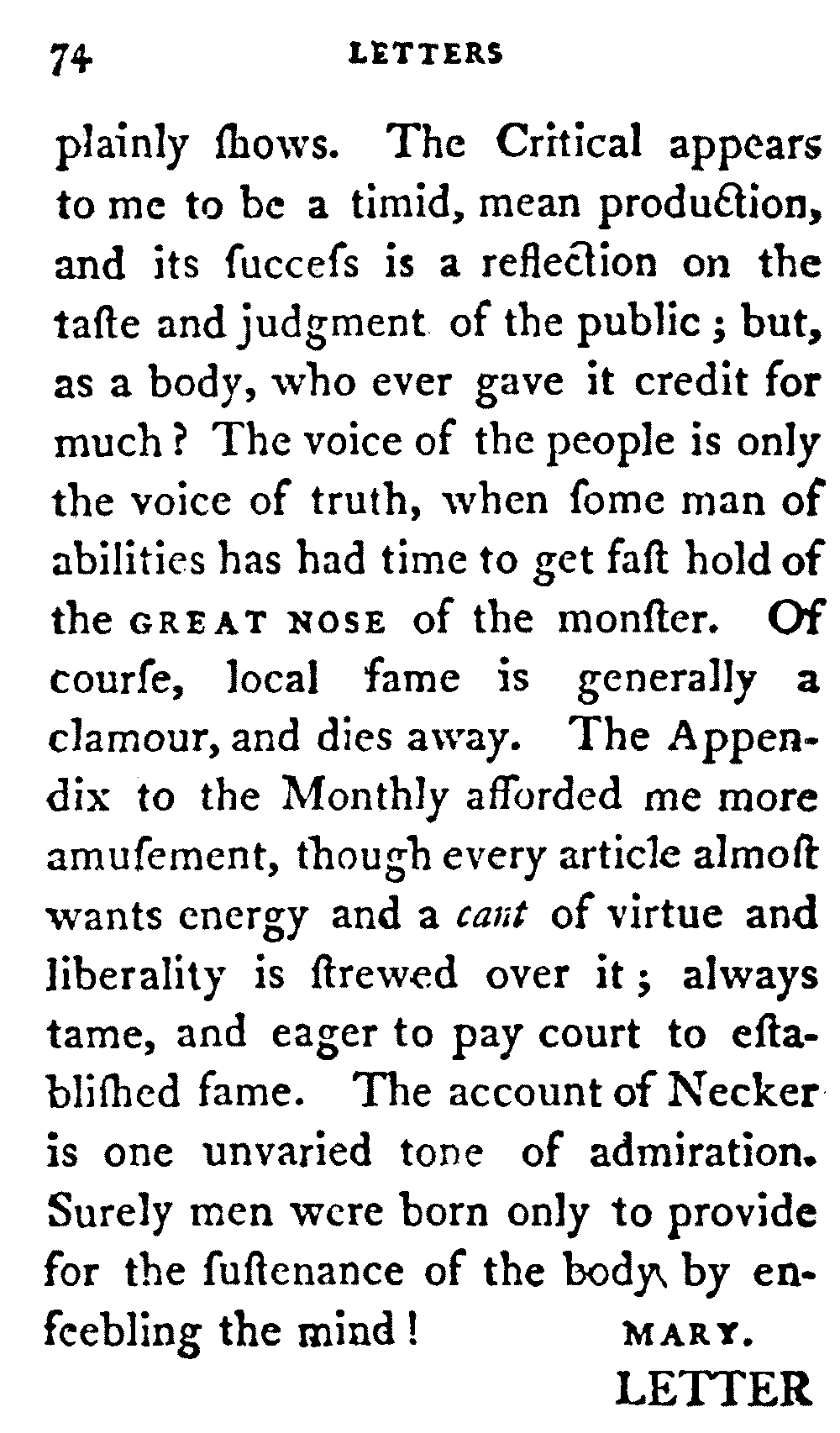 So fondly did I doat on this dear pa[134]rent, that ſhe engroſſed all my tenderneſs; her ſorrows had knit me firmly to her, and my chief care was to give her proofs of affection. The gallantry that afforded my companions, the few young people my mother forced me to mix with, ſo much pleaſure, I deſpiſed; I wiſhed more to be loved than admired, for I could love. I adored virtue; and my imagination, chaſing a chimerical object, overlooked the common pleaſures of life; they were not ſufficient for my happineſs. A latent fire made me burn to riſe ſuperior to my contemporaries in wiſdom and virtue; and tears of joy and emulation filled my eyes when I read an account of a great action—I felt admiration, not aſtoniſhment.