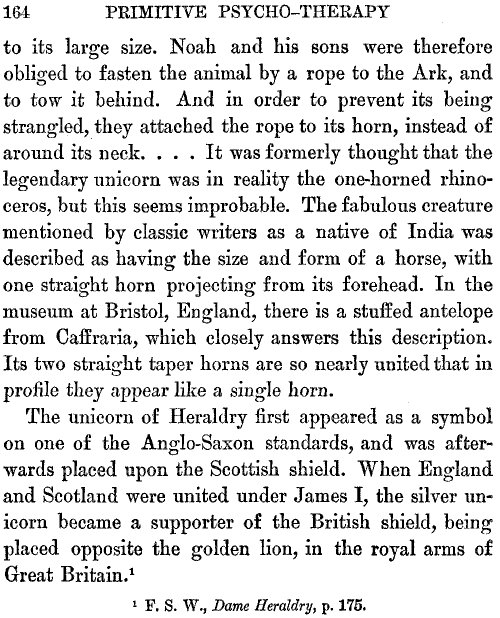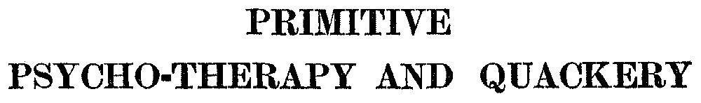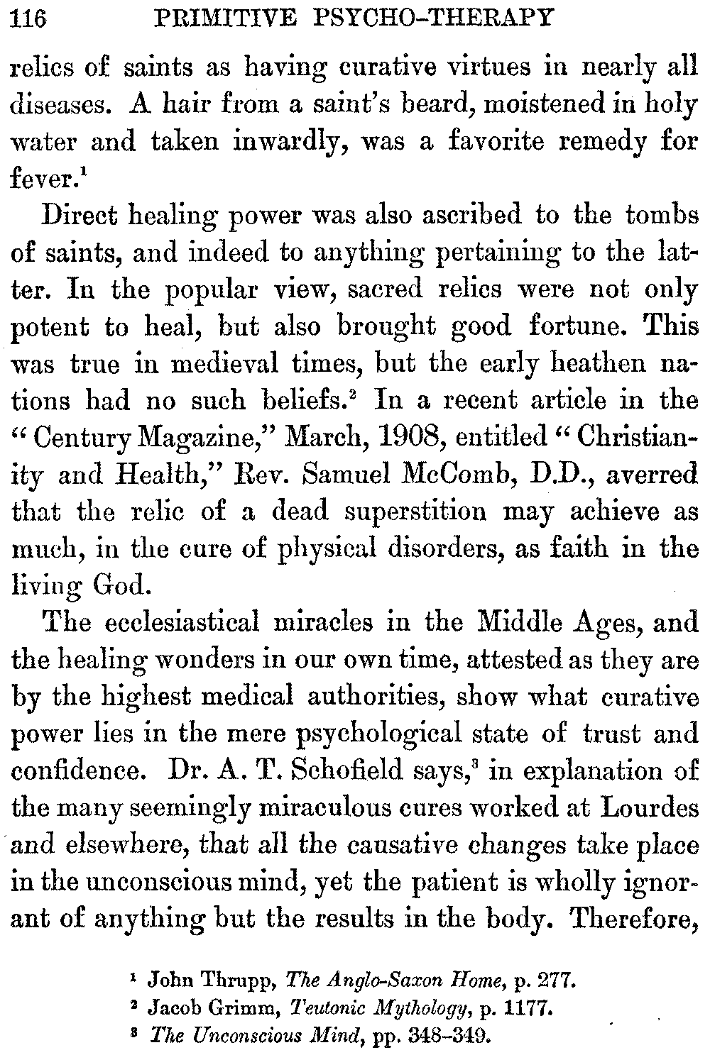 According to this view, the majority of superstitious fancies are of animistic origin. These include, not only many methods of primitive psycho-therapy, but also the [11]belief in goblins, haunted houses, and the veneration of holy relics.