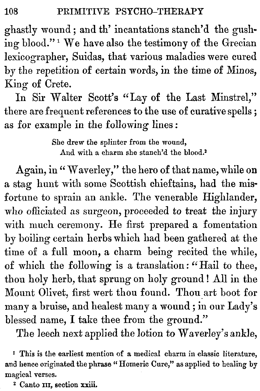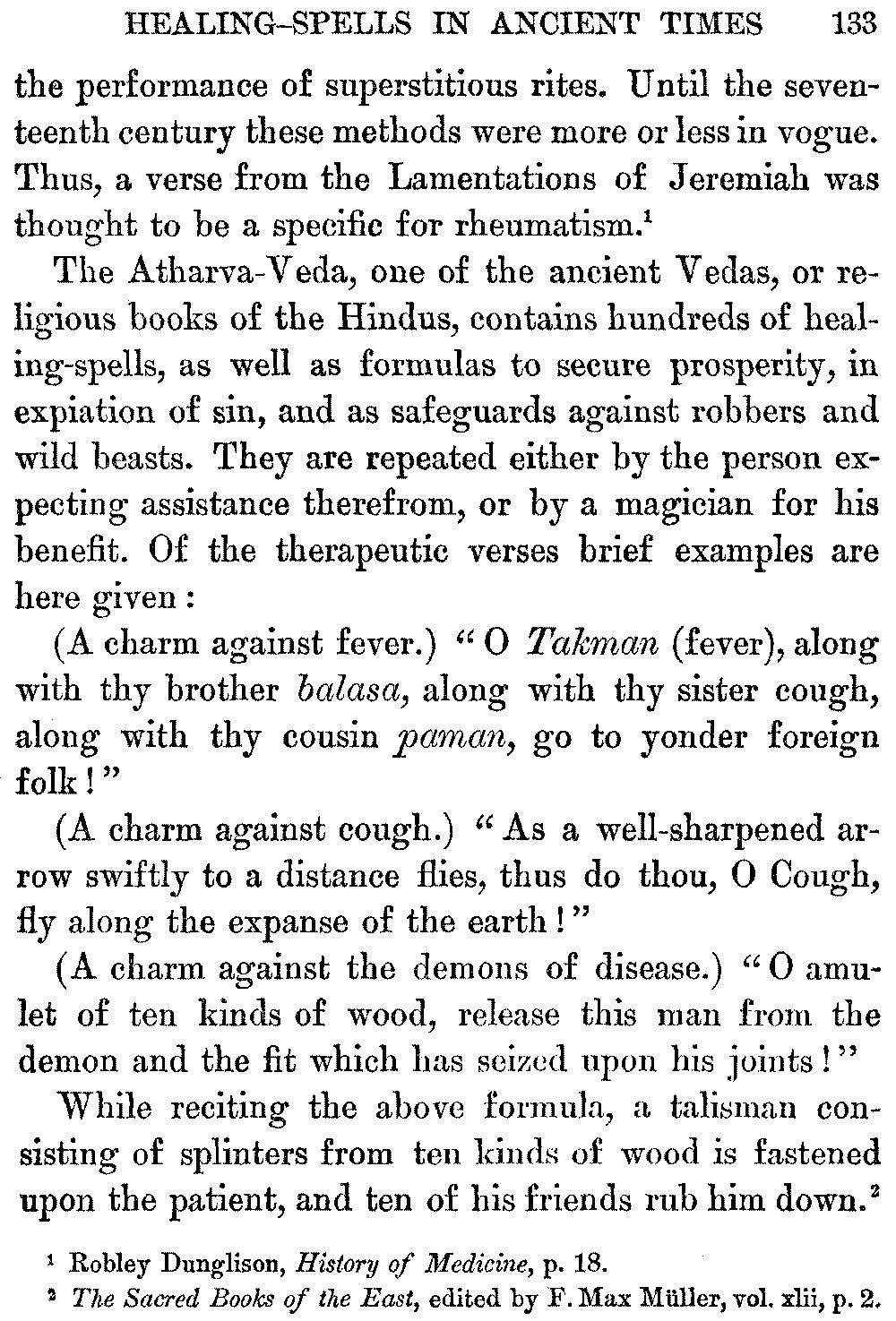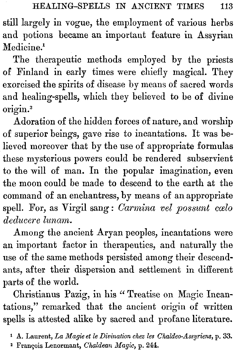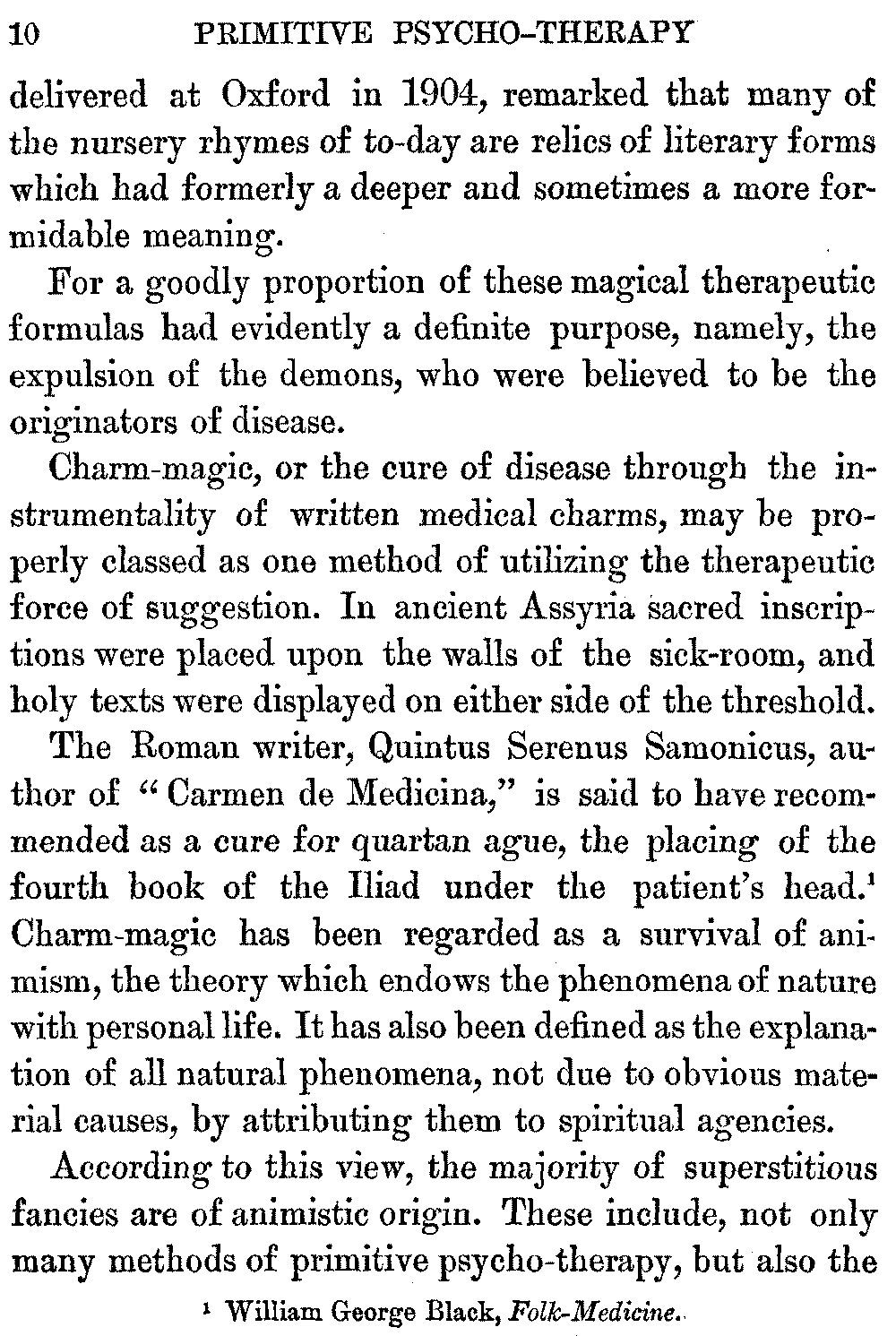The Roman writer, Quintus Serenus Samonicus, author of "Carmen de Medicina," is said to have recommended as a cure for quartan ague, the placing of the fourth book of the Iliad under the patient's head.[10:1] Charm-magic has been regarded as a survival of animism, the theory which endows the phenomena of nature with personal life. It has also been defined as the explanation of all natural phenomena, not due to obvious material causes, by attributing them to spiritual agencies.
