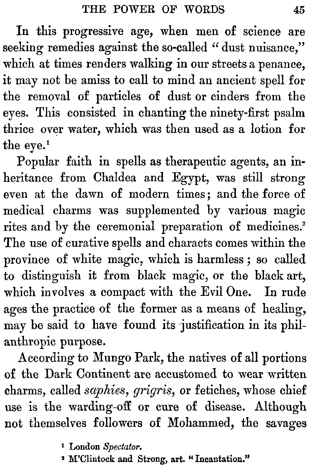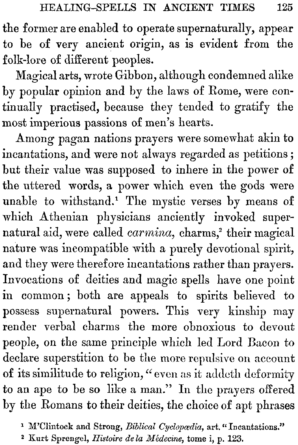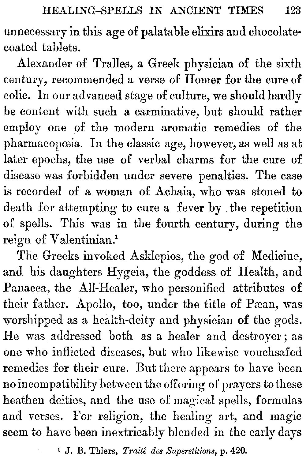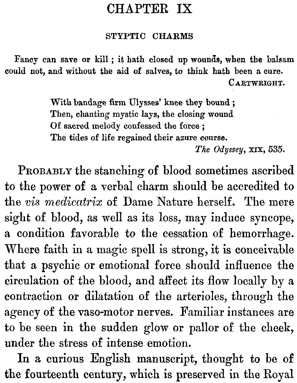The Roman writer, Quintus Serenus Samonicus, author of "Carmen de Medicina," is said to have recommended as a cure for quartan ague, the placing of the fourth book of the Iliad under the patient's head.[10:1] Charm-magic has been regarded as a survival of animism, the theory which endows the phenomena of nature with personal life. It has also been defined as the explanation of all natural phenomena, not due to obvious material causes, by attributing them to spiritual agencies.