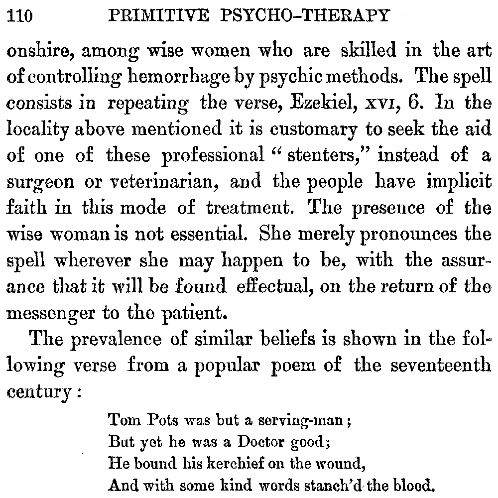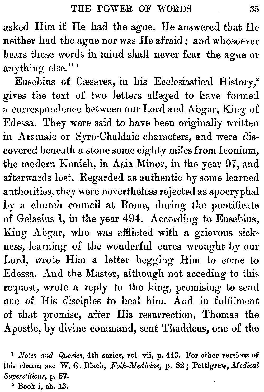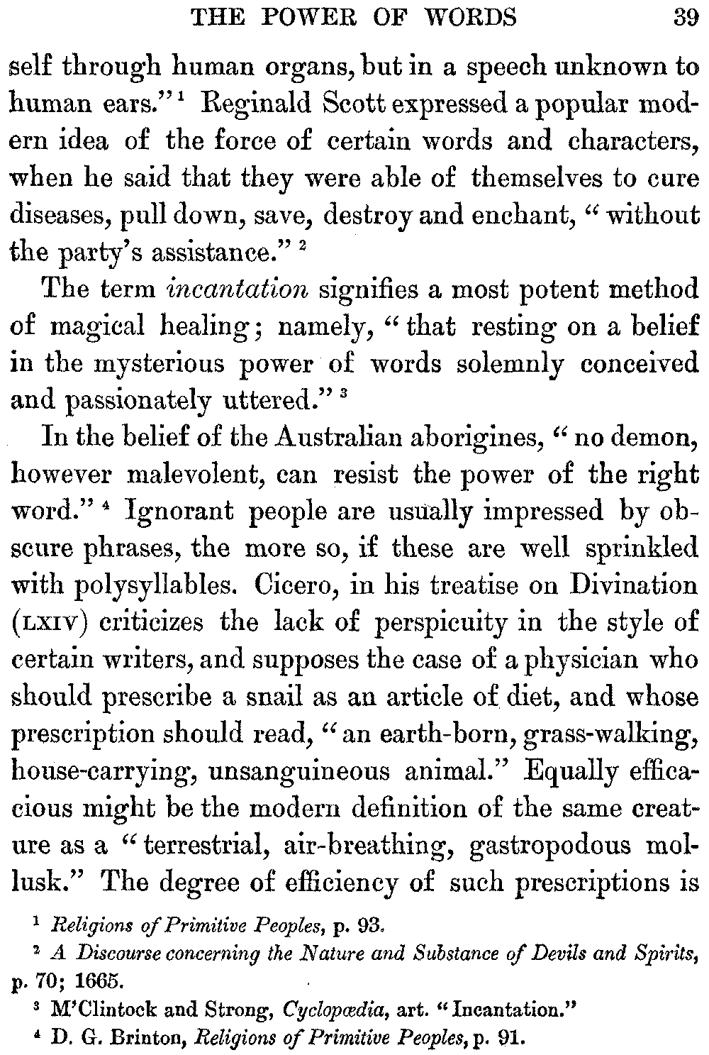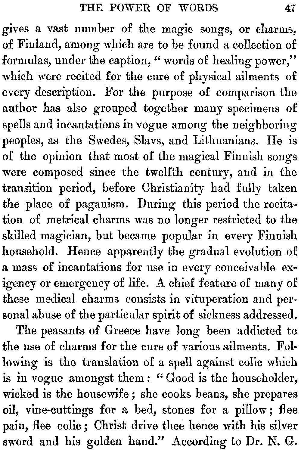 The Roman writer, Quintus Serenus Samonicus, author of "Carmen de Medicina," is said to have recommended as a cure for quartan ague, the placing of the fourth book of the Iliad under the patient's head.[10:1] Charm-magic has been regarded as a survival of animism, the theory which endows the phenomena of nature with personal life. It has also been defined as the explanation of all natural phenomena, not due to obvious material causes, by attributing them to spiritual agencies.
