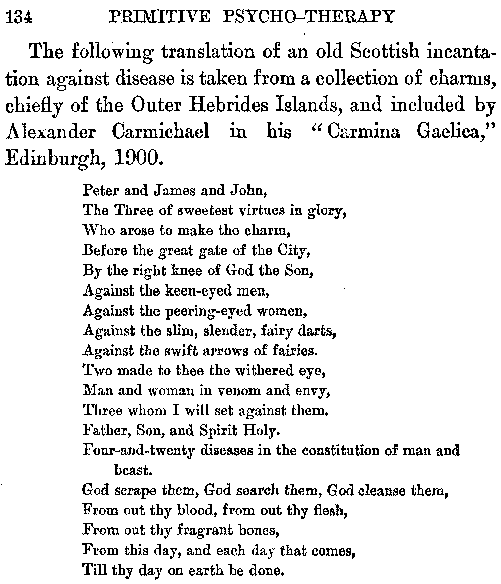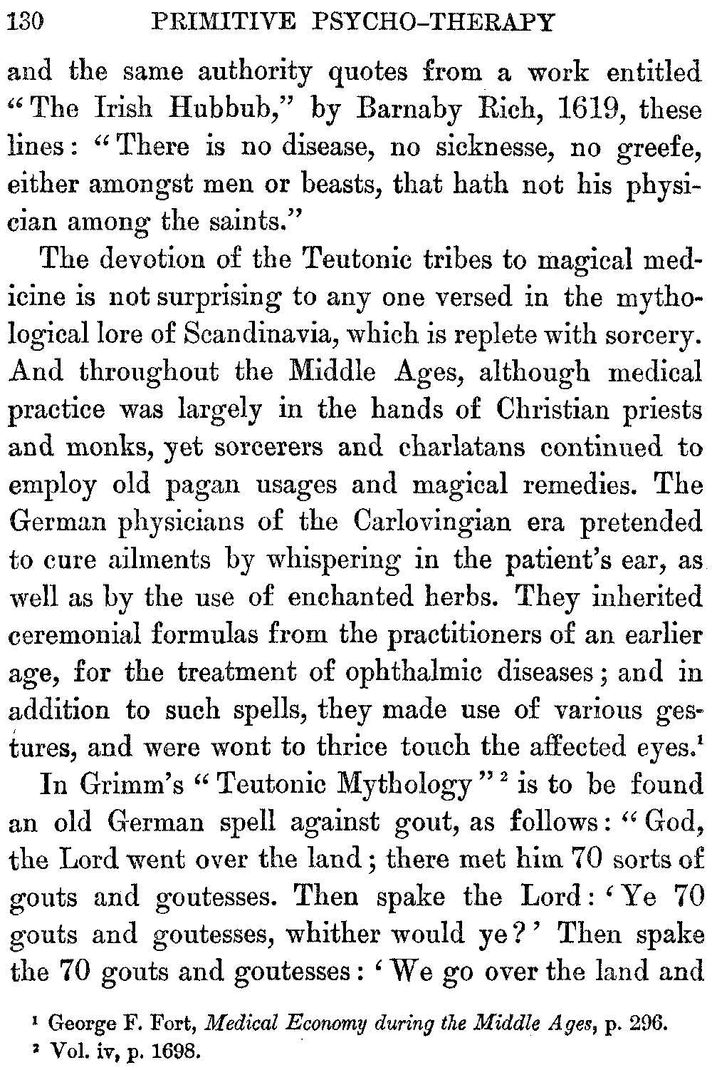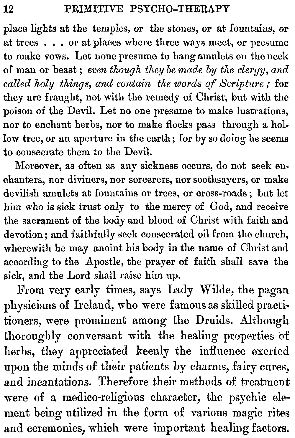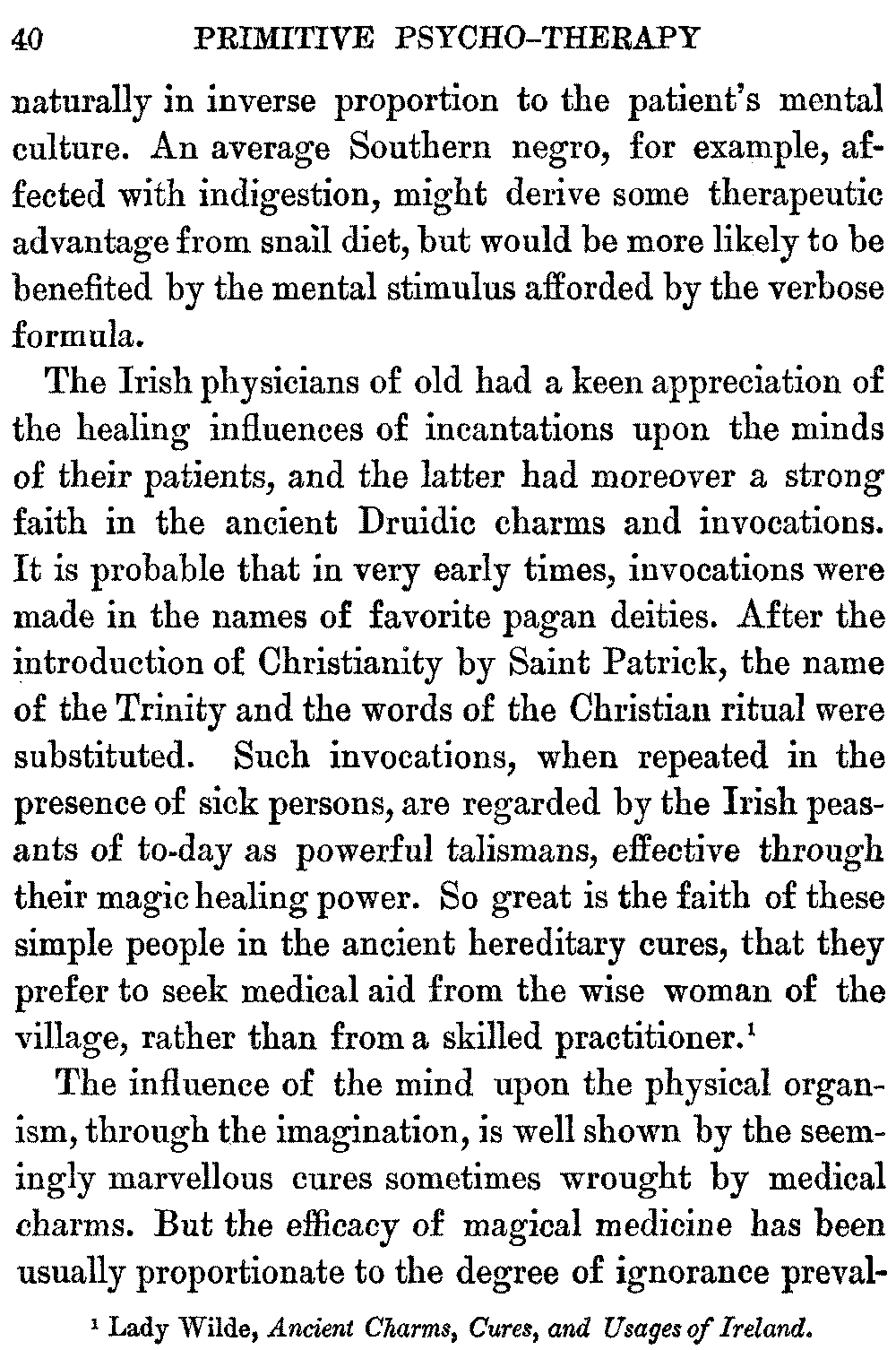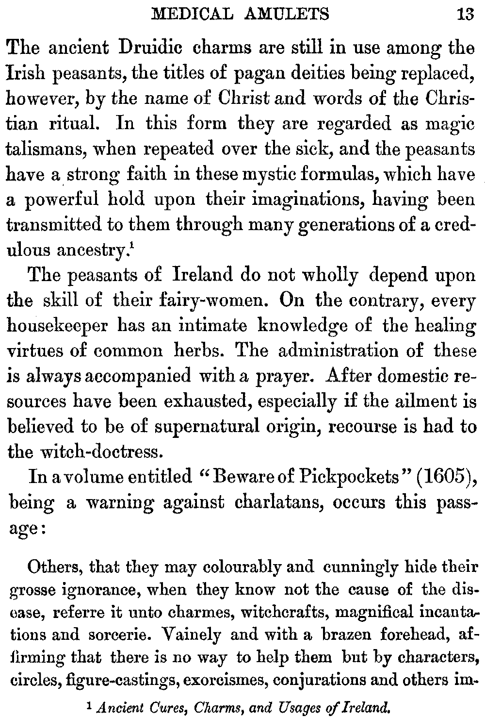 From very early times, says Lady Wilde, the pagan physicians of Ireland, who were famous as skilled practitioners, were prominent among the Druids. Although thoroughly conversant with the healing properties of herbs, they appreciated keenly the influence exerted upon the minds of their patients by charms, fairy cures, and incantations. Therefore their methods of treatment were of a medico-religious character, the psychic element being utilized in the form of various magic rites and ceremonies, which were important healing factors. [13]The ancient Druidic charms are still in use among the Irish peasants, the titles of pagan deities being replaced, however, by the name of Christ and words of the Christian ritual. In this form they are regarded as magic talismans, when repeated over the sick, and the peasants have a strong faith in these mystic formulas, which have a powerful hold upon their imaginations, having been transmitted to them through many generations of a credulous ancestry.[13:1]