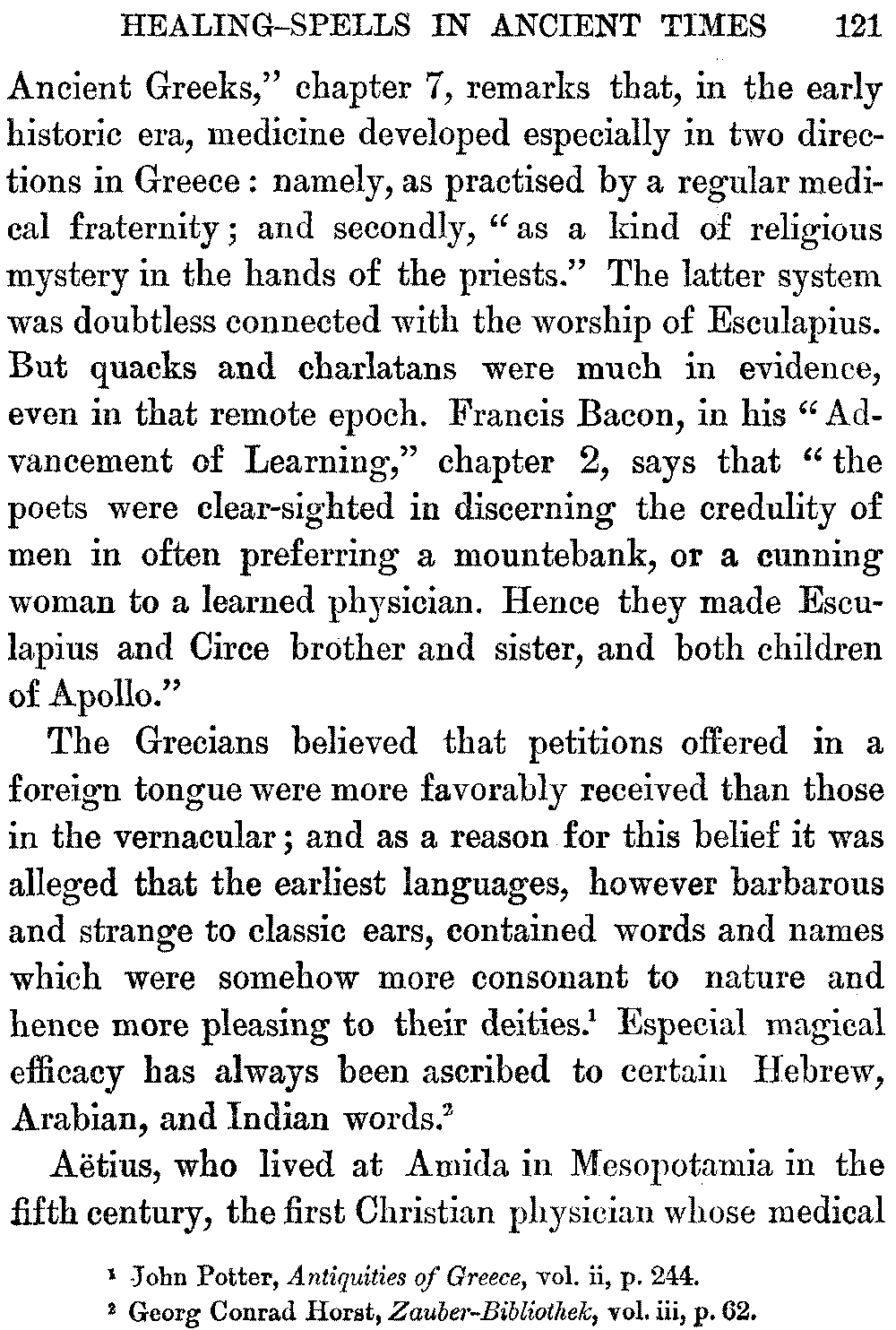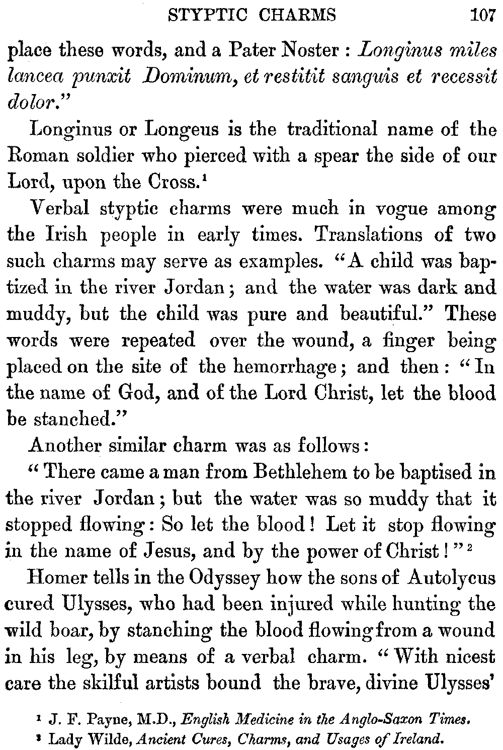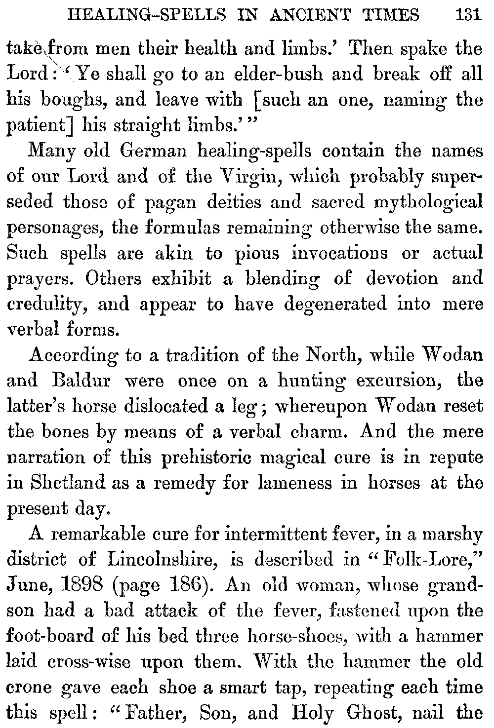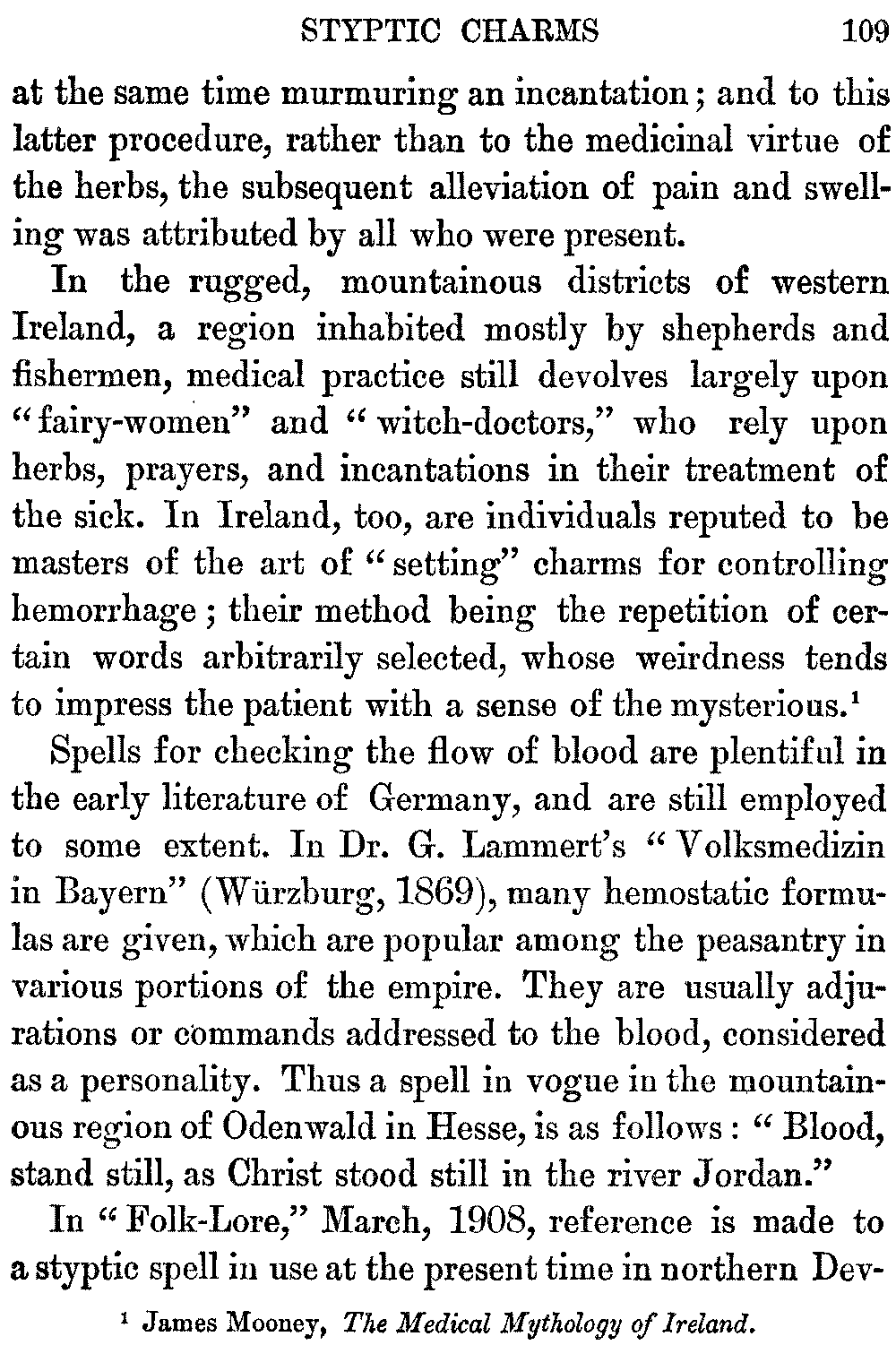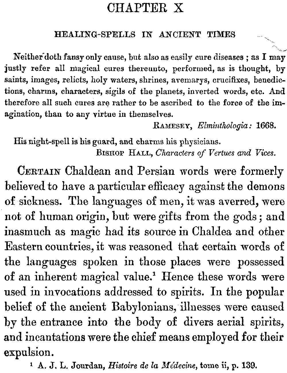 From very early times, says Lady Wilde, the pagan physicians of Ireland, who were famous as skilled practitioners, were prominent among the Druids. Although thoroughly conversant with the healing properties of herbs, they appreciated keenly the influence exerted upon the minds of their patients by charms, fairy cures, and incantations. Therefore their methods of treatment were of a medico-religious character, the psychic element being utilized in the form of various magic rites and ceremonies, which were important healing factors. [13]The ancient Druidic charms are still in use among the Irish peasants, the titles of pagan deities being replaced, however, by the name of Christ and words of the Christian ritual. In this form they are regarded as magic talismans, when repeated over the sick, and the peasants have a strong faith in these mystic formulas, which have a powerful hold upon their imaginations, having been transmitted to them through many generations of a credulous ancestry.[13:1]