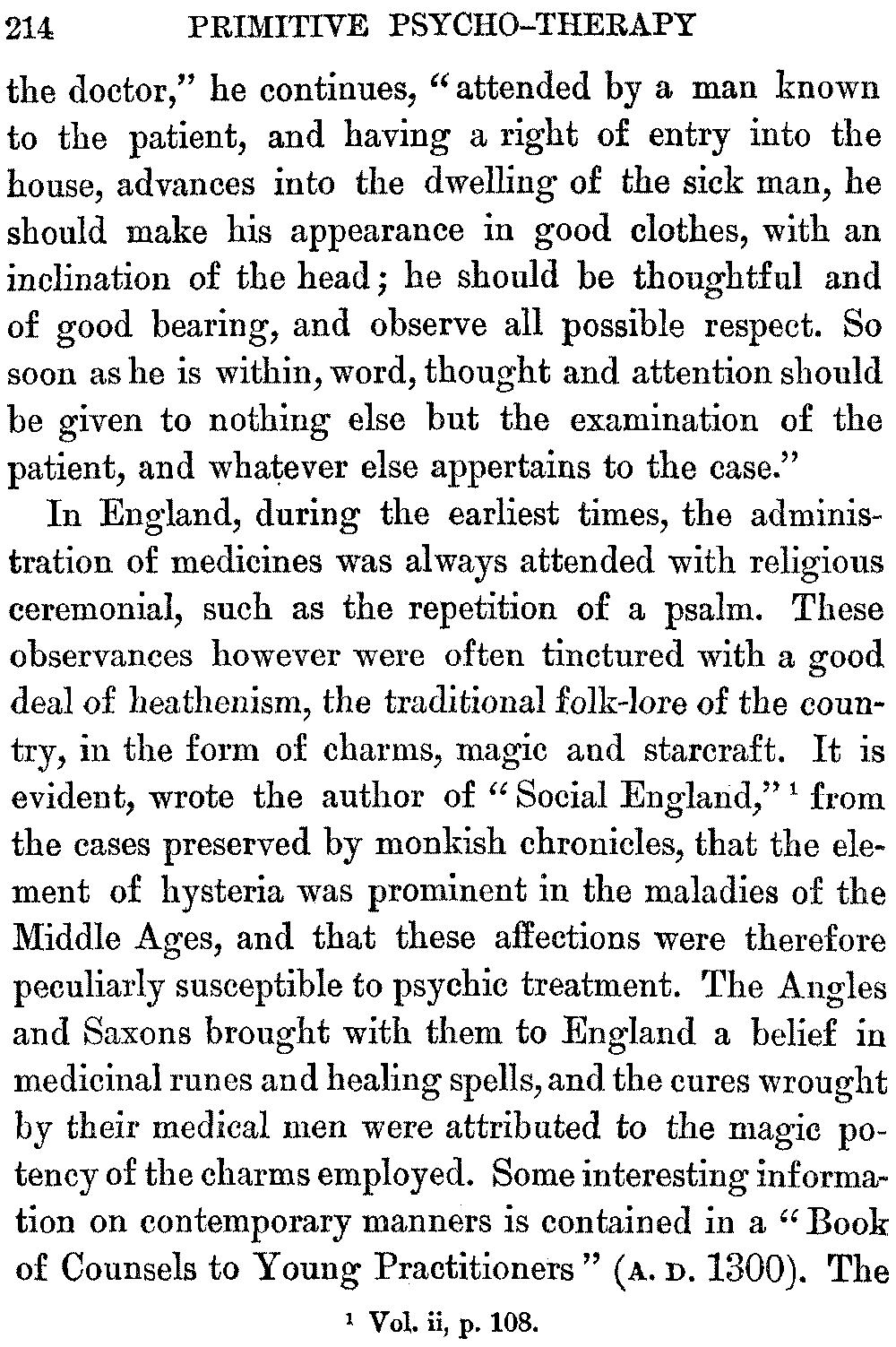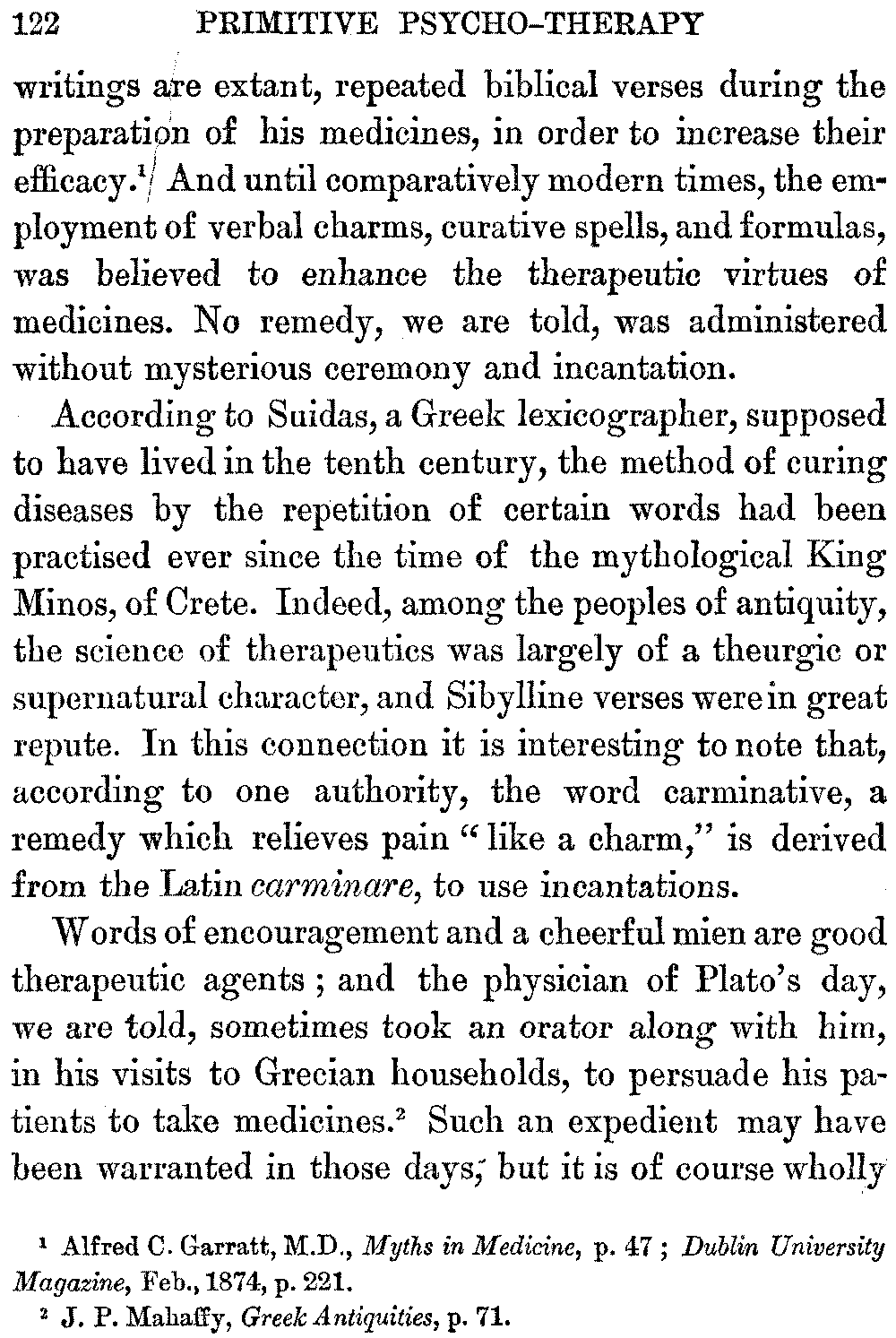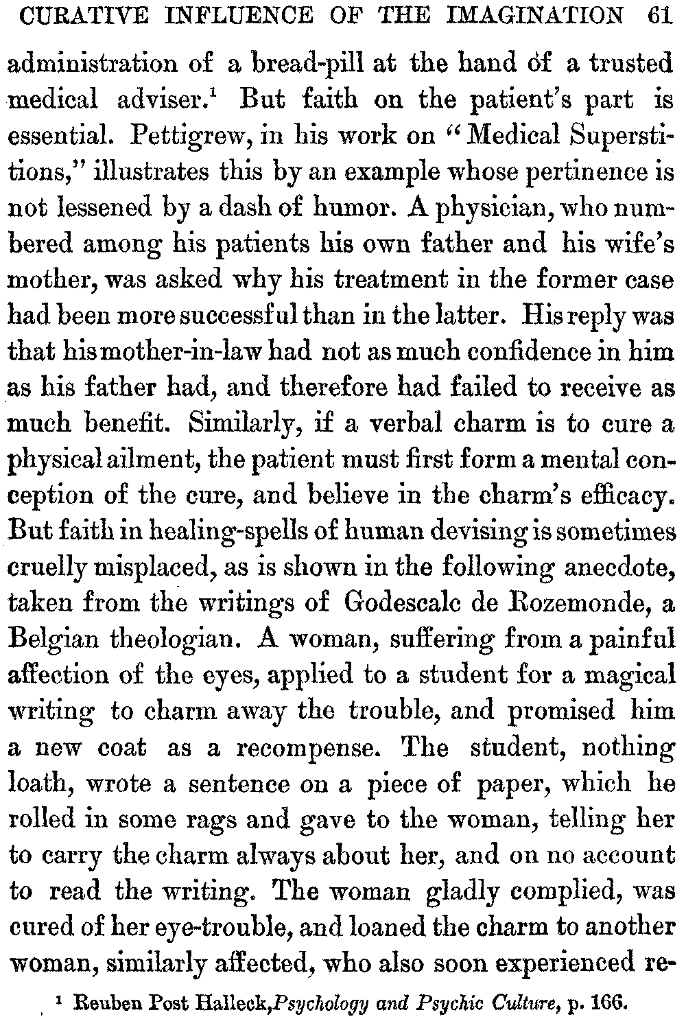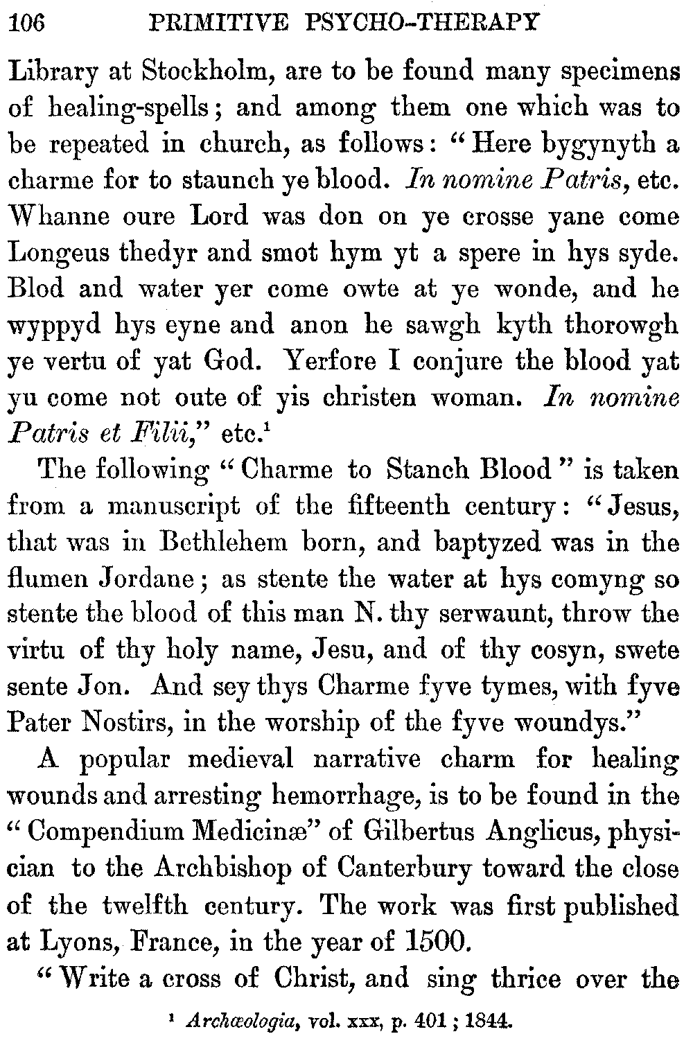 From very early times, says Lady Wilde, the pagan physicians of Ireland, who were famous as skilled practitioners, were prominent among the Druids. Although thoroughly conversant with the healing properties of herbs, they appreciated keenly the influence exerted upon the minds of their patients by charms, fairy cures, and incantations. Therefore their methods of treatment were of a medico-religious character, the psychic element being utilized in the form of various magic rites and ceremonies, which were important healing factors. [13]The ancient Druidic charms are still in use among the Irish peasants, the titles of pagan deities being replaced, however, by the name of Christ and words of the Christian ritual. In this form they are regarded as magic talismans, when repeated over the sick, and the peasants have a strong faith in these mystic formulas, which have a powerful hold upon their imaginations, having been transmitted to them through many generations of a credulous ancestry.[13:1]