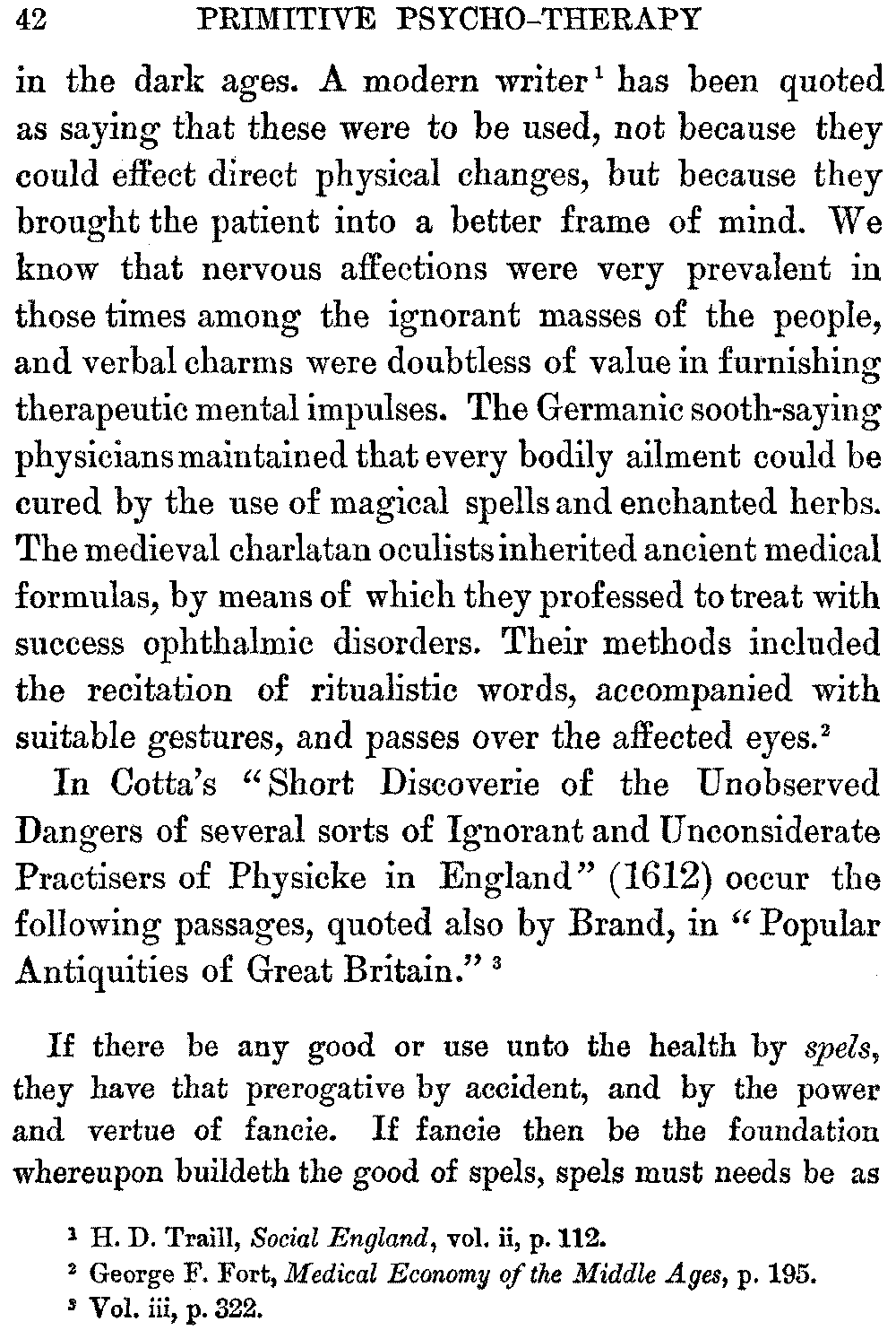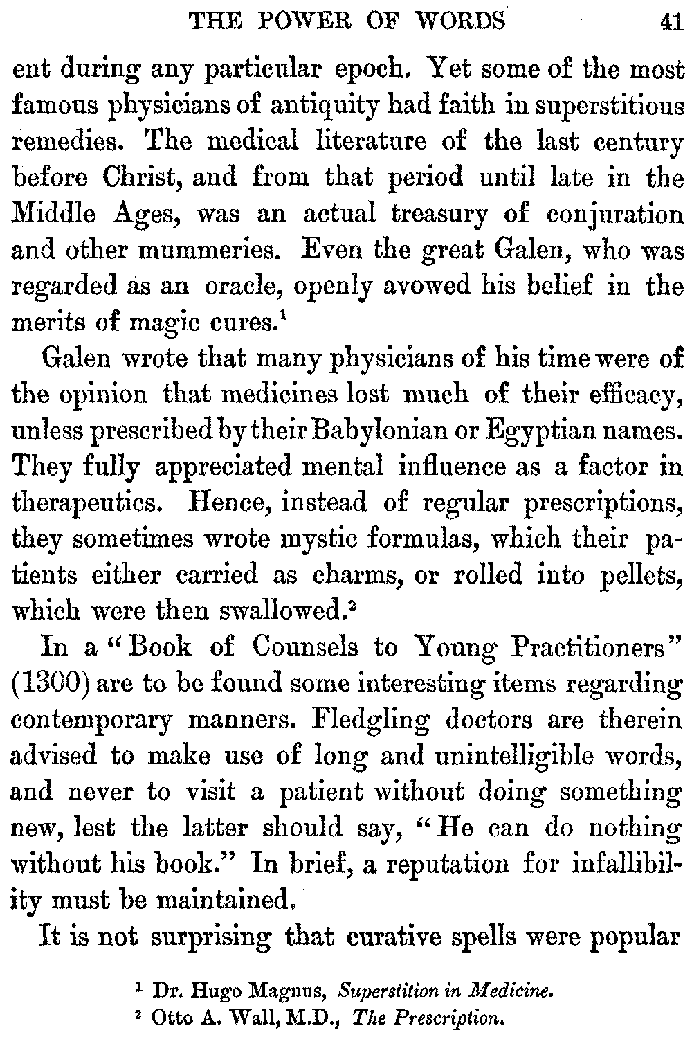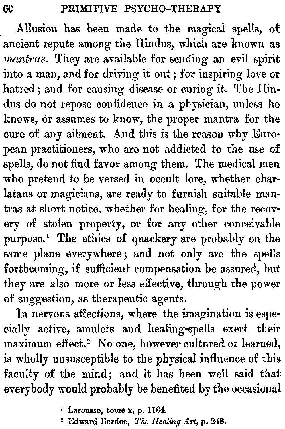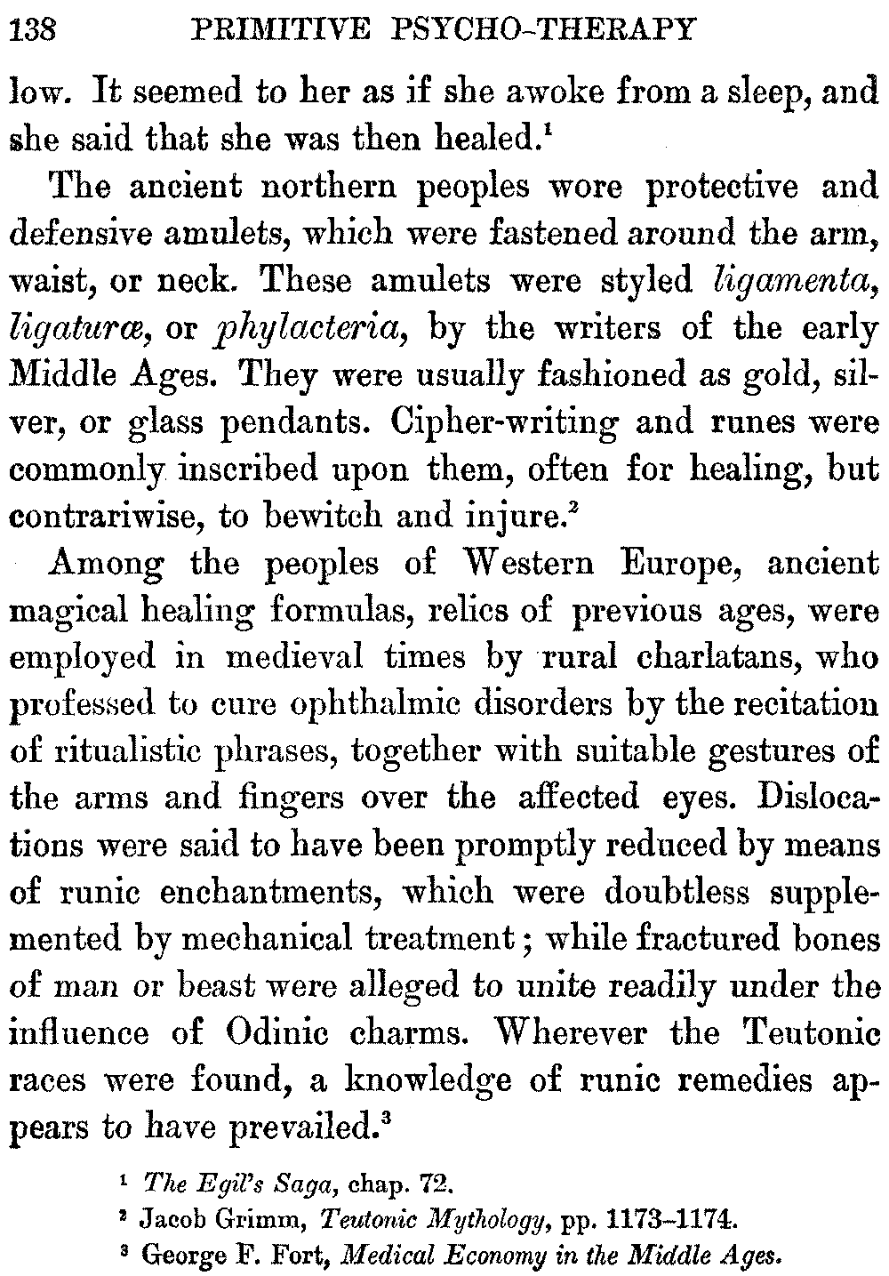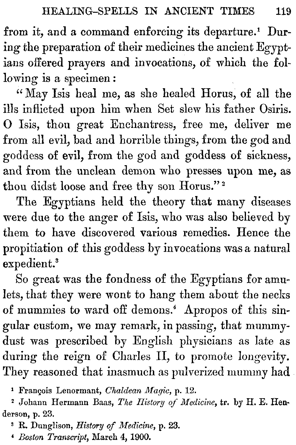 From very early times, says Lady Wilde, the pagan physicians of Ireland, who were famous as skilled practitioners, were prominent among the Druids. Although thoroughly conversant with the healing properties of herbs, they appreciated keenly the influence exerted upon the minds of their patients by charms, fairy cures, and incantations. Therefore their methods of treatment were of a medico-religious character, the psychic element being utilized in the form of various magic rites and ceremonies, which were important healing factors. [13]The ancient Druidic charms are still in use among the Irish peasants, the titles of pagan deities being replaced, however, by the name of Christ and words of the Christian ritual. In this form they are regarded as magic talismans, when repeated over the sick, and the peasants have a strong faith in these mystic formulas, which have a powerful hold upon their imaginations, having been transmitted to them through many generations of a credulous ancestry.[13:1]