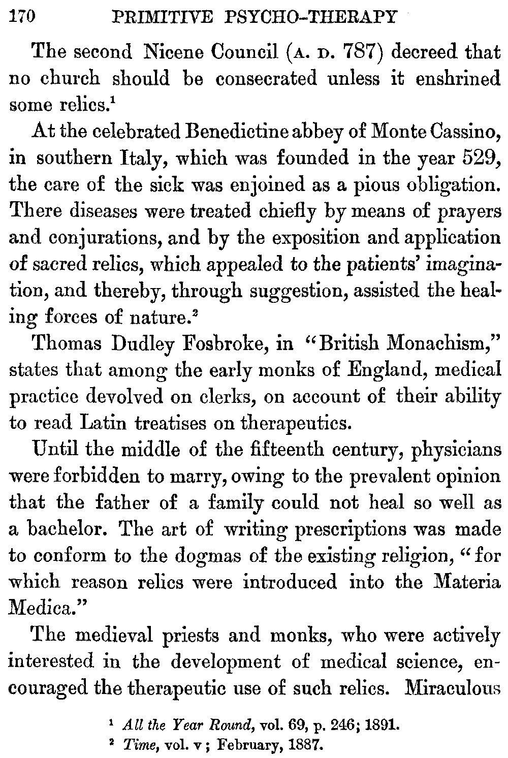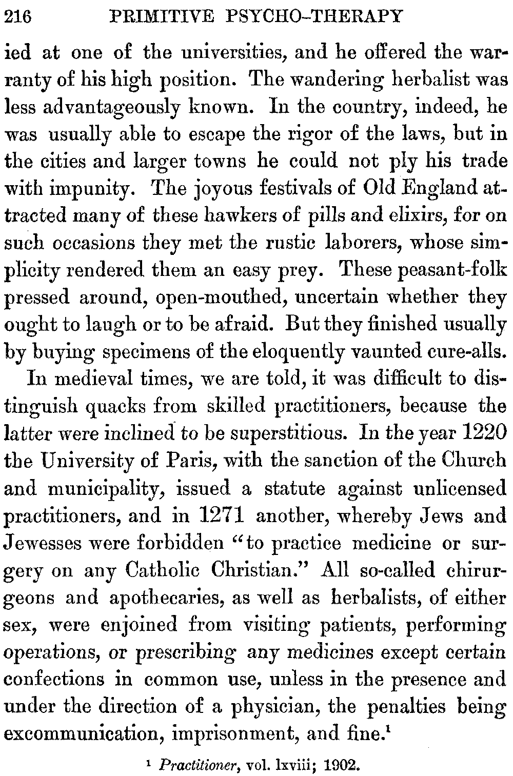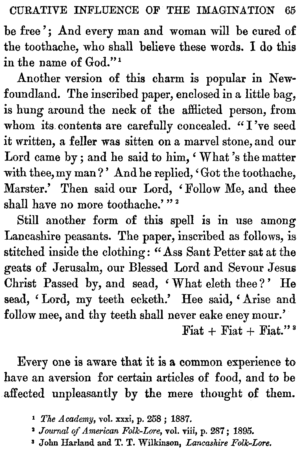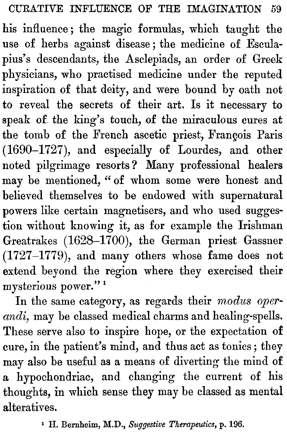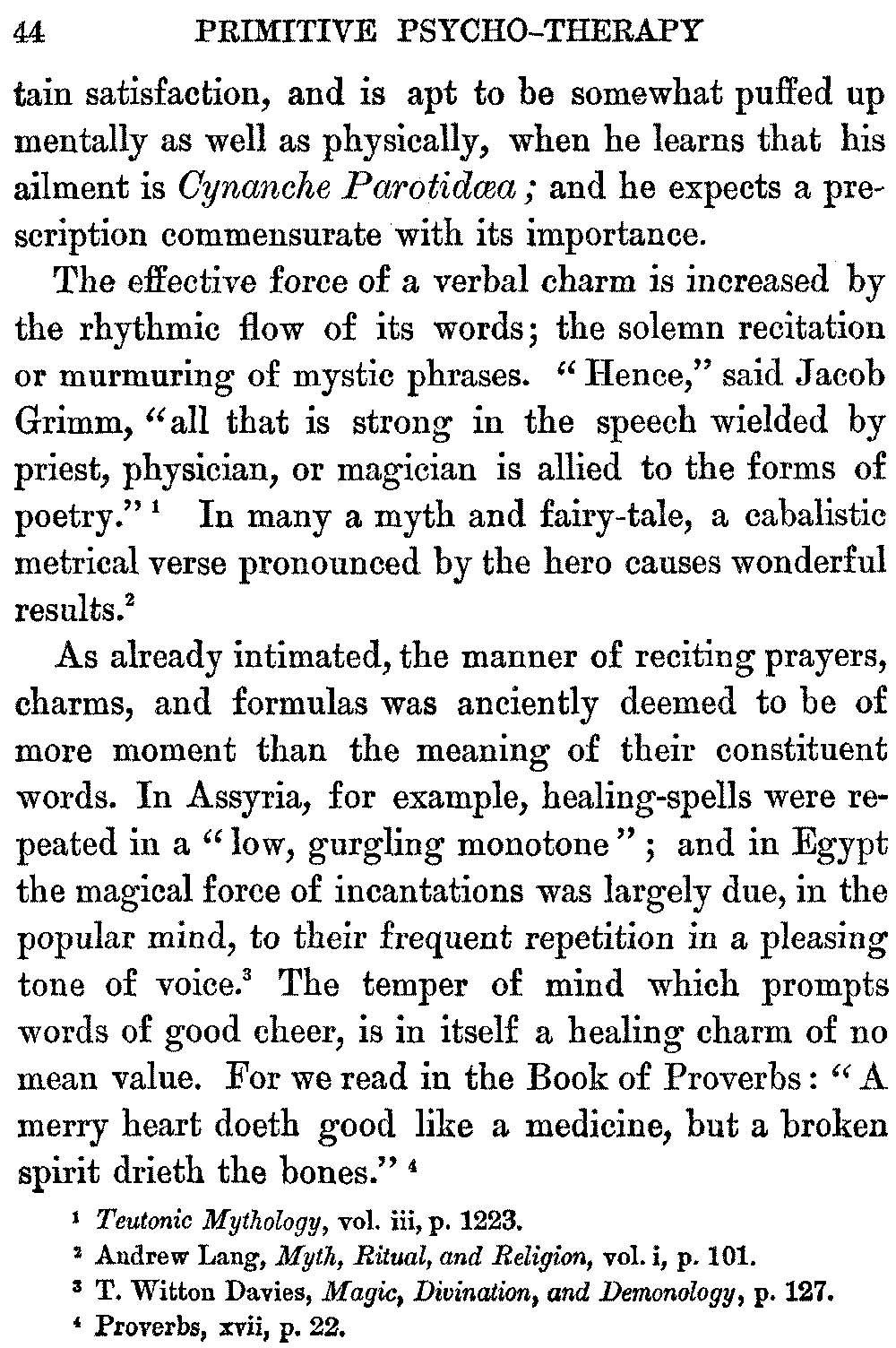 From very early times, says Lady Wilde, the pagan physicians of Ireland, who were famous as skilled practitioners, were prominent among the Druids. Although thoroughly conversant with the healing properties of herbs, they appreciated keenly the influence exerted upon the minds of their patients by charms, fairy cures, and incantations. Therefore their methods of treatment were of a medico-religious character, the psychic element being utilized in the form of various magic rites and ceremonies, which were important healing factors. [13]The ancient Druidic charms are still in use among the Irish peasants, the titles of pagan deities being replaced, however, by the name of Christ and words of the Christian ritual. In this form they are regarded as magic talismans, when repeated over the sick, and the peasants have a strong faith in these mystic formulas, which have a powerful hold upon their imaginations, having been transmitted to them through many generations of a credulous ancestry.[13:1]