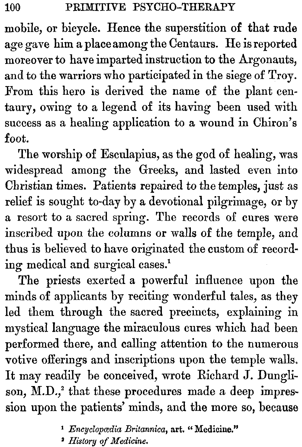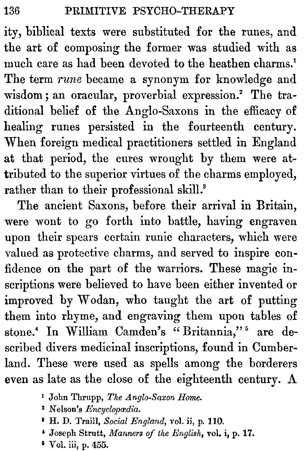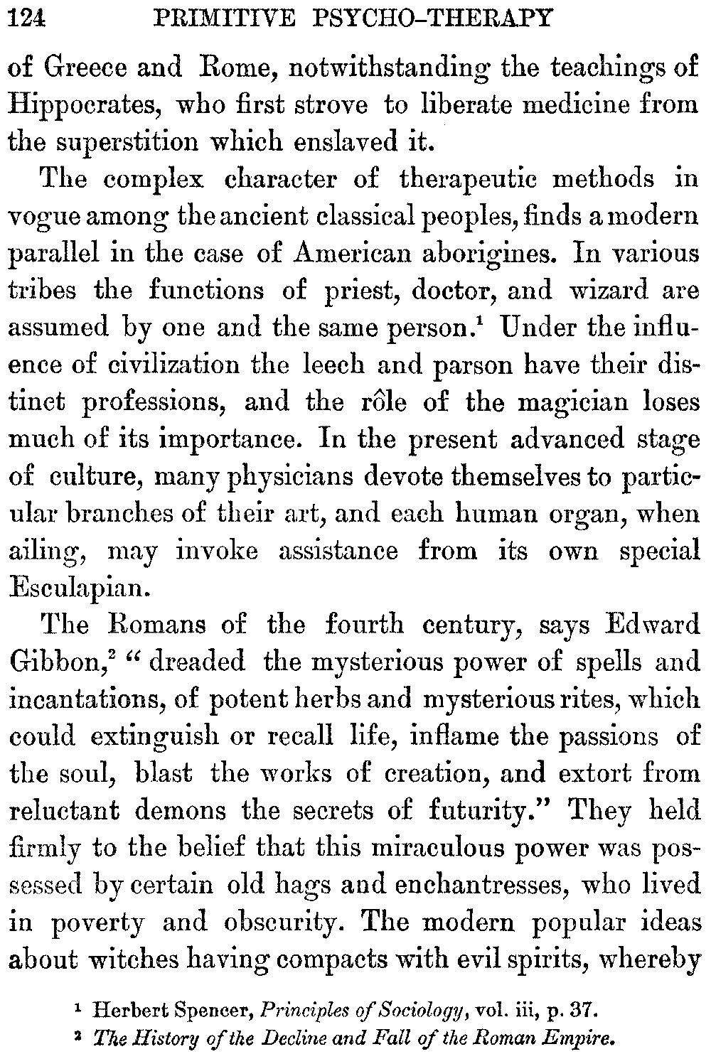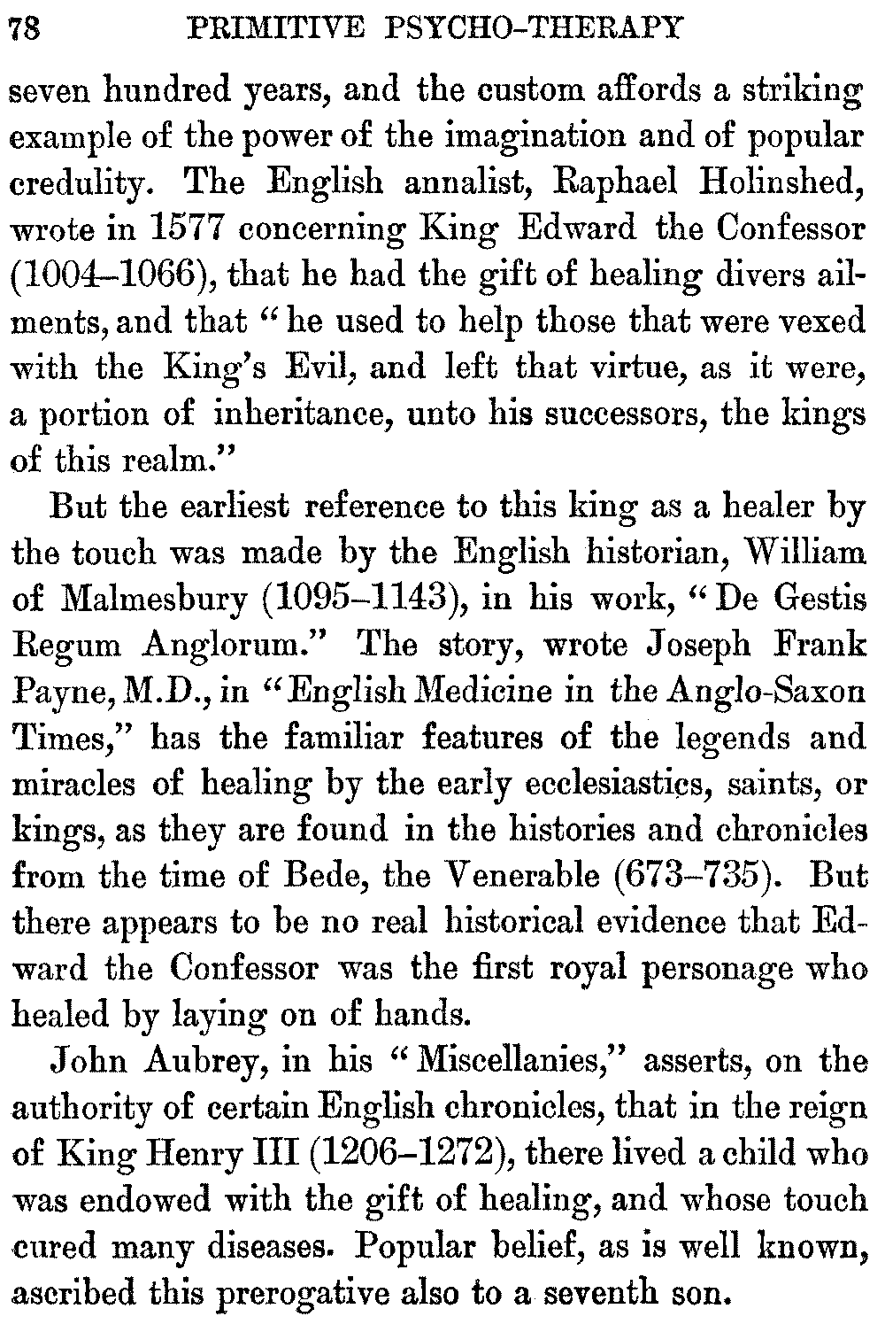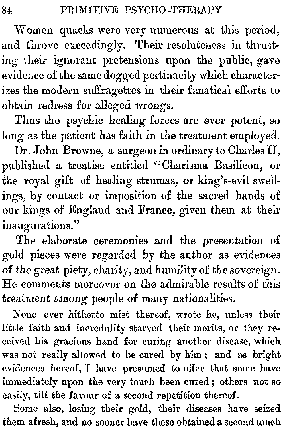 From very early times, says Lady Wilde, the pagan physicians of Ireland, who were famous as skilled practitioners, were prominent among the Druids. Although thoroughly conversant with the healing properties of herbs, they appreciated keenly the influence exerted upon the minds of their patients by charms, fairy cures, and incantations. Therefore their methods of treatment were of a medico-religious character, the psychic element being utilized in the form of various magic rites and ceremonies, which were important healing factors. [13]The ancient Druidic charms are still in use among the Irish peasants, the titles of pagan deities being replaced, however, by the name of Christ and words of the Christian ritual. In this form they are regarded as magic talismans, when repeated over the sick, and the peasants have a strong faith in these mystic formulas, which have a powerful hold upon their imaginations, having been transmitted to them through many generations of a credulous ancestry.[13:1]