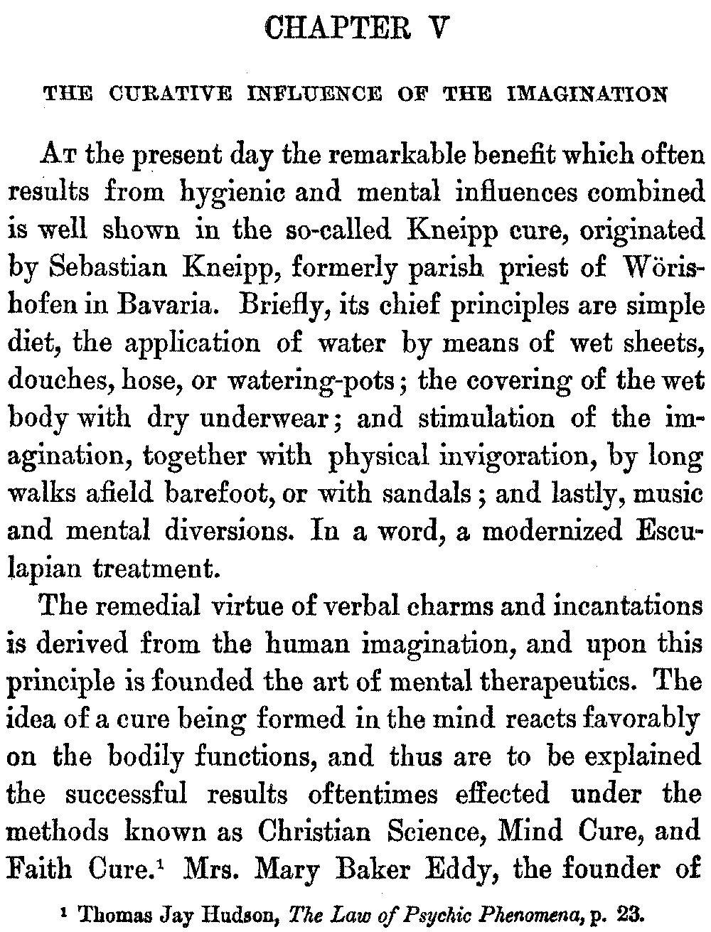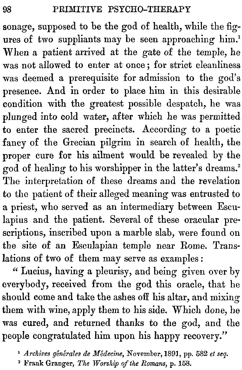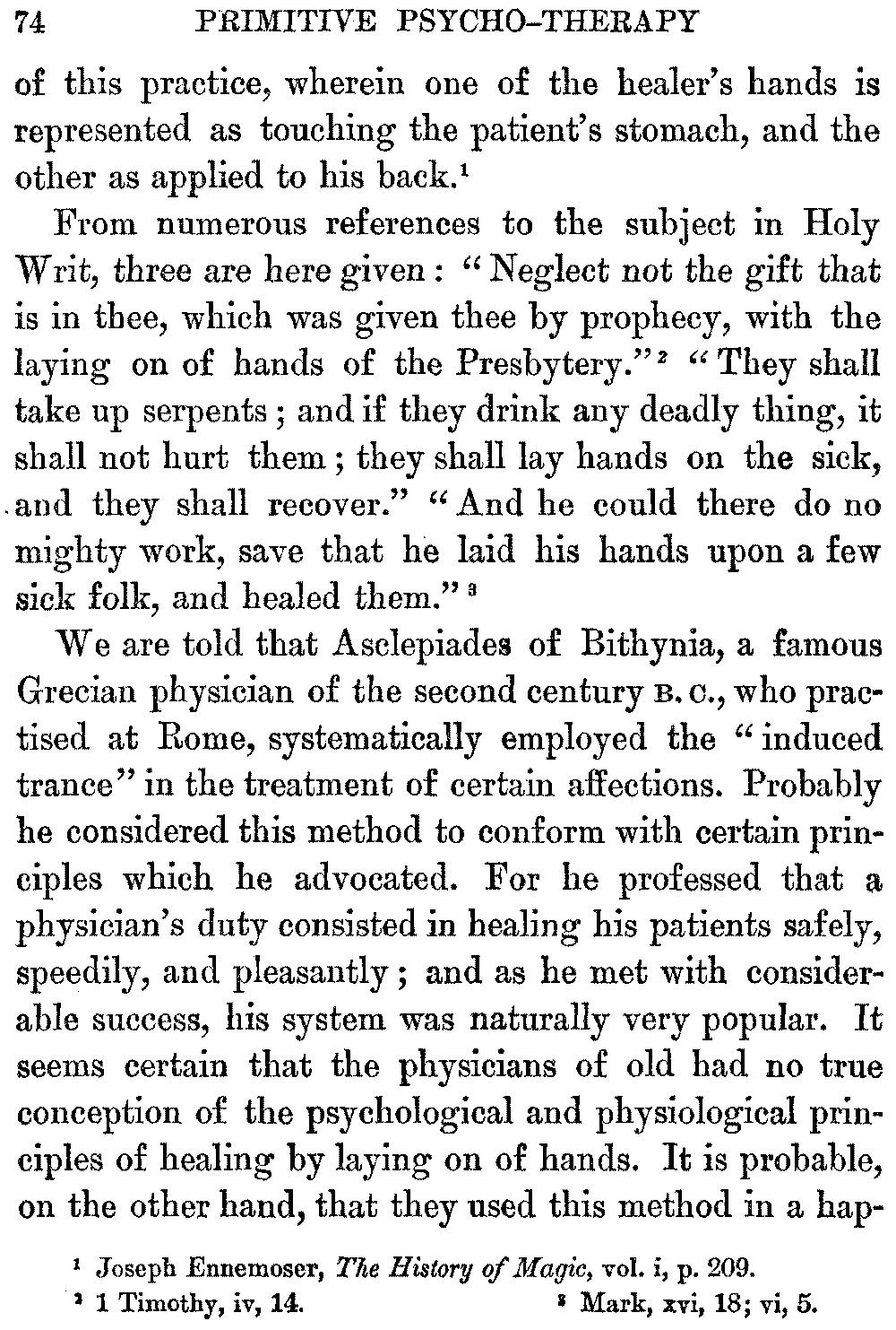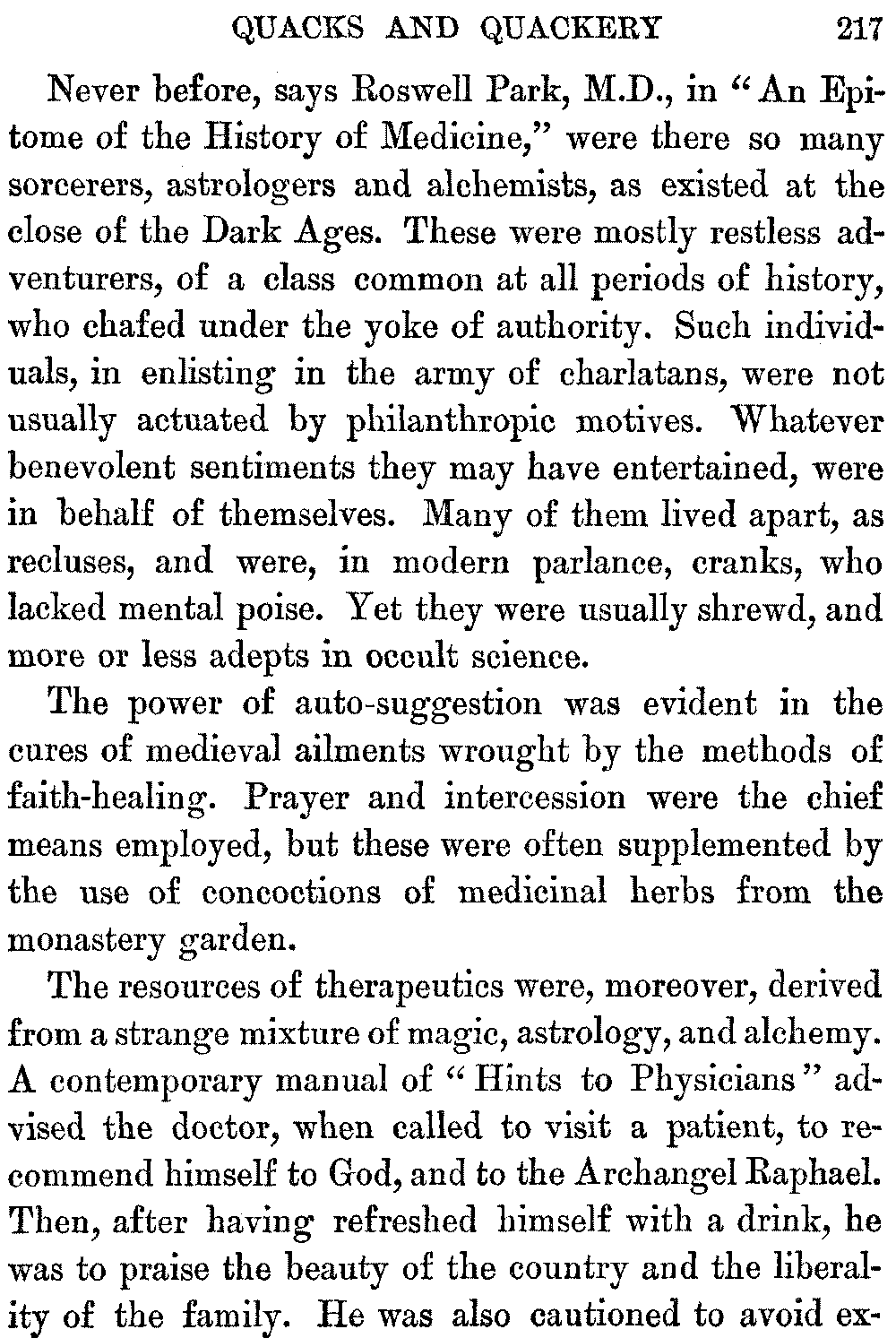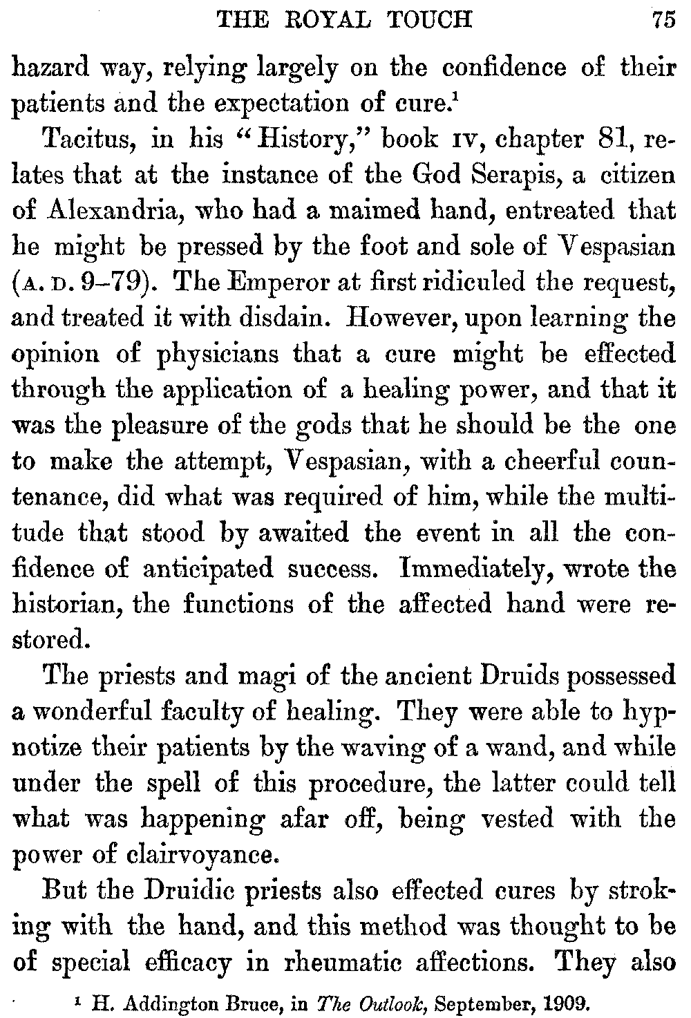 From very early times, says Lady Wilde, the pagan physicians of Ireland, who were famous as skilled practitioners, were prominent among the Druids. Although thoroughly conversant with the healing properties of herbs, they appreciated keenly the influence exerted upon the minds of their patients by charms, fairy cures, and incantations. Therefore their methods of treatment were of a medico-religious character, the psychic element being utilized in the form of various magic rites and ceremonies, which were important healing factors. [13]The ancient Druidic charms are still in use among the Irish peasants, the titles of pagan deities being replaced, however, by the name of Christ and words of the Christian ritual. In this form they are regarded as magic talismans, when repeated over the sick, and the peasants have a strong faith in these mystic formulas, which have a powerful hold upon their imaginations, having been transmitted to them through many generations of a credulous ancestry.[13:1]