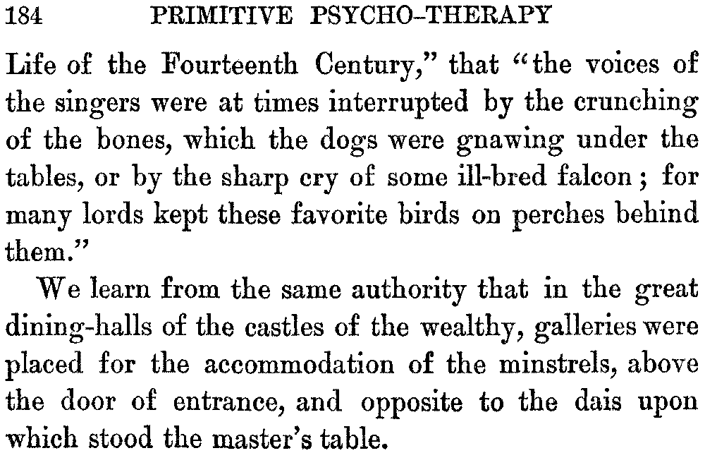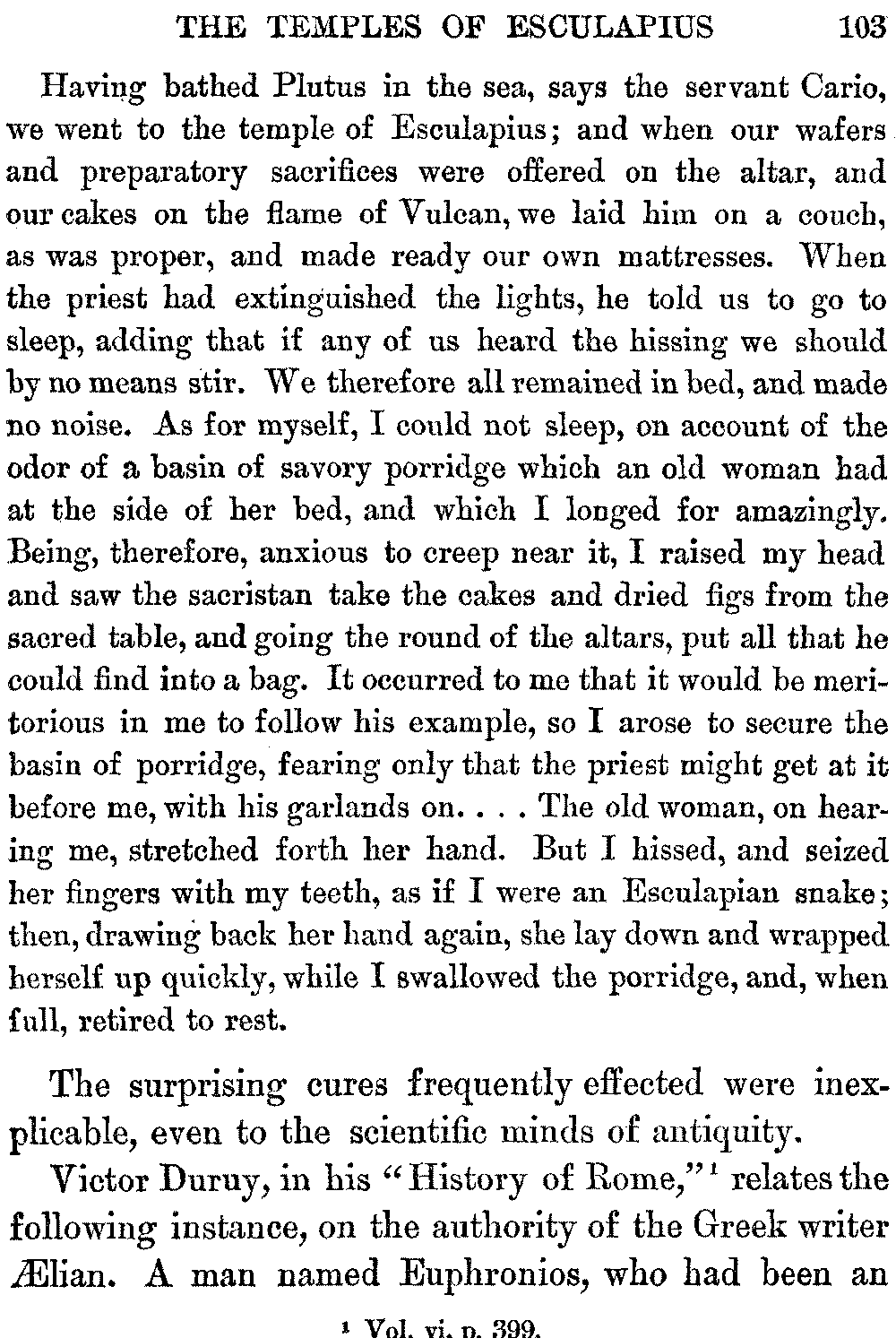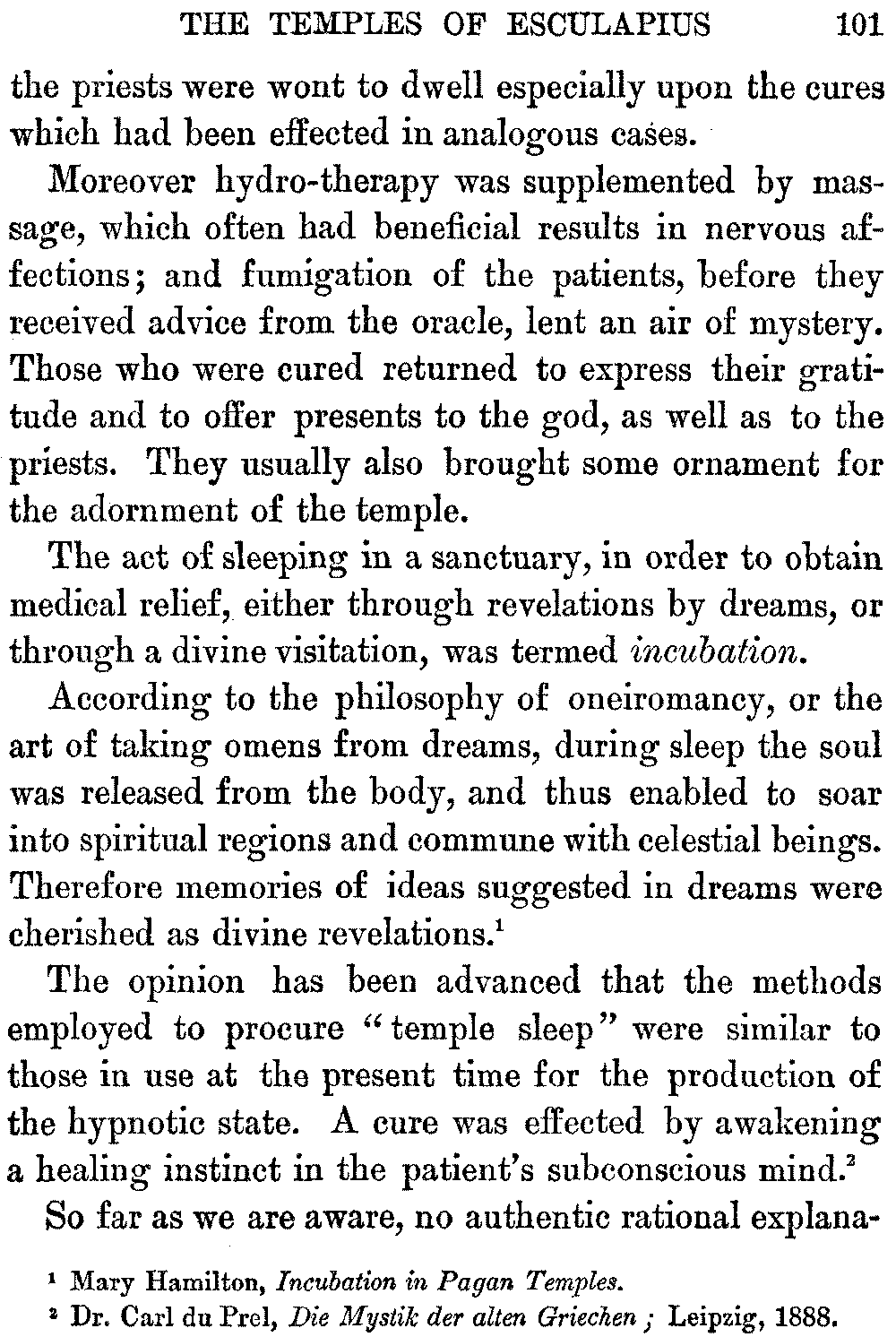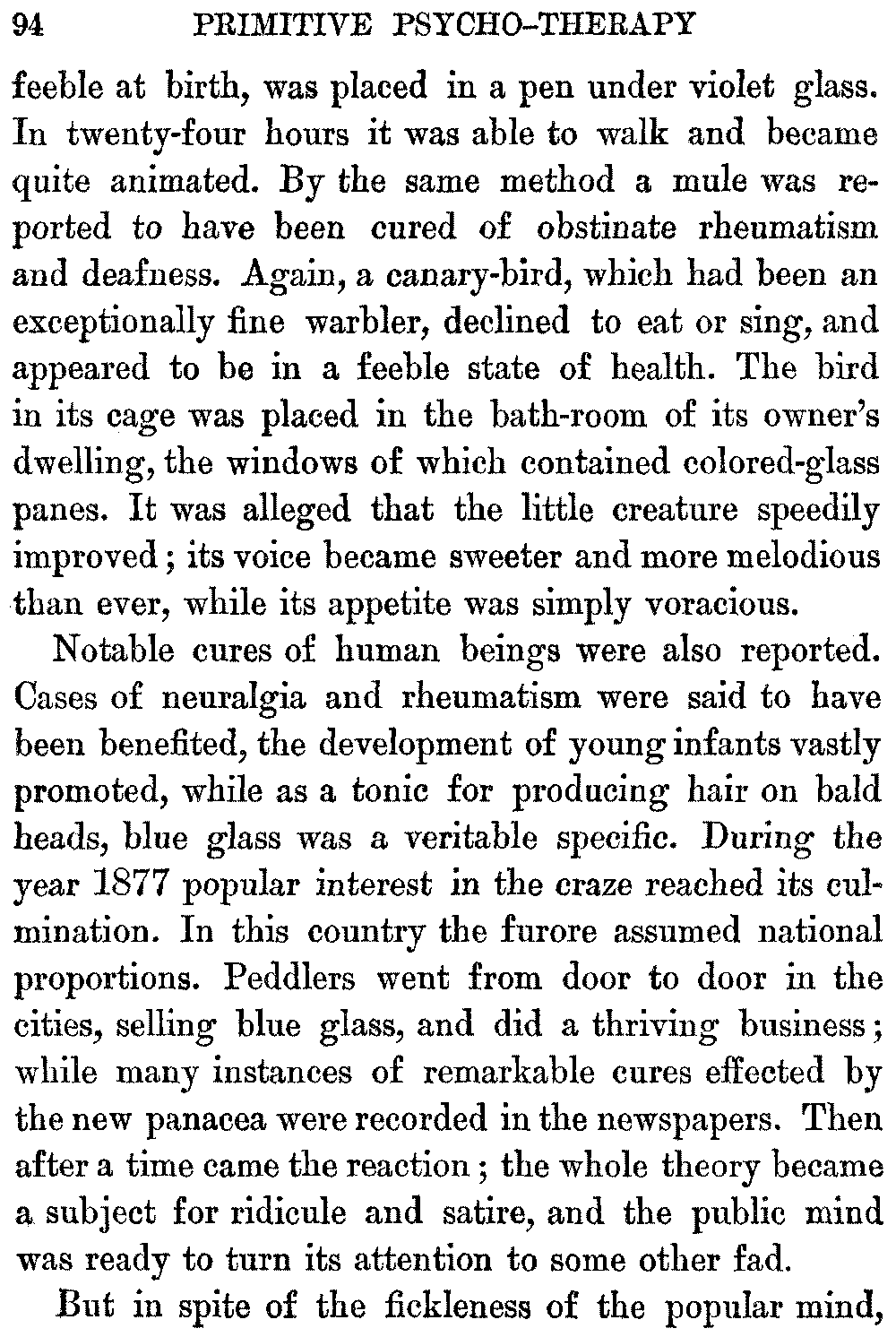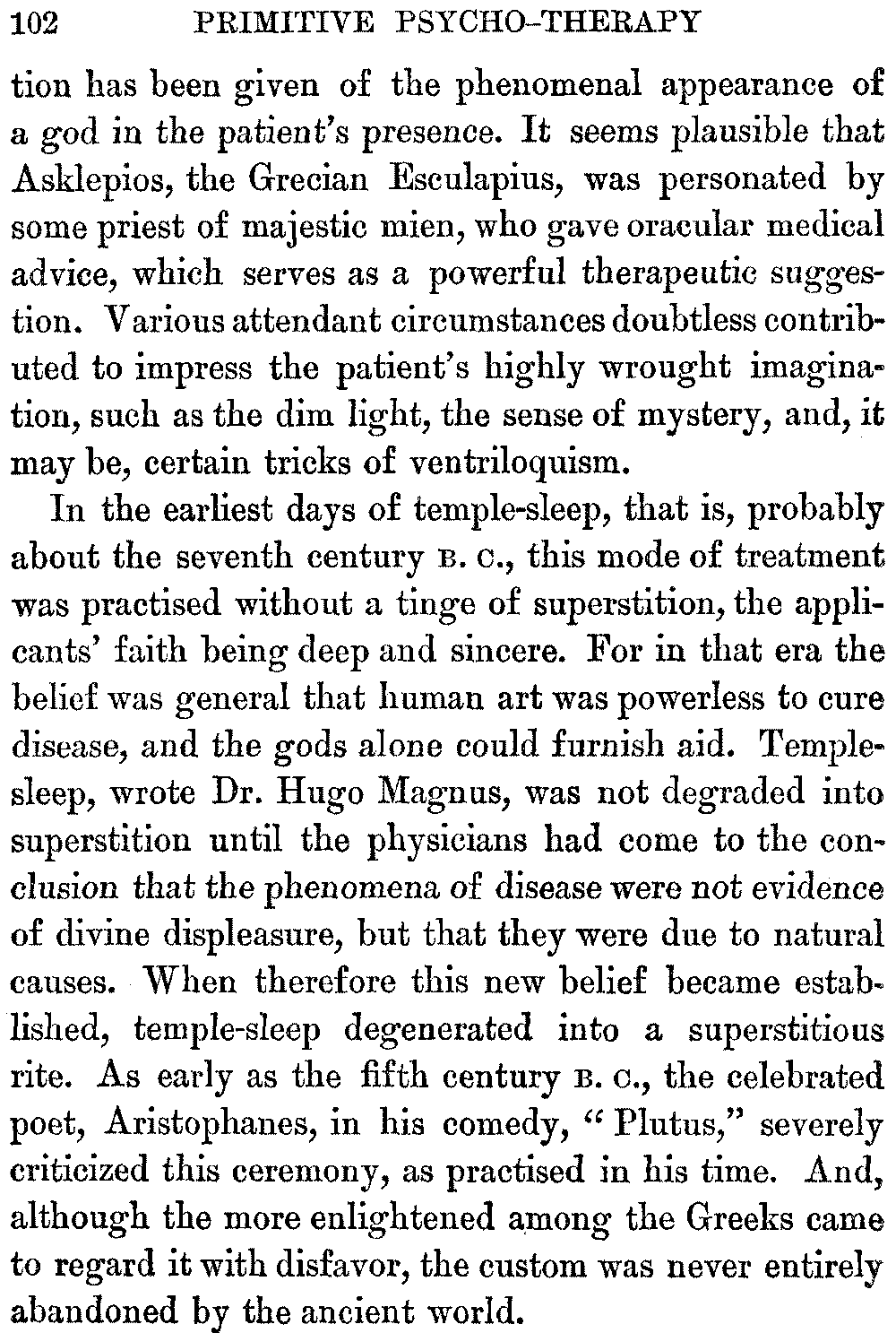 From very early times, says Lady Wilde, the pagan physicians of Ireland, who were famous as skilled practitioners, were prominent among the Druids. Although thoroughly conversant with the healing properties of herbs, they appreciated keenly the influence exerted upon the minds of their patients by charms, fairy cures, and incantations. Therefore their methods of treatment were of a medico-religious character, the psychic element being utilized in the form of various magic rites and ceremonies, which were important healing factors. [13]The ancient Druidic charms are still in use among the Irish peasants, the titles of pagan deities being replaced, however, by the name of Christ and words of the Christian ritual. In this form they are regarded as magic talismans, when repeated over the sick, and the peasants have a strong faith in these mystic formulas, which have a powerful hold upon their imaginations, having been transmitted to them through many generations of a credulous ancestry.[13:1]
