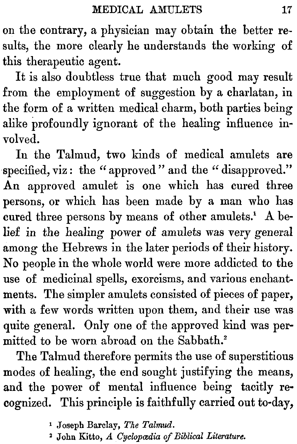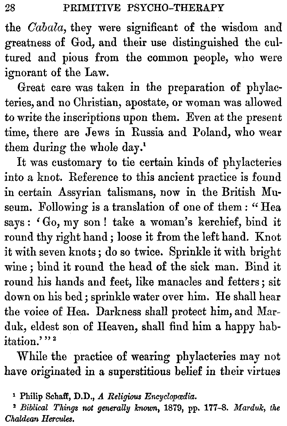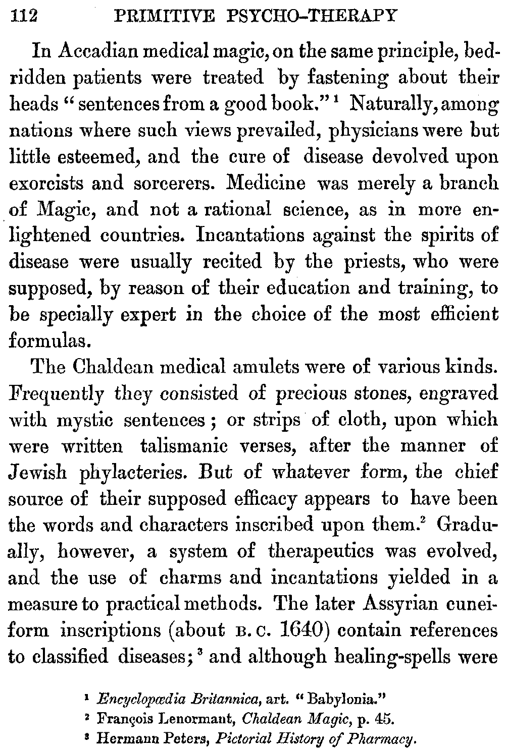 In the rabbinical medicine, occult methods, involving astrology and the wearing of parchment amulets and charms, were more in evidence than the use of drugs; and among the inhabitants of ancient Babylon, traditional spells for driving out the demons of sickness were much employed.[9:2]