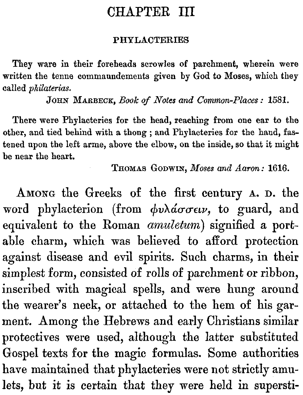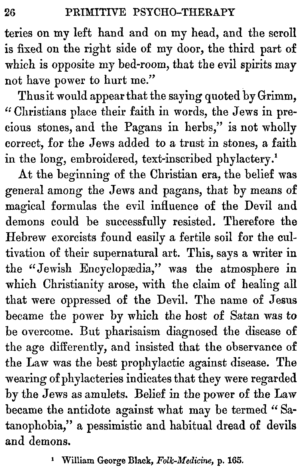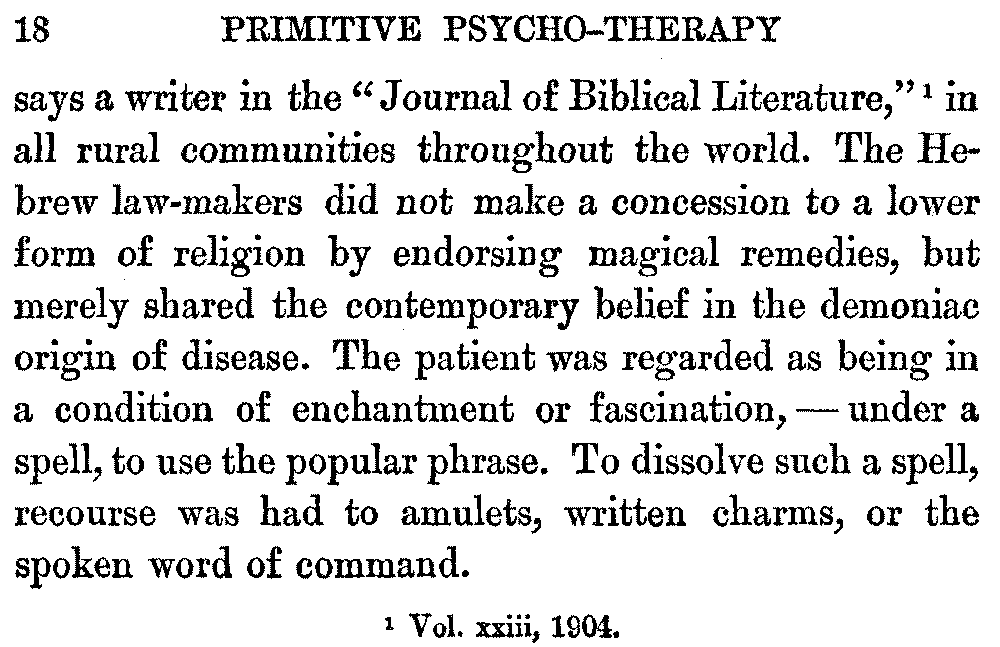In the rabbinical medicine, occult methods, involving astrology and the wearing of parchment amulets and charms, were more in evidence than the use of drugs; and among the inhabitants of ancient Babylon, traditional spells for driving out the demons of sickness were much employed.[9:2]