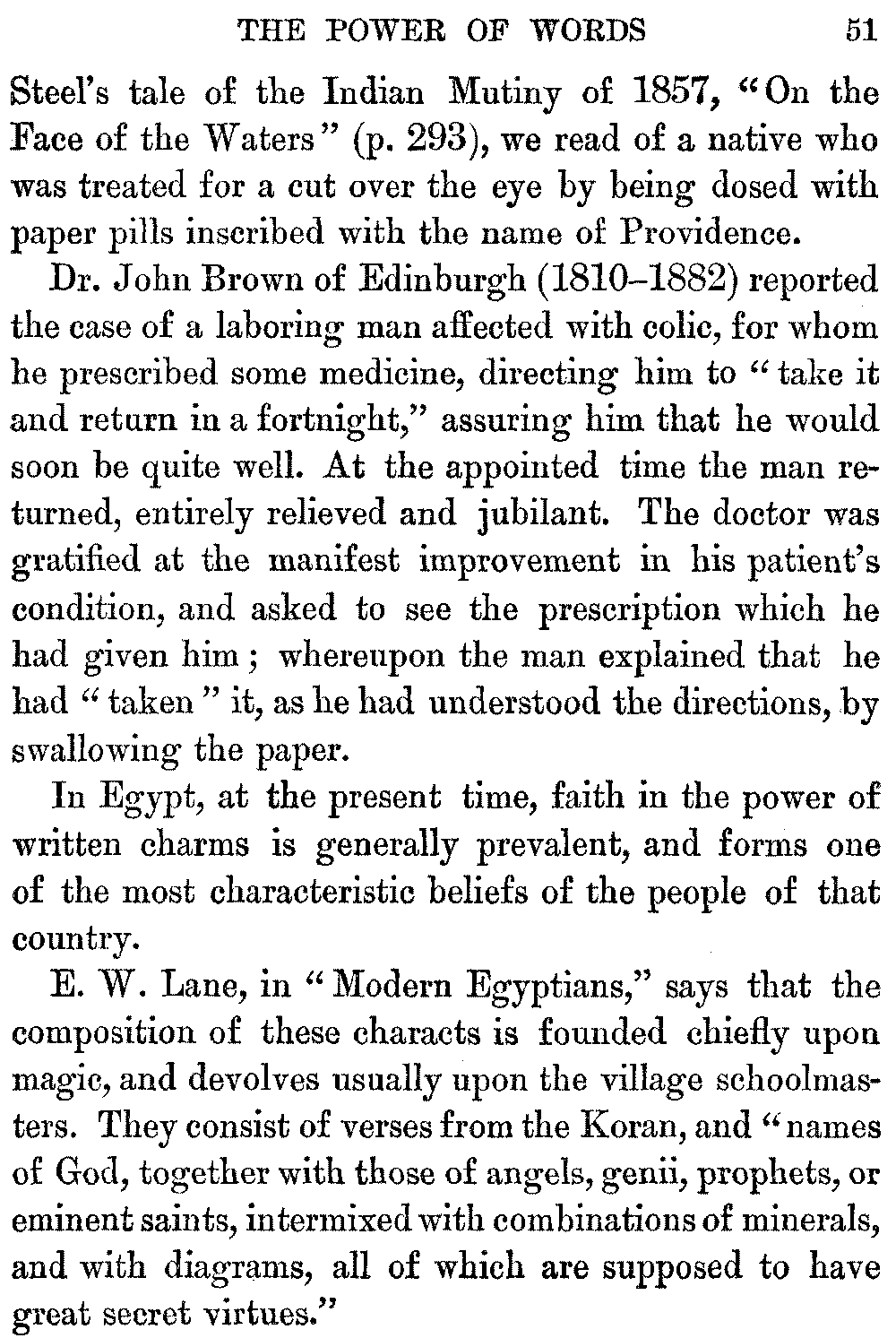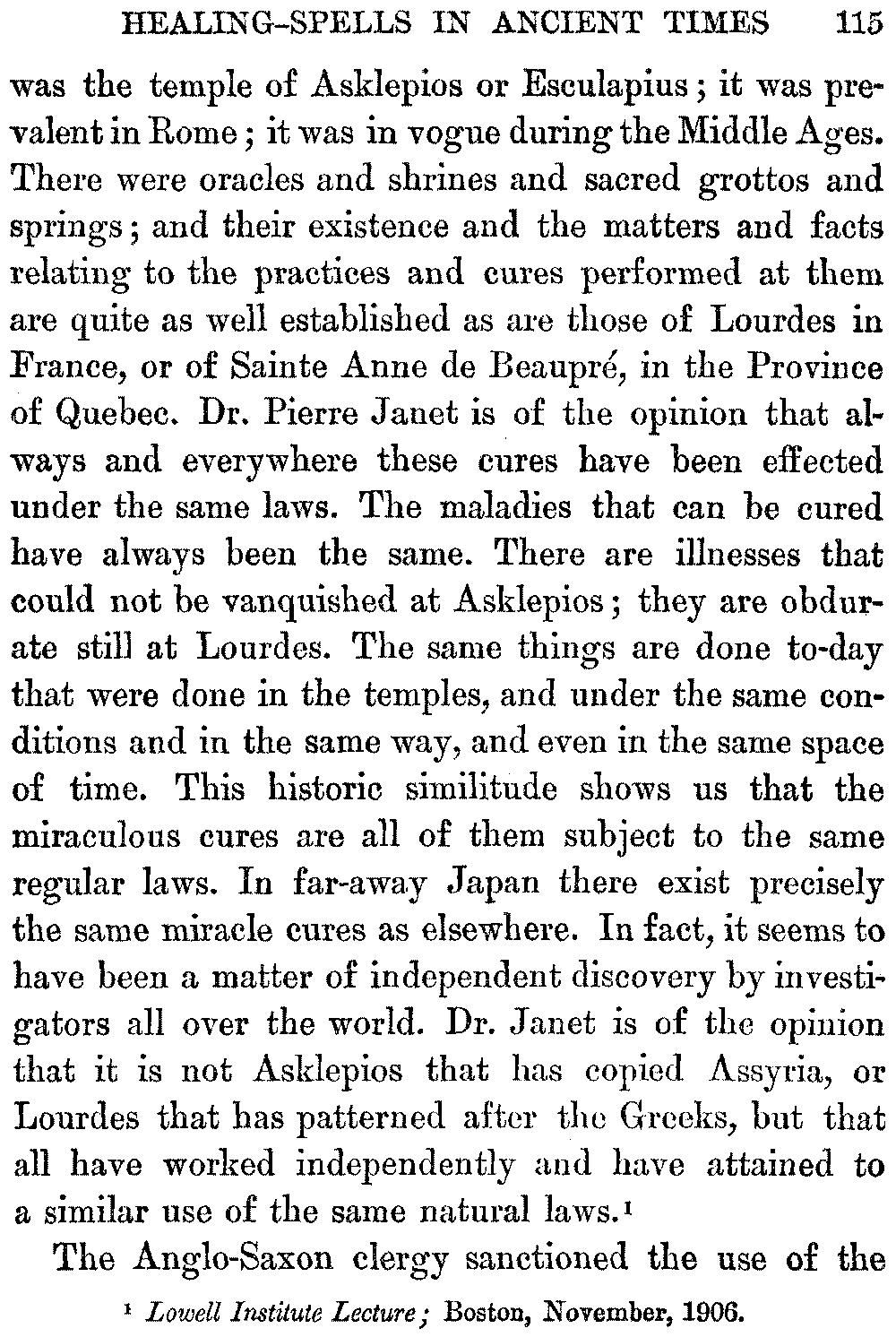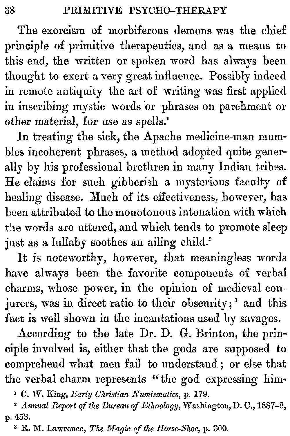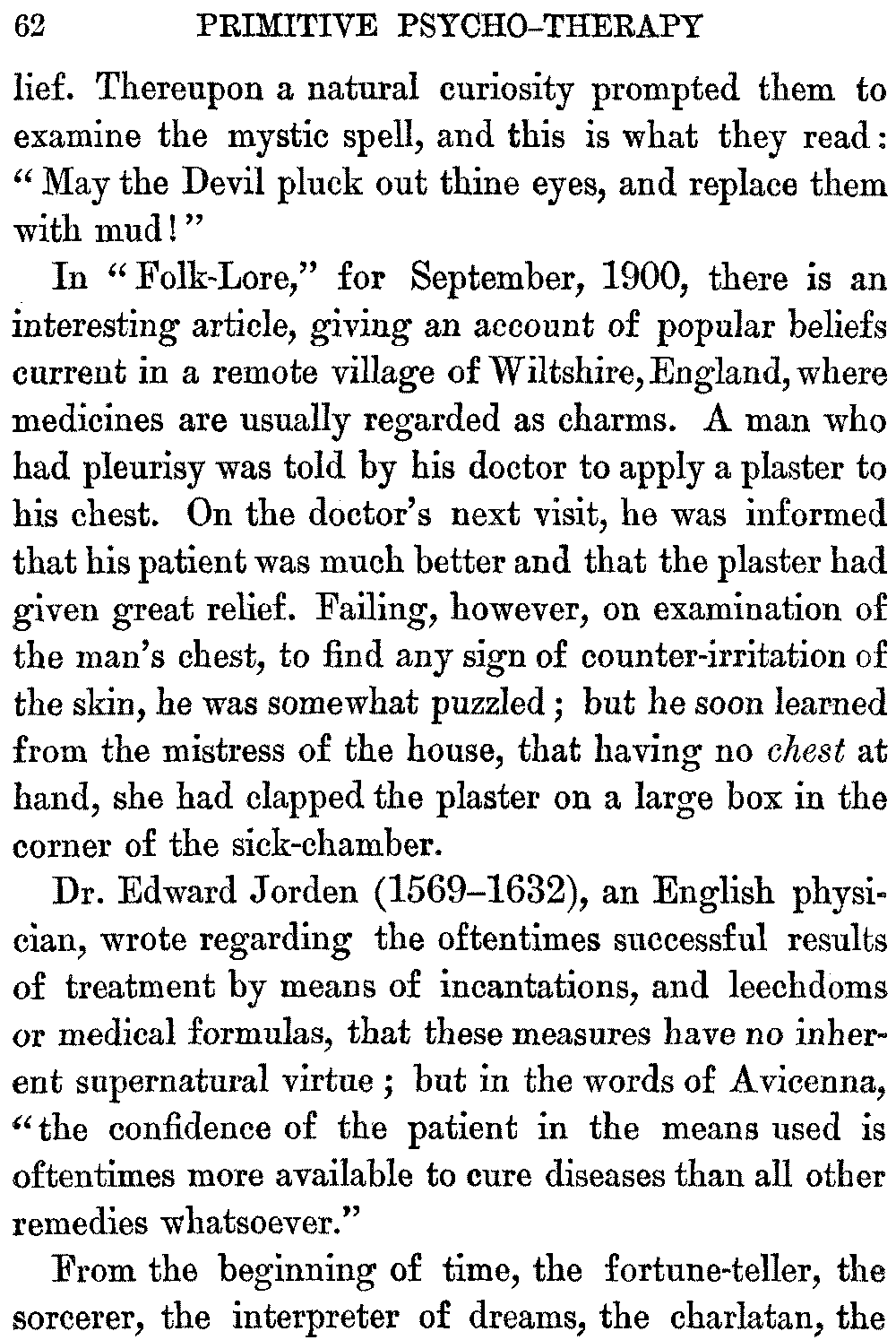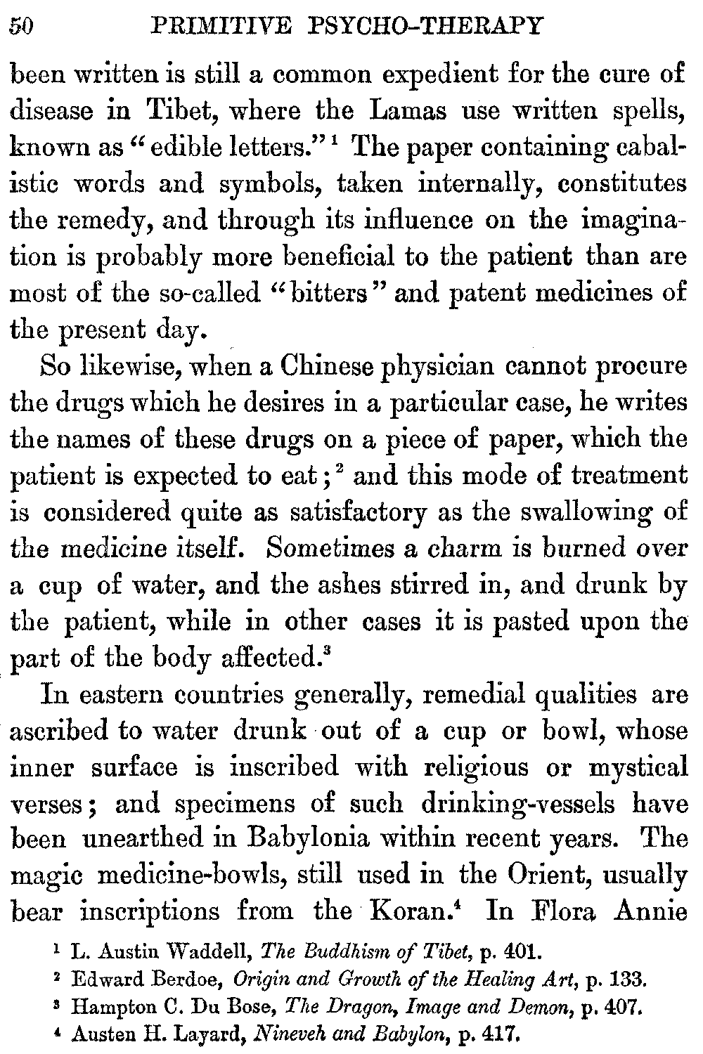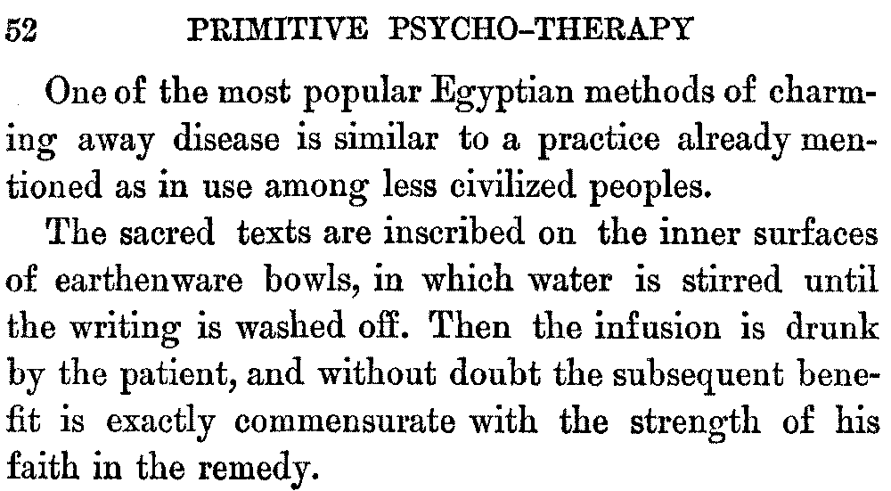 Magic writings have been and often are efficient psychic remedies for functional affections, in direct proportion to the user's faith in them. A certain sense of mystery seems essential. Given that, and plenty of confidence, and it matters not whether the inscriptions are biblical verses, unintelligible jargon, or even invocations of the Devil.