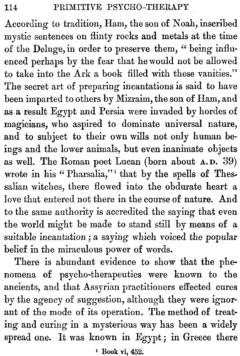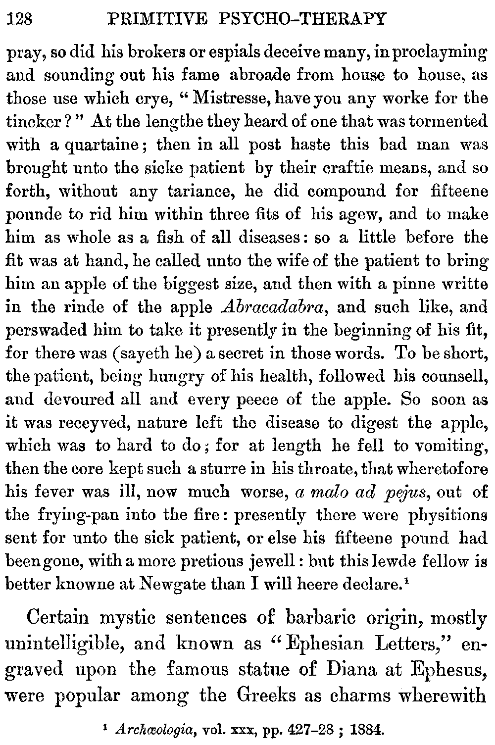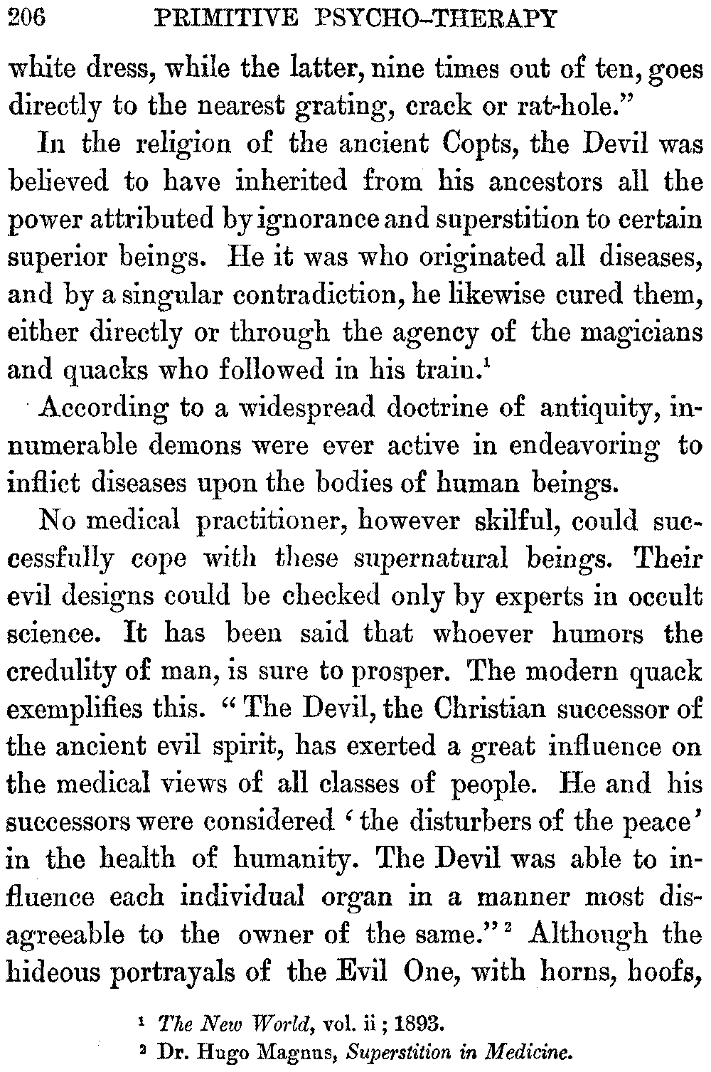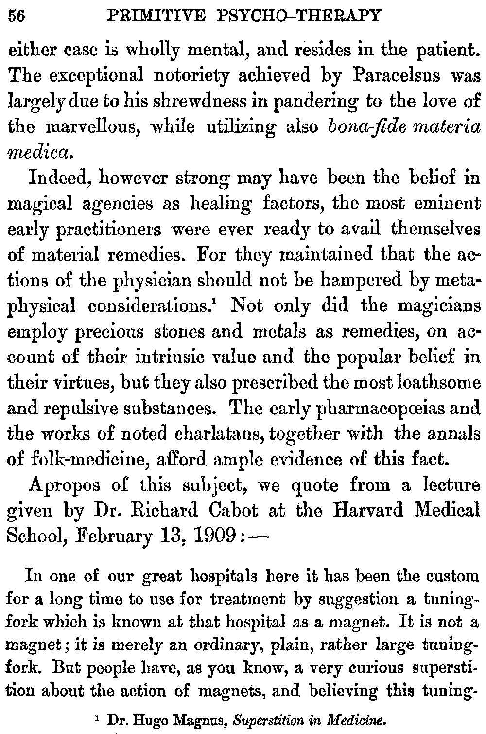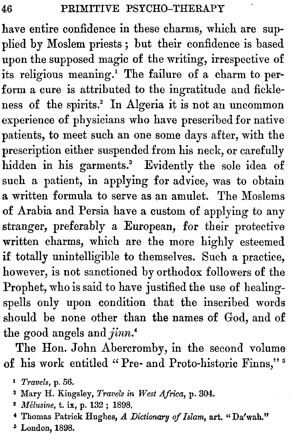 Magic writings have been and often are efficient psychic remedies for functional affections, in direct proportion to the user's faith in them. A certain sense of mystery seems essential. Given that, and plenty of confidence, and it matters not whether the inscriptions are biblical verses, unintelligible jargon, or even invocations of the Devil.