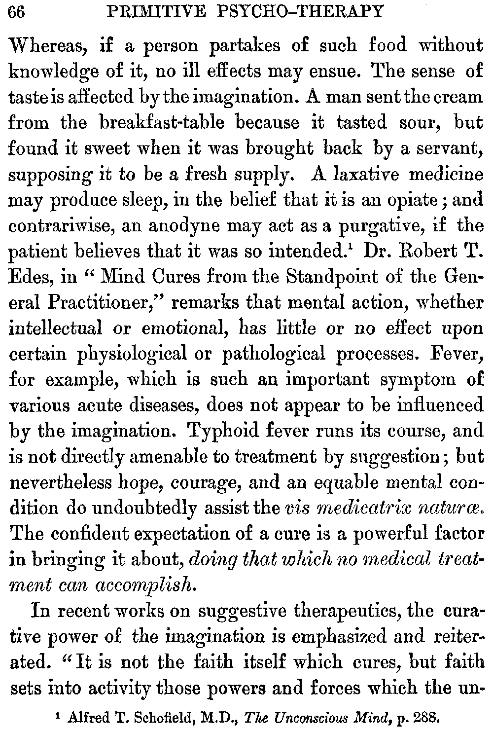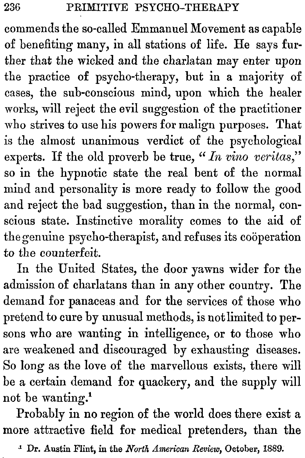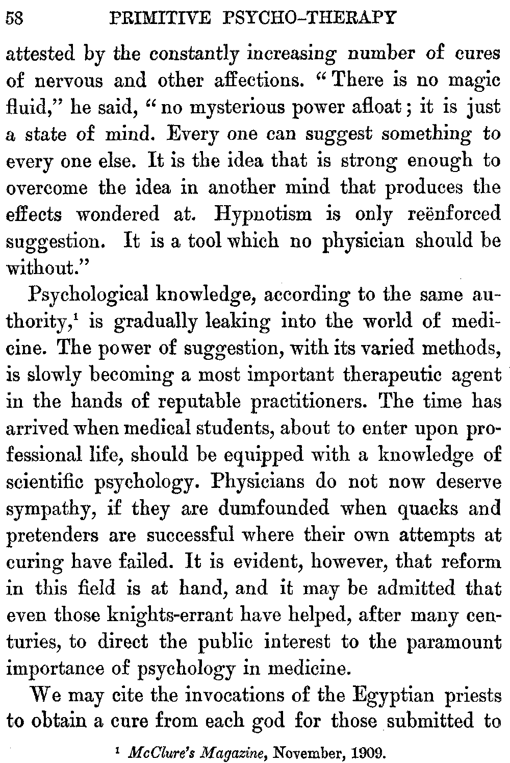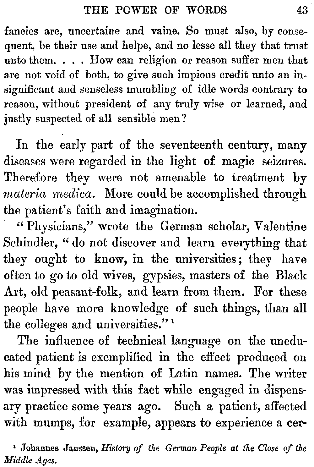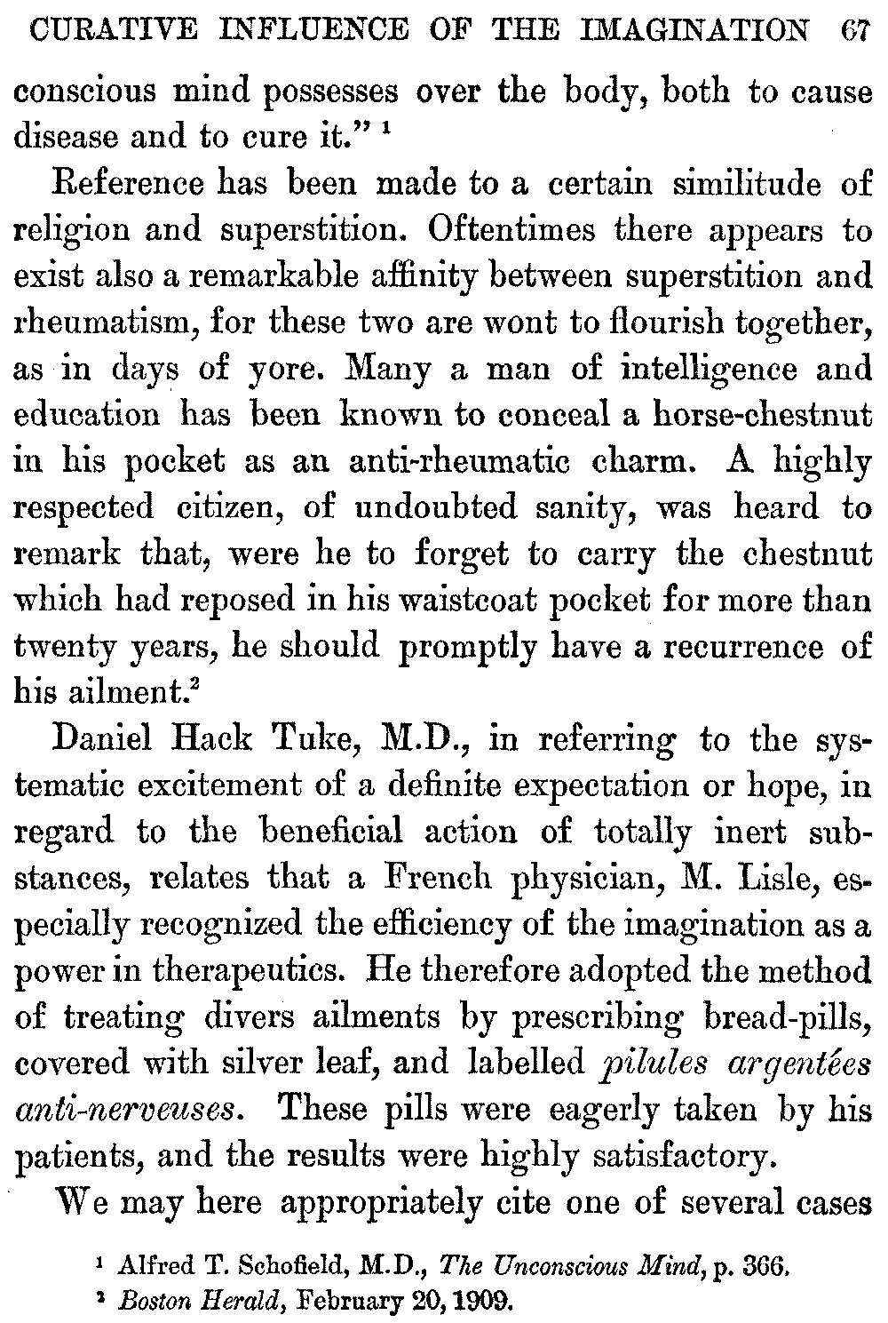 Magic writings have been and often are efficient psychic remedies for functional affections, in direct proportion to the user's faith in them. A certain sense of mystery seems essential. Given that, and plenty of confidence, and it matters not whether the inscriptions are biblical verses, unintelligible jargon, or even invocations of the Devil.