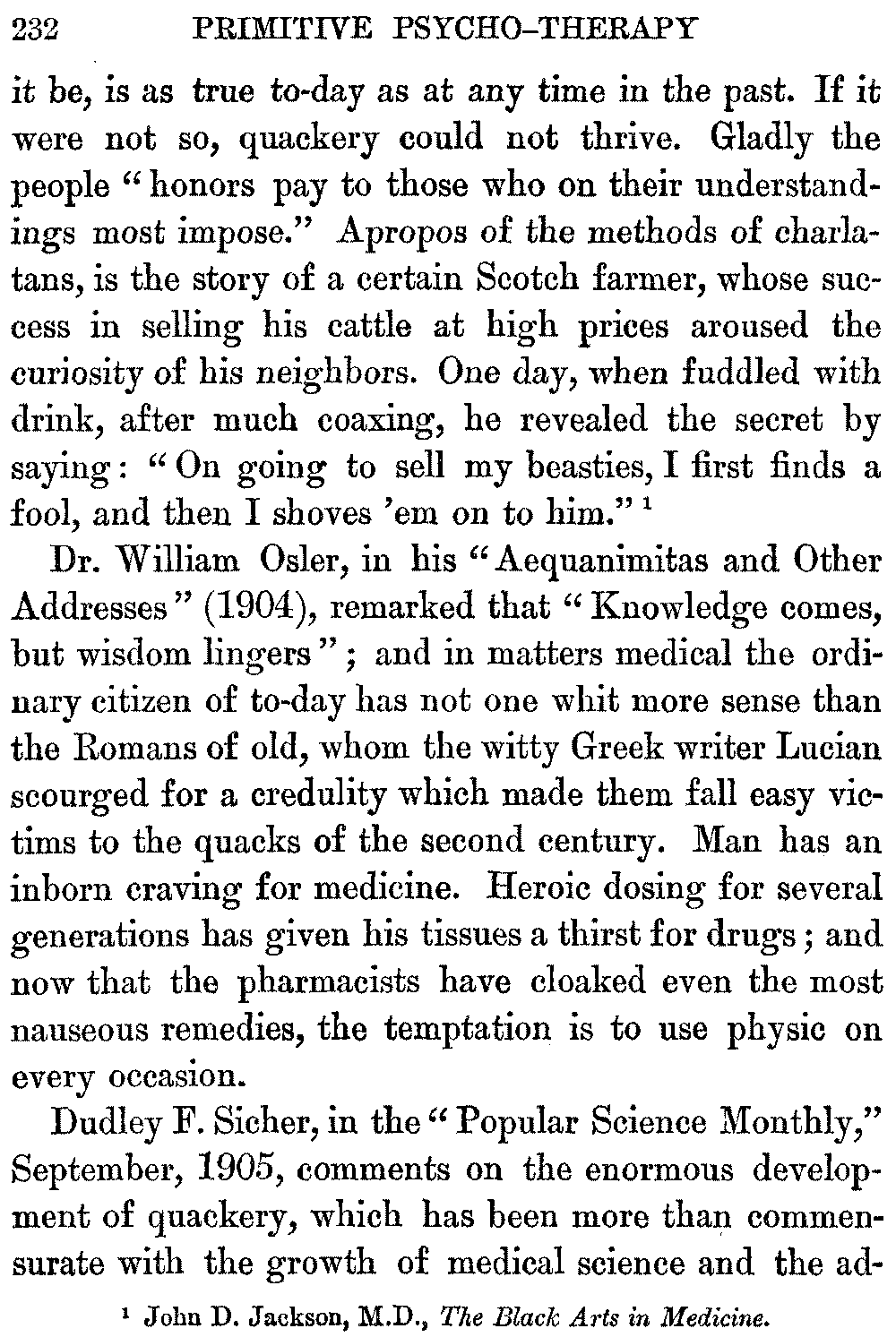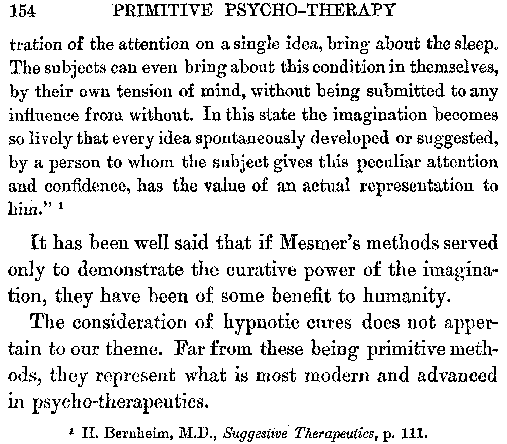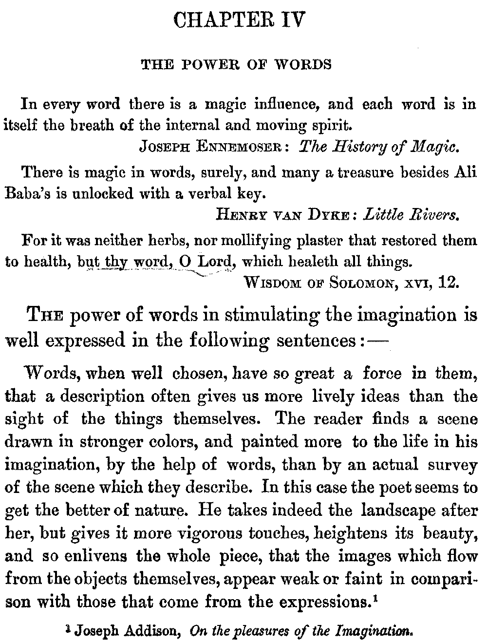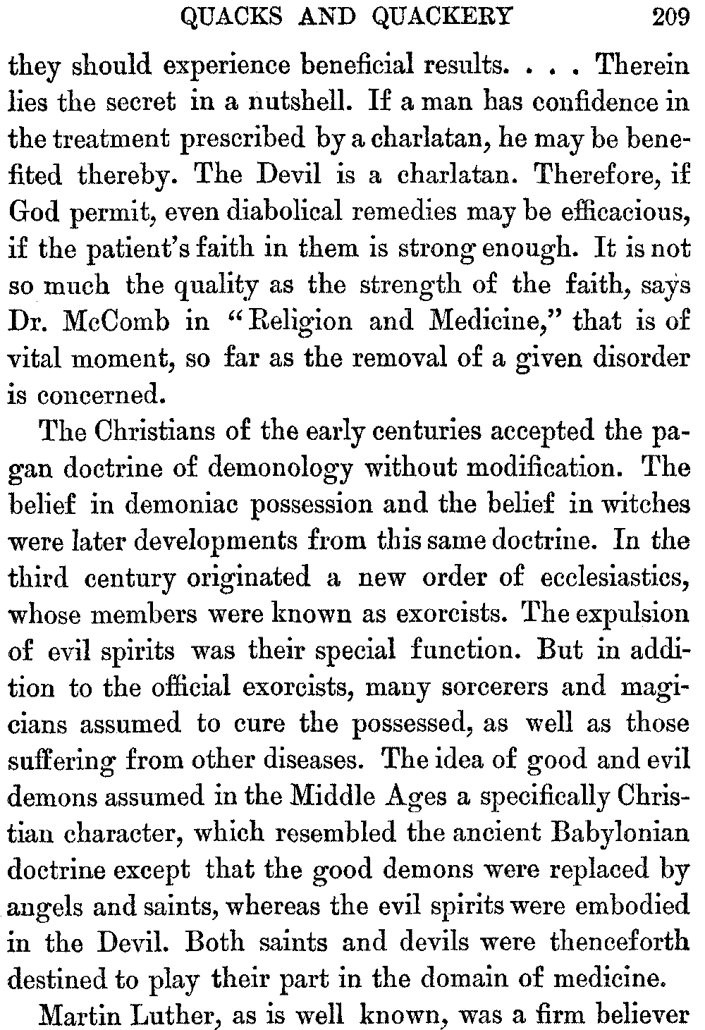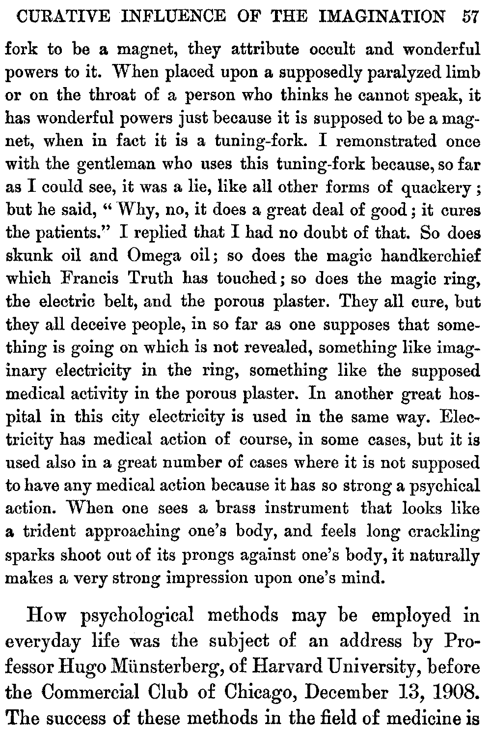 Magic writings have been and often are efficient psychic remedies for functional affections, in direct proportion to the user's faith in them. A certain sense of mystery seems essential. Given that, and plenty of confidence, and it matters not whether the inscriptions are biblical verses, unintelligible jargon, or even invocations of the Devil.