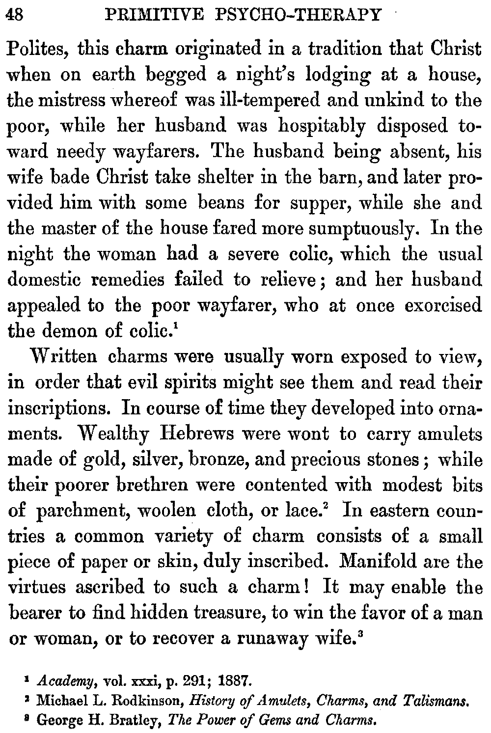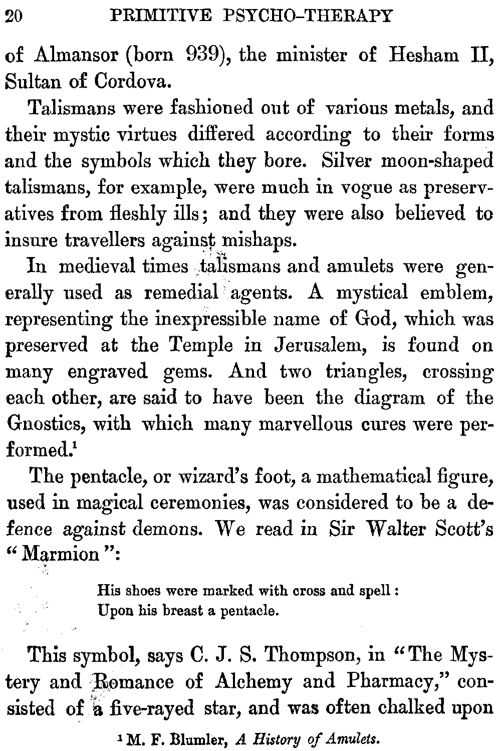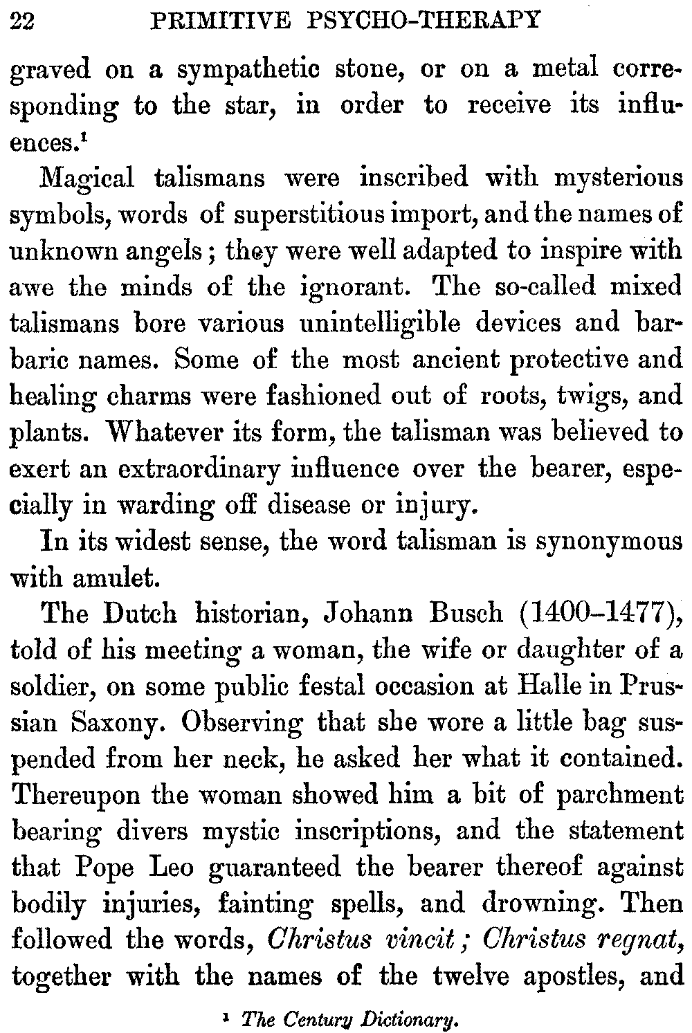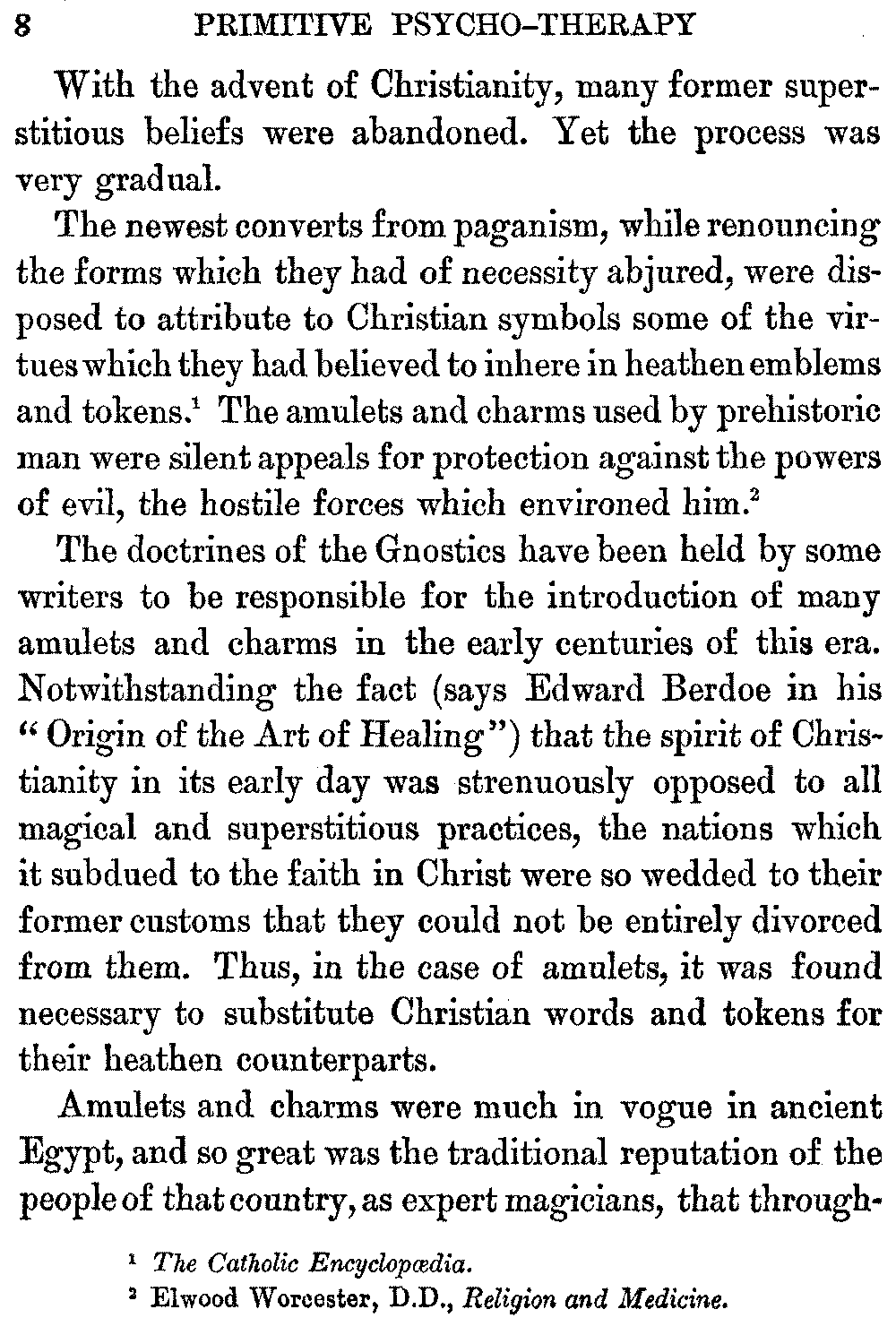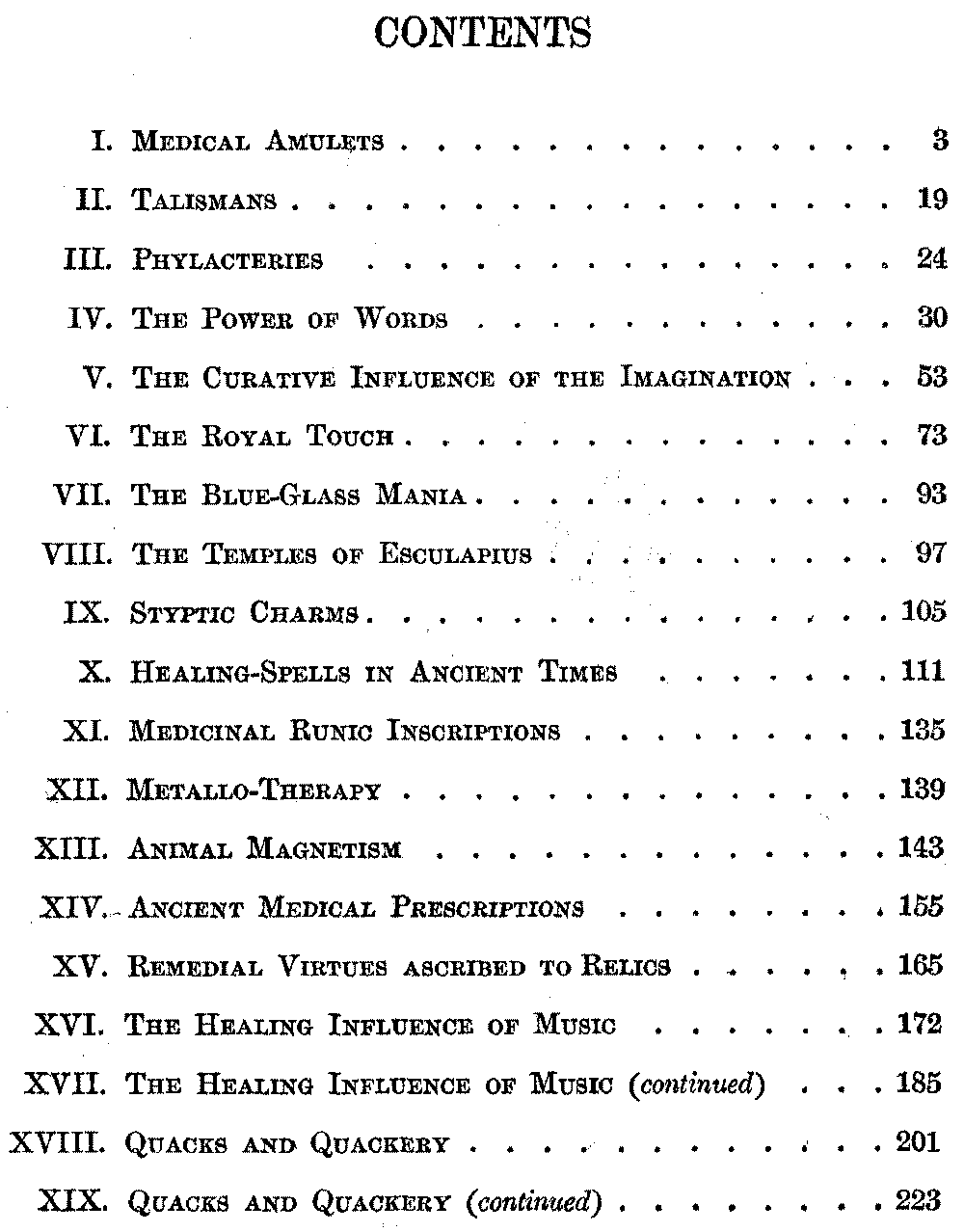 Certain historic modes of healing, including the use of medical amulets and charms, which have been regarded from early times as magical remedies, belong properly to the domain of Psychical Medicine. For the therapeutic virtues of medical amulets are not inherent in these objects, but are due to the influence exerted by them upon the imaginative faculties of the individuals who employ them. They afford powerful suggestions of healing. In this volume the writer has sought to emphasize the fact that the efficiency of many primitive therapeutic methods, and the success of charlatanry, are to be attributed to mental influence. The use of spells and incantations, the practice of laying-on of hands, the cult of relics, mesmerism, and metallo-therapy, have been important factors in the evolution of modern mental healing. The method of their operation, a mystery for ages, is revealed by the word suggestion. Thus may be traced some of the steps in the development of psycho-therapy. One ruling force, [viii]namely, the power of the imagination, has always been the potent therapeutic agent, whether in the word of command, in medical scripts, or in the methods of quackery.