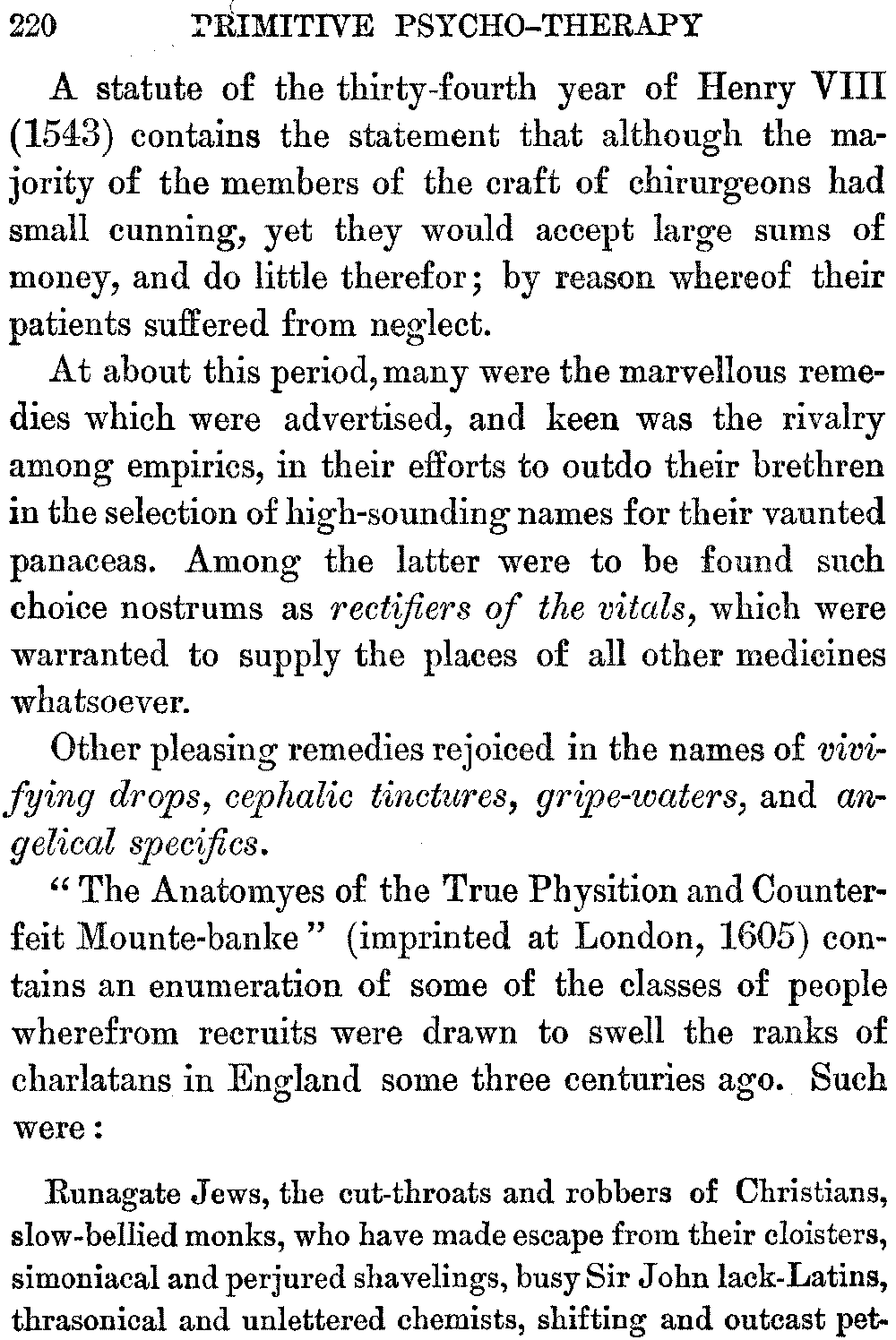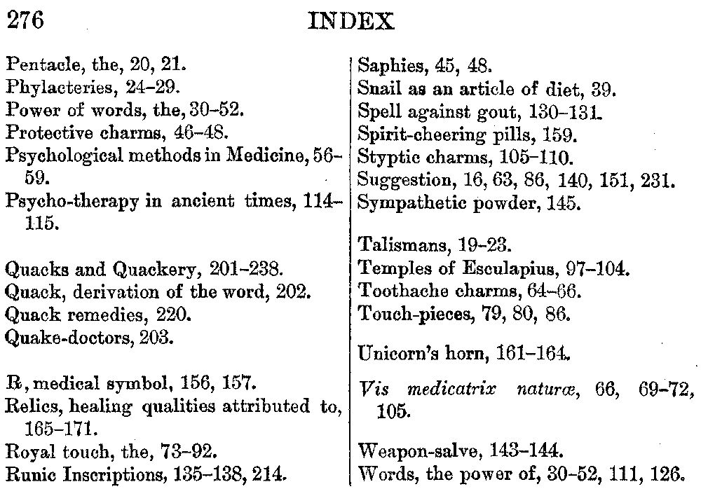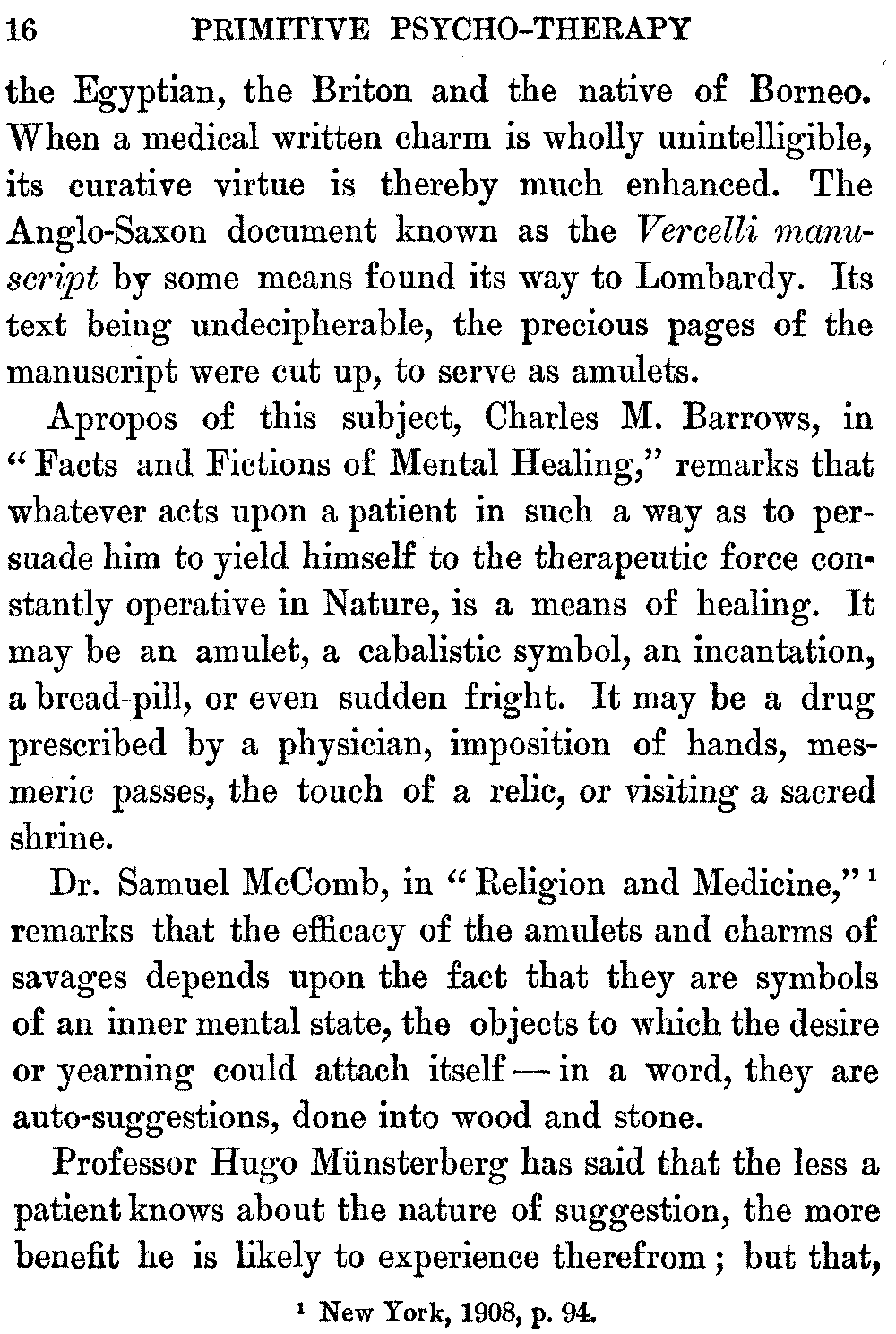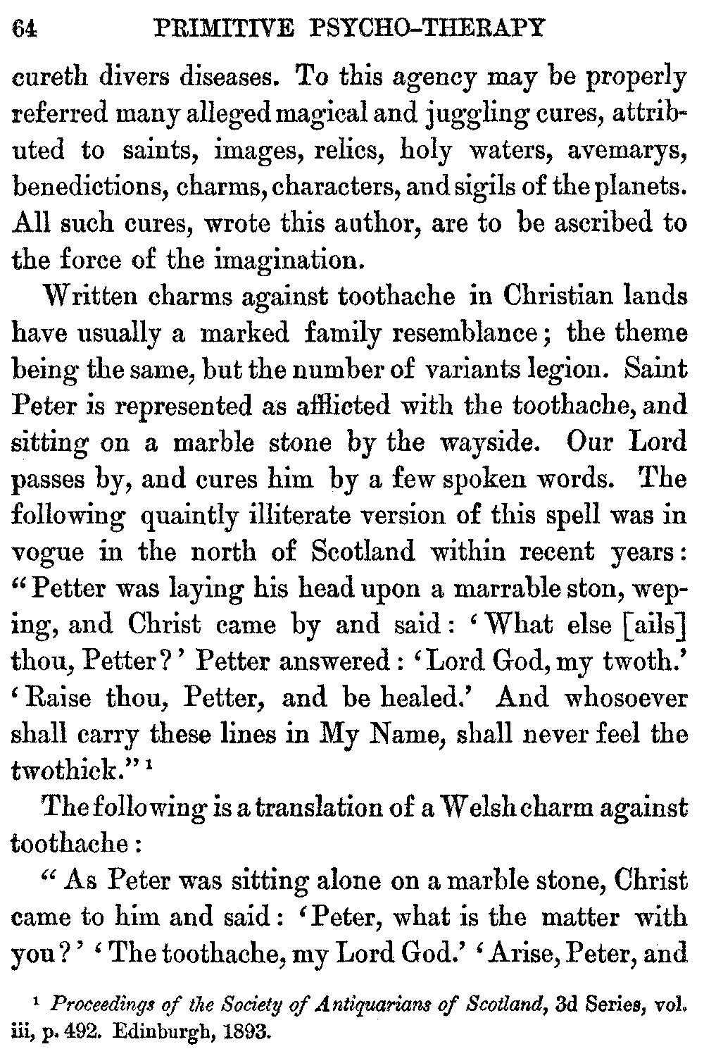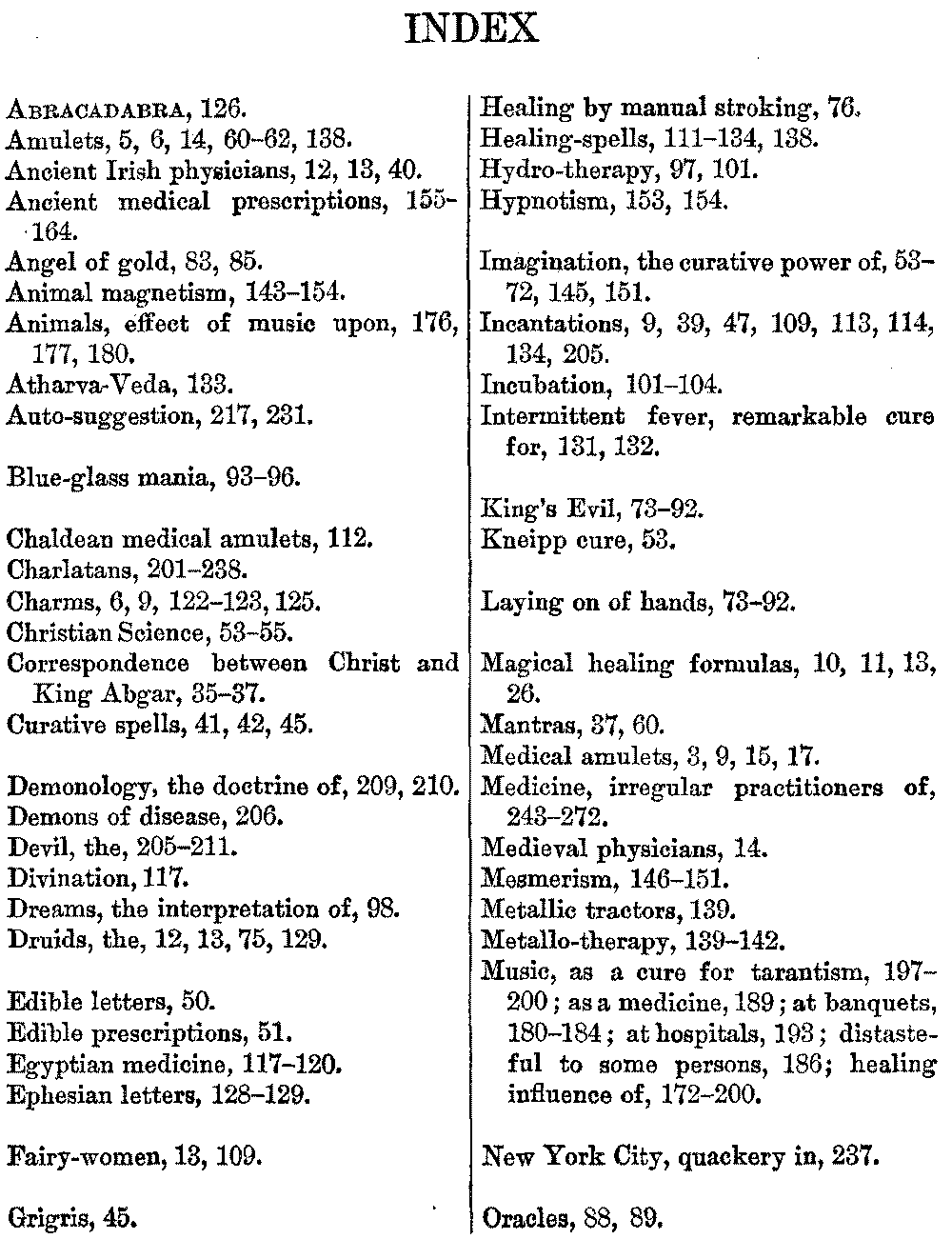 Certain historic modes of healing, including the use of medical amulets and charms, which have been regarded from early times as magical remedies, belong properly to the domain of Psychical Medicine. For the therapeutic virtues of medical amulets are not inherent in these objects, but are due to the influence exerted by them upon the imaginative faculties of the individuals who employ them. They afford powerful suggestions of healing. In this volume the writer has sought to emphasize the fact that the efficiency of many primitive therapeutic methods, and the success of charlatanry, are to be attributed to mental influence. The use of spells and incantations, the practice of laying-on of hands, the cult of relics, mesmerism, and metallo-therapy, have been important factors in the evolution of modern mental healing. The method of their operation, a mystery for ages, is revealed by the word suggestion. Thus may be traced some of the steps in the development of psycho-therapy. One ruling force, [viii]namely, the power of the imagination, has always been the potent therapeutic agent, whether in the word of command, in medical scripts, or in the methods of quackery.